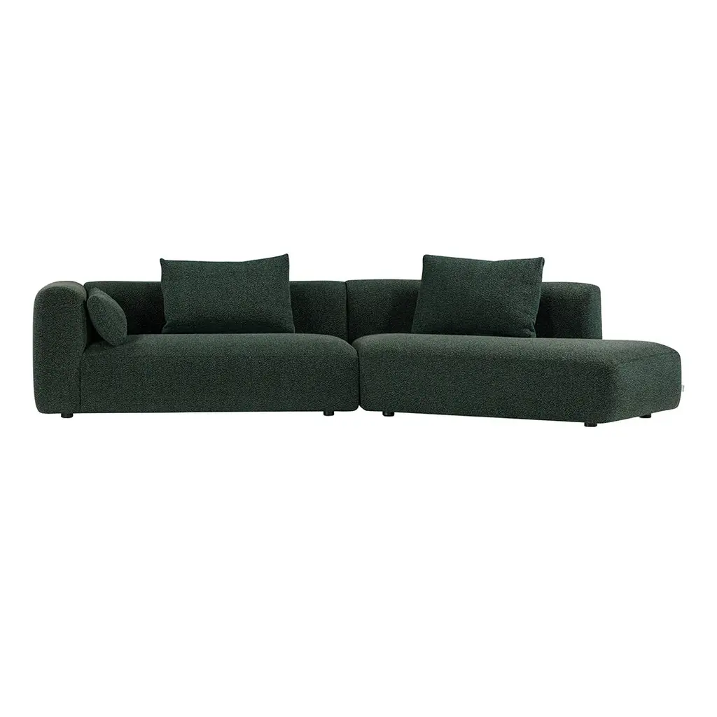 The Boketto Pre-Configured Sofa - Setup 5, designed by Lars Wendelbo for Wendelbo, embodies the Japanese concept of "boketto" – the art of peaceful reflection and non-doing. This thoughtfully proportioned sectional transforms lounging into a meditative experience through its perfectly balanced design and exceptional comfort. Distinguished by gently rounded rectangles and clean architectural lines, the Boketto's sculptural silhouette creates a visual harmony that anchors contemporary living spaces. The modular design of Setup 5 features a spacious chaise configuration that invites full-body relaxation while maintaining an elegant, streamlined profile that appears to float above its discreet legs. Wendelbo's three generations of upholstery expertise are evident in every detail – from the precisely tailored seams to the plush, supportive cushioning that retains its form through years of daily use. The sofa's substantial proportions provide ample space for family gatherings, while its carefully considered scale prevents it from overwhelming the room. Choose between the curated designer selections of Zest (warm gray) or Spectrum (deep forest green), or personalize your Boketto from hundreds of premium upholstery options to complement your interior palette. Each fabric option has been selected to highlight the sofa's sculptural form while providing exceptional durability for everyday living. The Boketto exemplifies Wendelbo's signature balance of Scandinavian craftsmanship and contemporary design sensibility – creating a centerpiece that elevates your living space without sacrificing the comfort that makes a house feel like home. Setup Includes: [1] Module 5 - Two-seater side left [1] Module 18 - Angled chaise lounge side right *Throw pillows sold separately