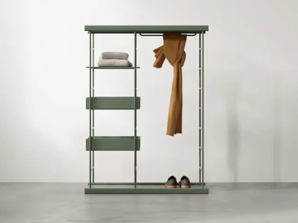 Small open closet from the Bost collection in Moss Green lacquer.Composition in photo:V143-Cabinet-3 110 x 150 x 43 structure: Moss GreenBase and top shelf: Moss Greenshelf1: Moss Greenshelf2: Moss Greenshelf3: Moss GreenCA44-Open container 48 x 10 x 43chest: Moss GreenFor more finishes, please contact the contact center.Simplicity, innovation and originality. Without extravagance. This is the philosophy of Yonoh, the creative study that has created the new modular shelf Bost for Treku. The result is a product that harmonizes wood and metal organically and work in different spaces in the home or in the work place.“Bost arose from a formal idea: how to make a simple model that combines wood and metal in a function way, sober, but with our most organic essence.” (Yonoh)