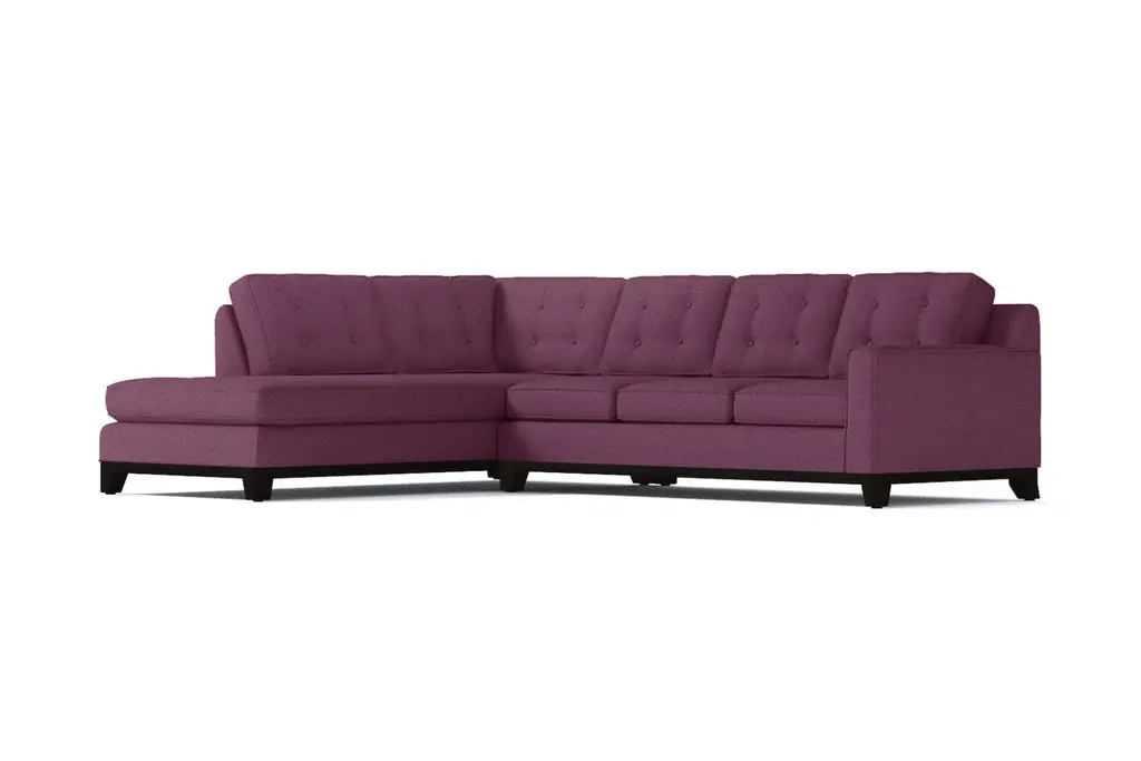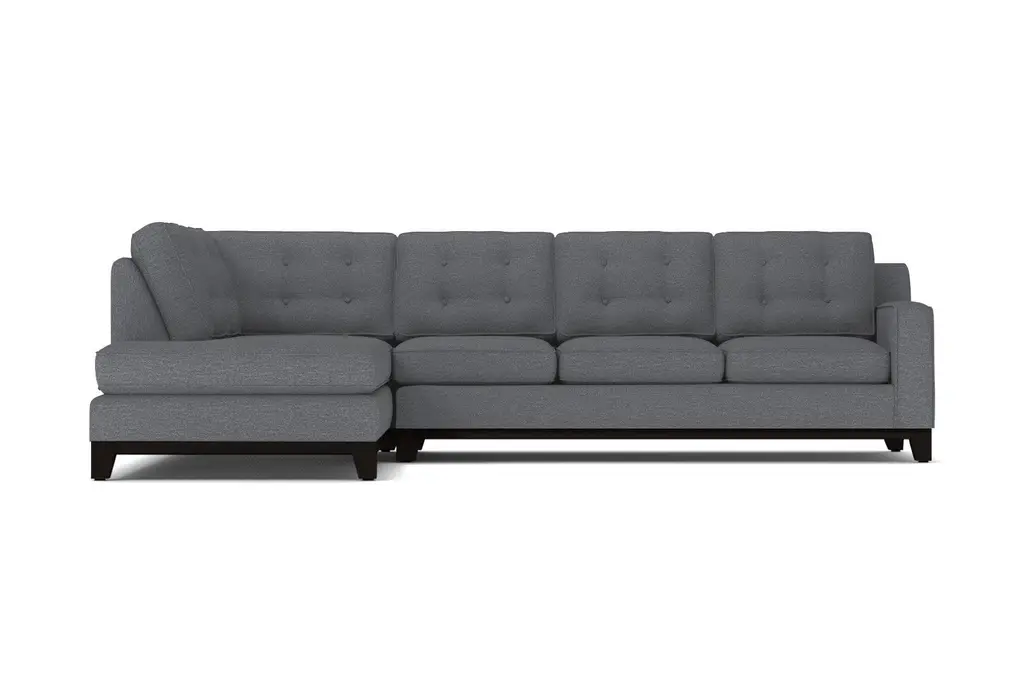 If you're in the market for a two-piece sectional, the Brentwood is too good to pass up. It features elegant button-tufted back cushions, thick arms and a dark base with tapered legs, adding to the modern vibe. The sofa features piping around the cushions and the base for added dimension. The Brentwood is available in your choice of colors and fabrics, anything from resilient and easy-to-clean poly blends to elegant upholstery with high piles for exceptional body. Not sure which fabric or color to choose? No problem. Let us know and we'll send you a few swatches to help you decide. The Brentwood is made right here in the United States. Apt2B offers a limited lifetime warranty.