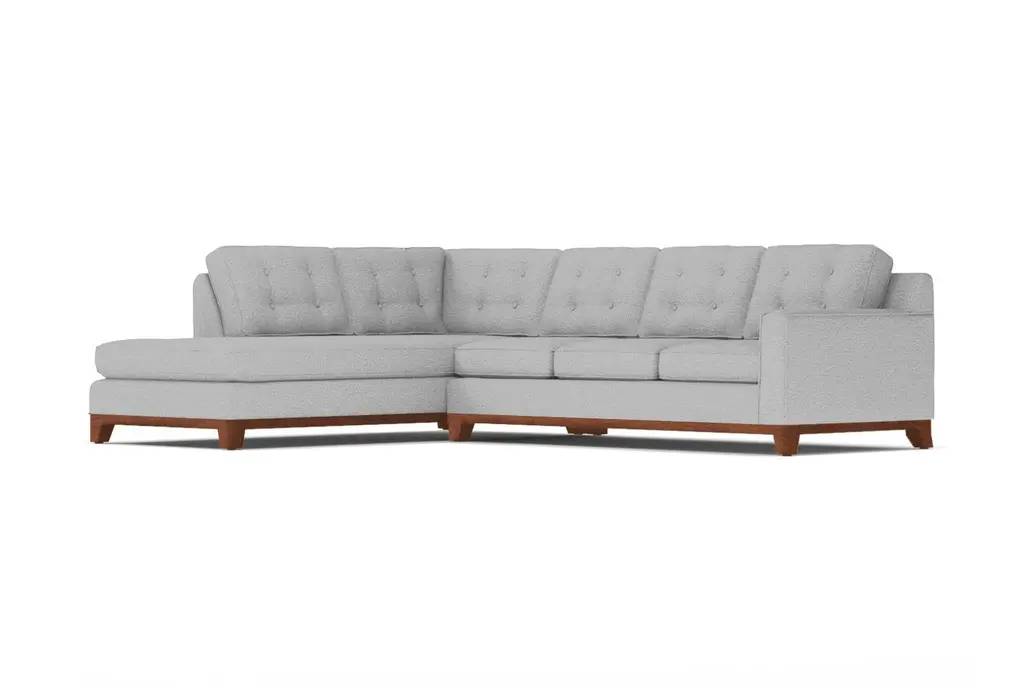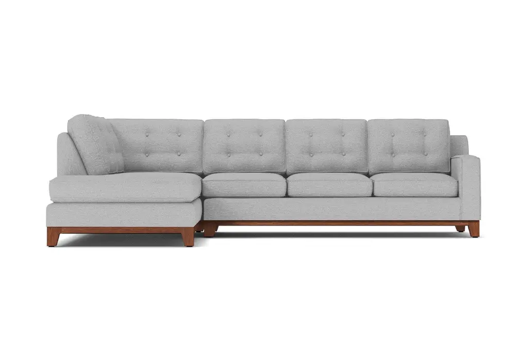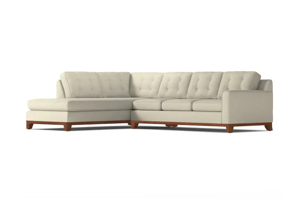 If you're in the market for a two-piece sectional, the Brentwood is too good to pass up. It features elegant button-tufted back cushions, thick arms and a dark base with tapered legs, adding to the modern vibe. The sofa features piping around the cushions and the base for added dimension. The Brentwood is available in your choice of colors and fabrics, anything from resilient and easy-to-clean poly blends to elegant upholstery with high piles for exceptional body. Not sure which fabric or color to choose? No problem. Let us know and we'll send you a few swatches to help you decide. The Brentwood is made right here in the United States. Apt2B offers a limited lifetime warranty.