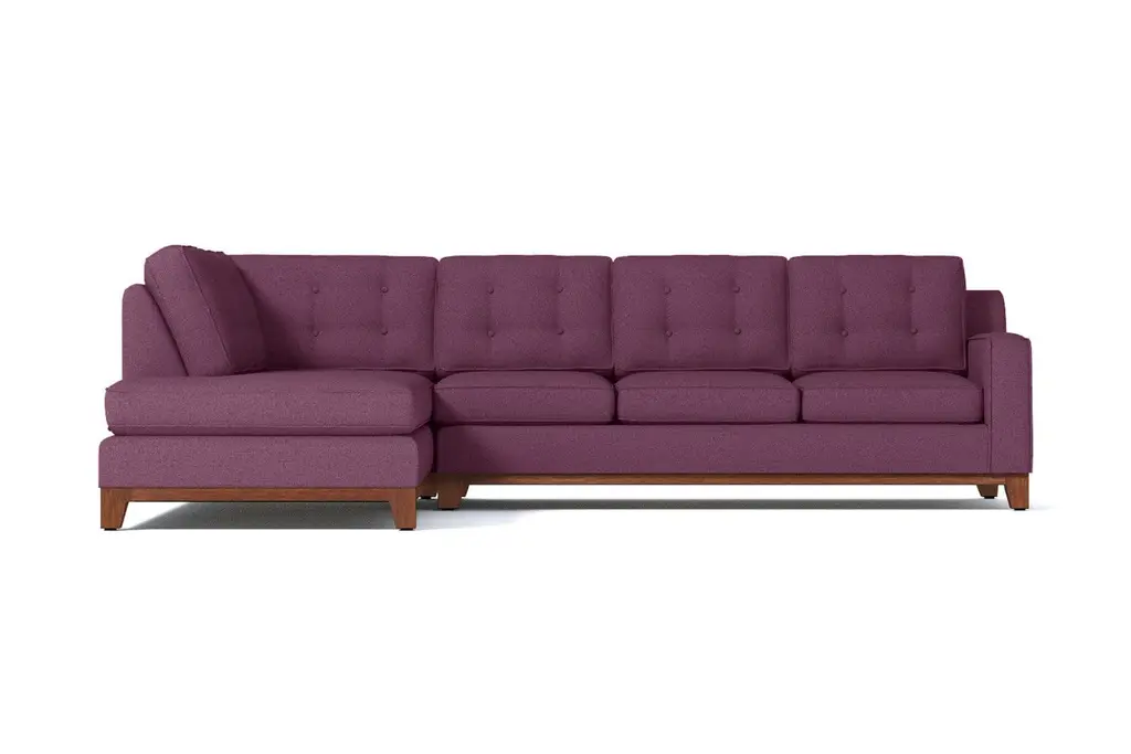 If you're in the market for a two-piece sectional, the Brentwood is too good to pass up. It features elegant button-tufted back cushions, thick arms and a dark base with tapered legs, adding to the modern vibe. The sofa features piping around the cushions and the base for added dimension. The Brentwood is available in your choice of colors and fabrics, anything from resilient and easy-to-clean poly blends to elegant upholstery with high piles for exceptional body. Not sure which fabric or color to choose? No problem. Let us know and we'll send you a few swatches to help you decide. The Brentwood is made right here in the United States. Apt2B offers a limited lifetime warranty.