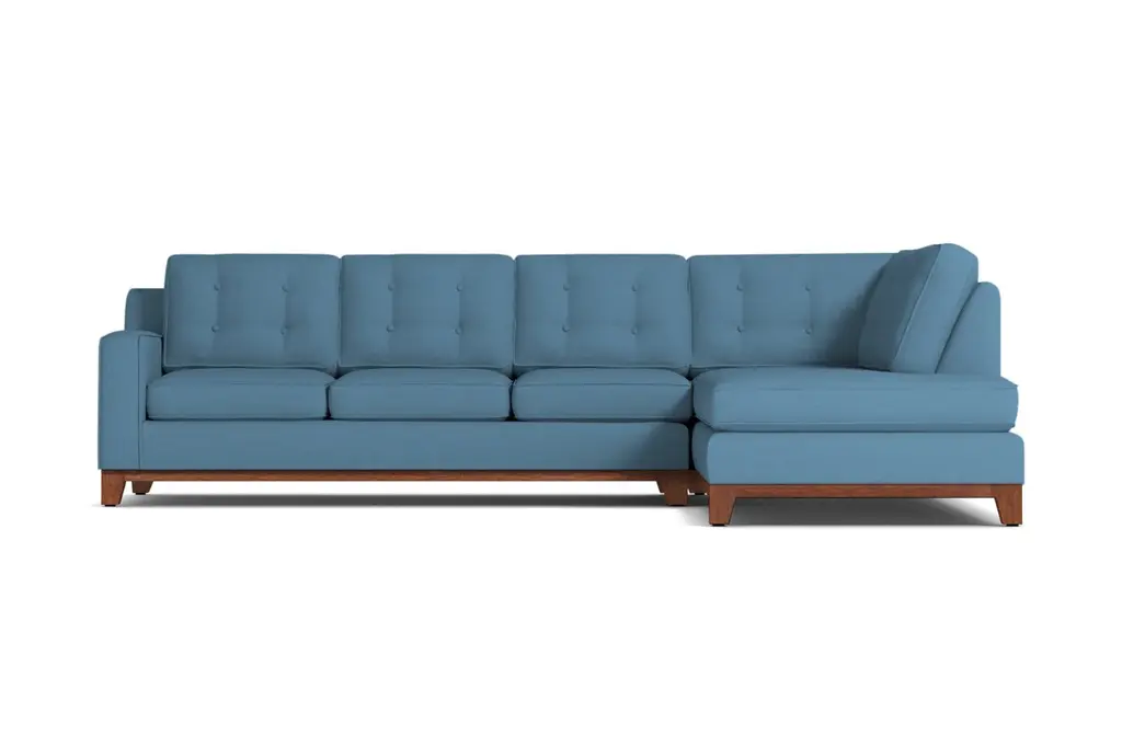 If you're in the market for a two-piece sectional, the Brentwood is too good to pass up. It features elegant button-tufted back cushions, thick arms and a dark base with tapered legs, adding to the modern vibe. The sofa features piping around the cushions and the base for added dimension. The Brentwood is available in your choice of colors and fabrics, anything from resilient and easy-to-clean poly blends to elegant upholstery with high piles for exceptional body. Not sure which fabric or color to choose? No problem. Let us know and we'll send you a few swatches to help you decide. The Brentwood is made right here in the United States. Apt2B offers a limited lifetime warranty.