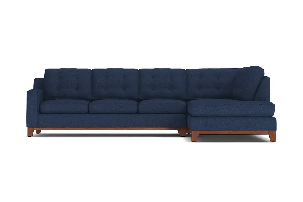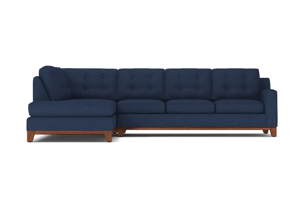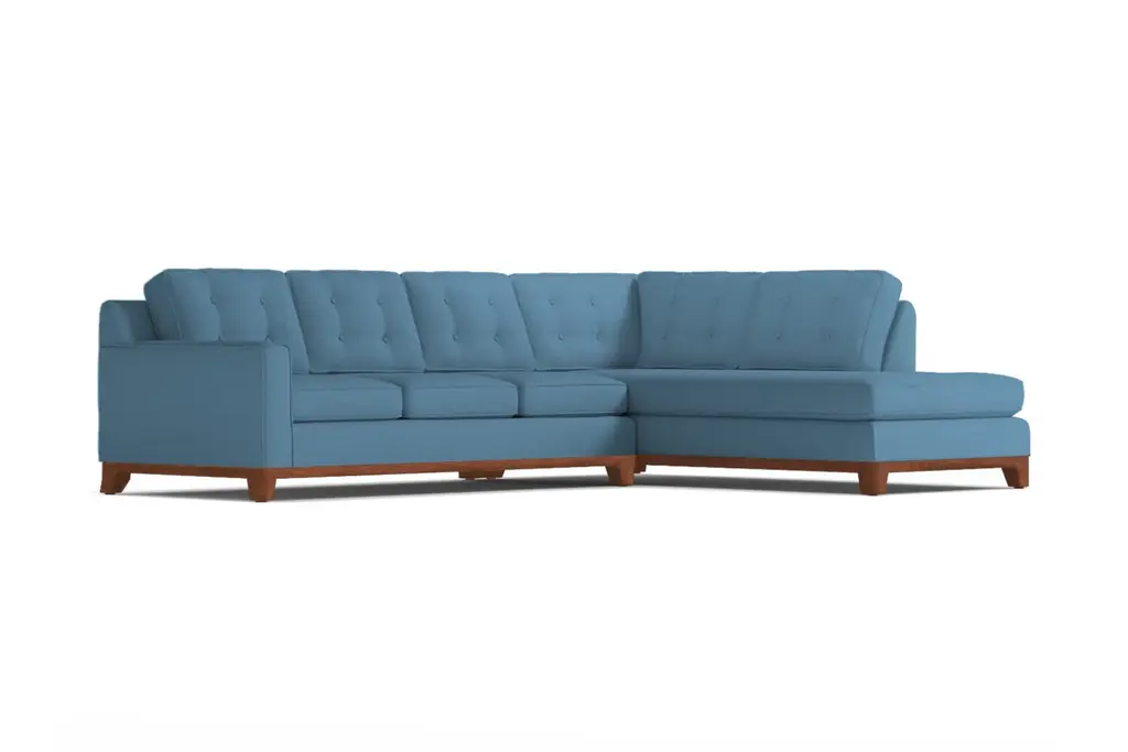 If you're in the market for a two-piece sectional, the Brentwood is too good to pass up. It features elegant button-tufted back cushions, thick arms and a dark base with tapered legs, adding to the modern vibe. The sofa features piping around the cushions and the base for added dimension. The Brentwood is available in your choice of colors and fabrics, anything from resilient and easy-to-clean poly blends to elegant upholstery with high piles for exceptional body. Not sure which fabric or color to choose? No problem. Let us know and we'll send you a few swatches to help you decide. The Brentwood is made right here in the United States. Apt2B offers a limited lifetime warranty.