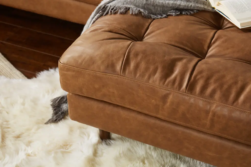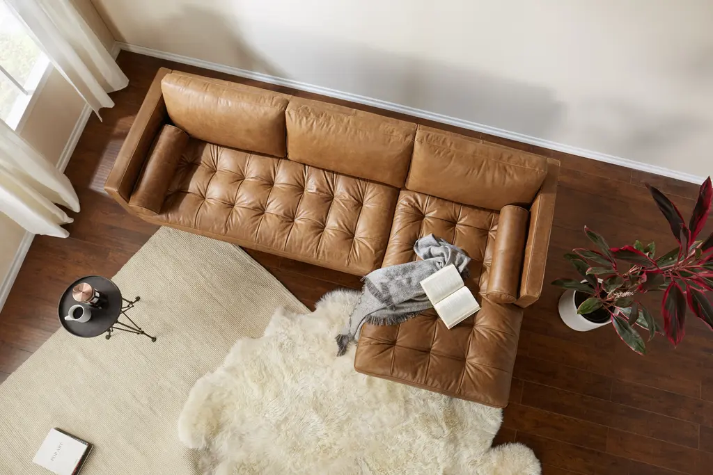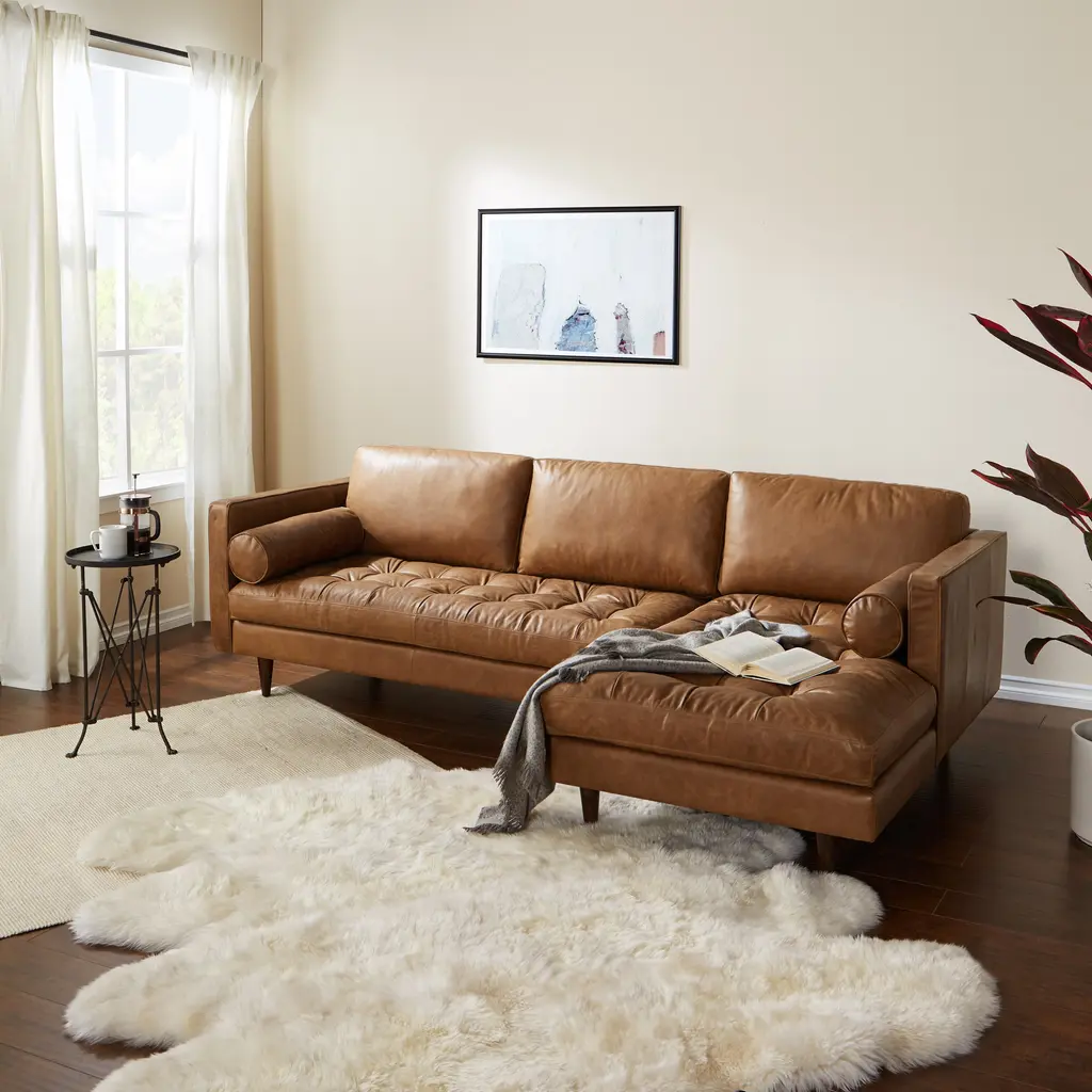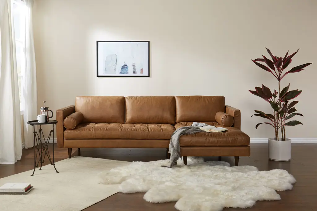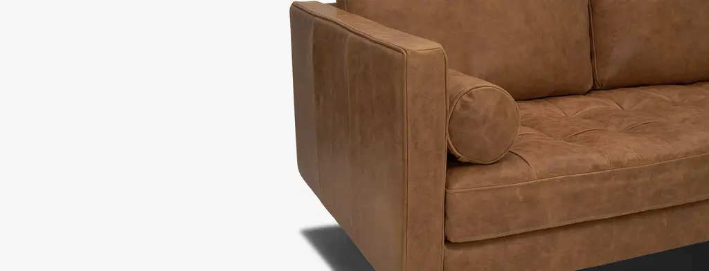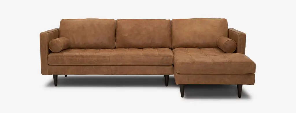 Blending supportive cushioning with Mid-Century style, the Briar Leather Sectional invites you to kick back and relax in chic sophistication. With a classic design fit for lounging, the Briar offers a mix of elegance and comfort through its tufted seating, dual bolster pillows, and top-grain leather.