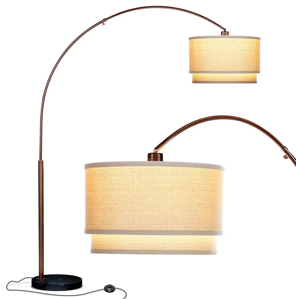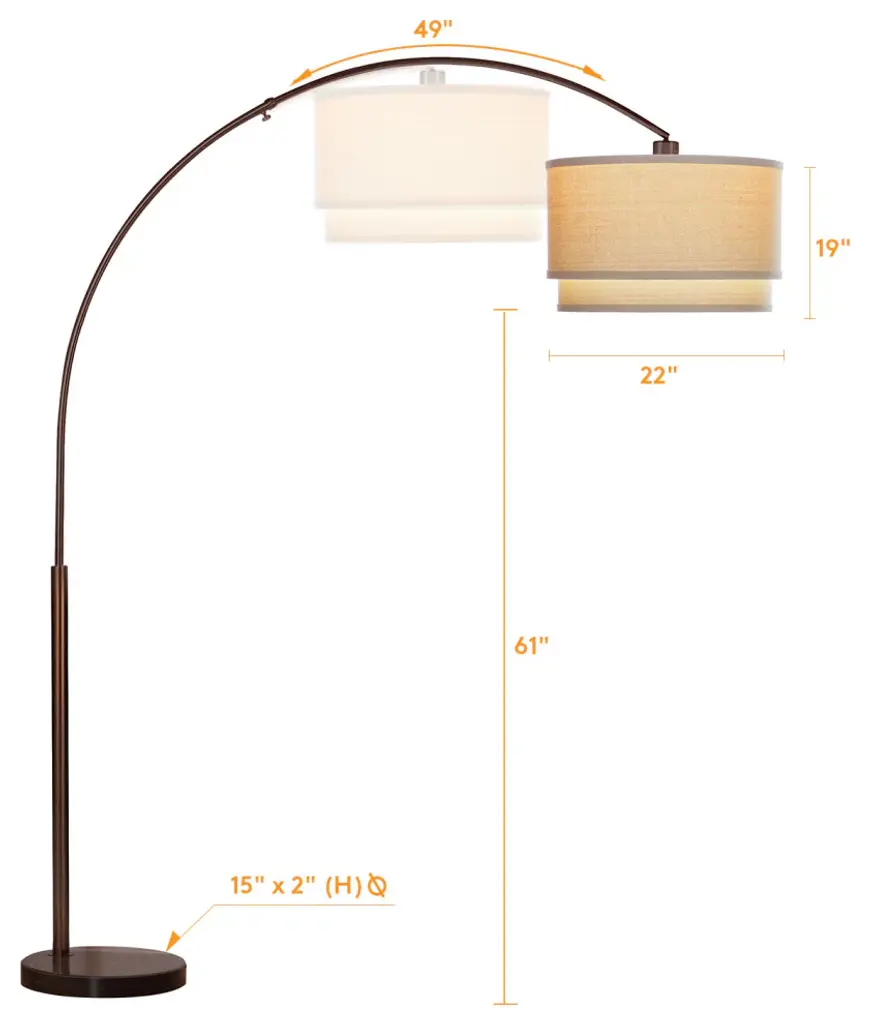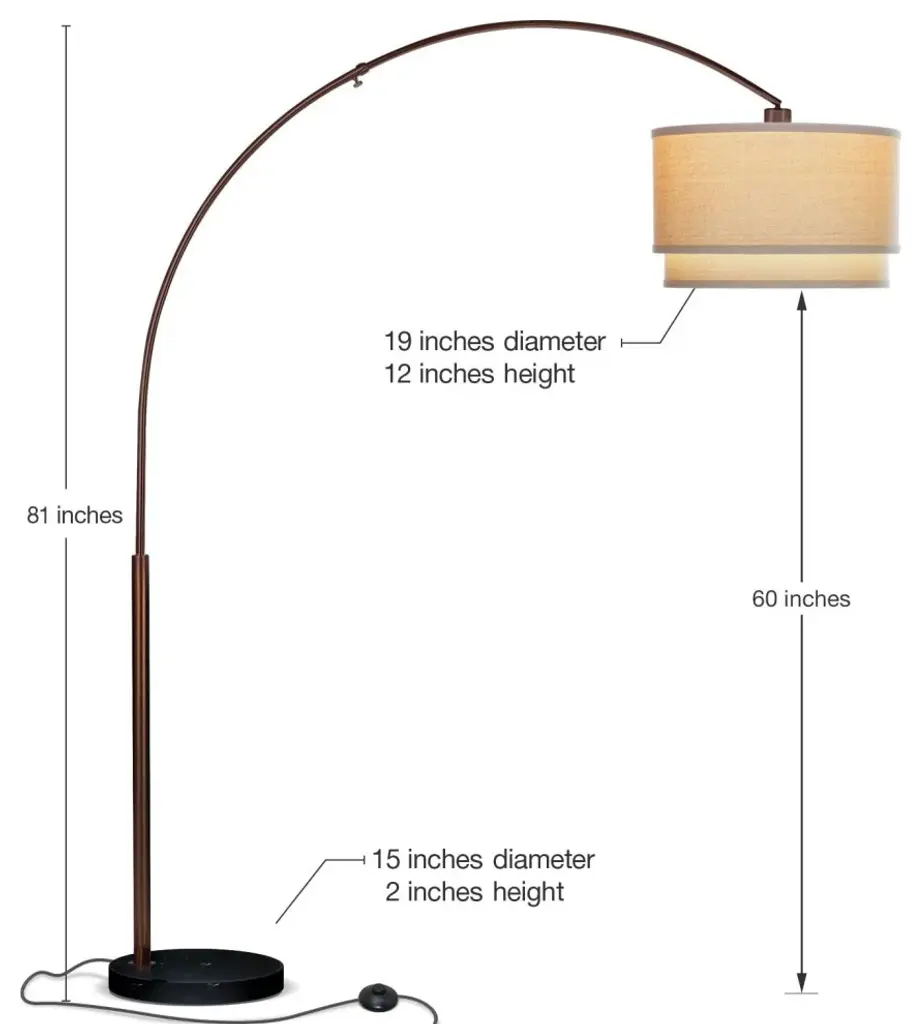 ELEGANT, COMPLIMENT-GETTING MODERN ARCH LAMP SUITS RANGE OF DECOR STYLES - Stand up the Brightech Mason lamp in the corner to over hang your sofa, or place it more prominently to display the gorgeous marble base. Wherever you place it, this tall, large lamp is versatile, matching decor including mid century modern and traditional to contemporary or even industrial looks.STABLE, BESIDE THE SOFA ARCHED READING LIGHT FOR LIVING ROOMS: This is a great lamp to stand up over the living or family room sectional. The low 1.5" marble base slides easily under your couch, and you can telescope the adjustable arc up to 44 in from the pole. Enjoy overhead light for reading, knitting, and other hobbies. The 15" diameter heavy base also makes it wobble-free, ie safe around kids and pets. The tall max height of 81 in fills space in rooms with high ceilings.ALEXA & GOOGLE HOME ASSISTANT COMPATIBLE LIGHT WITH UNIQUE HANGING DRUM SHADE: Works with smart outlets that are Alexa, Google Home Assistant, or Apple HomeKit enabled, to turn on/off. (Requires smart outlet sold separately.) Its unique double cylindrical lamp shade measures 19 inches in diameter and 22 inches in height. It sits beautifully atop a stainless steel pole with a hefty marble base. The shade is open at top and bottom, providing both uplight and downlight effects.20,000 HOUR LIFE, ENERGY SAVING BRIGHT LED BULB INCLUDED: The Brightech Mason indoor pole lamp includes a 9.5 Watt, 800 lumen power saving LED bulb so that you will never have to replace a bulb. It"™s 3,000K warm white light is pleasant, and because it''s LED it outlasts energy burning halogen or incandescent bulbs. Save money and energy with the Mason. Note: Bulb not dimmable.BRIGHTECH''S 3 YEAR PRODUCT WARRANTY: We proudly stand behind all of our products 100%, which is why we offer a full 3 year warranty. If for any reason you are not satisfied with your purchase, please contact us because our number one goal is customer satisfaction and we are committed to making it right for you. Applies to products bought from Brightech (not just Brightech branded) in new condition.