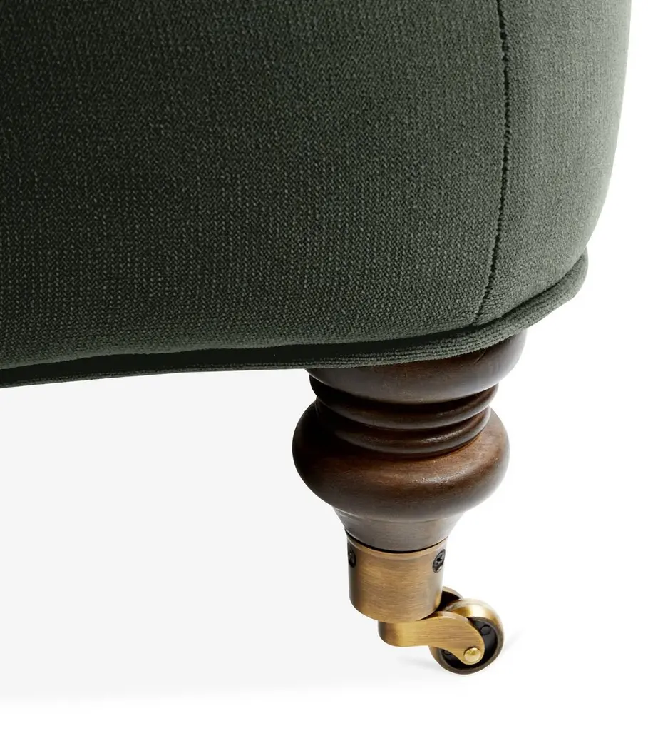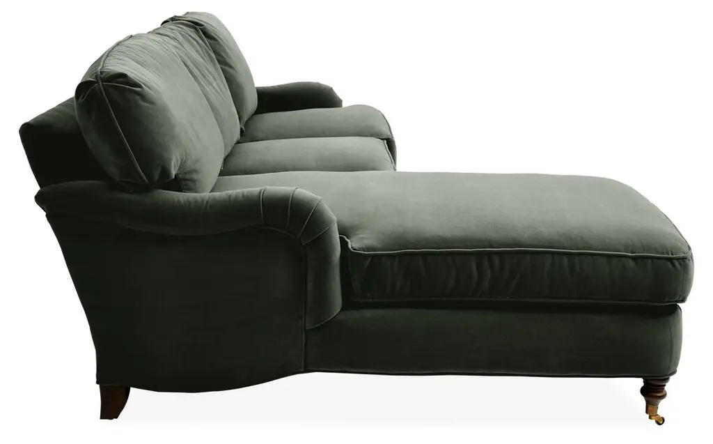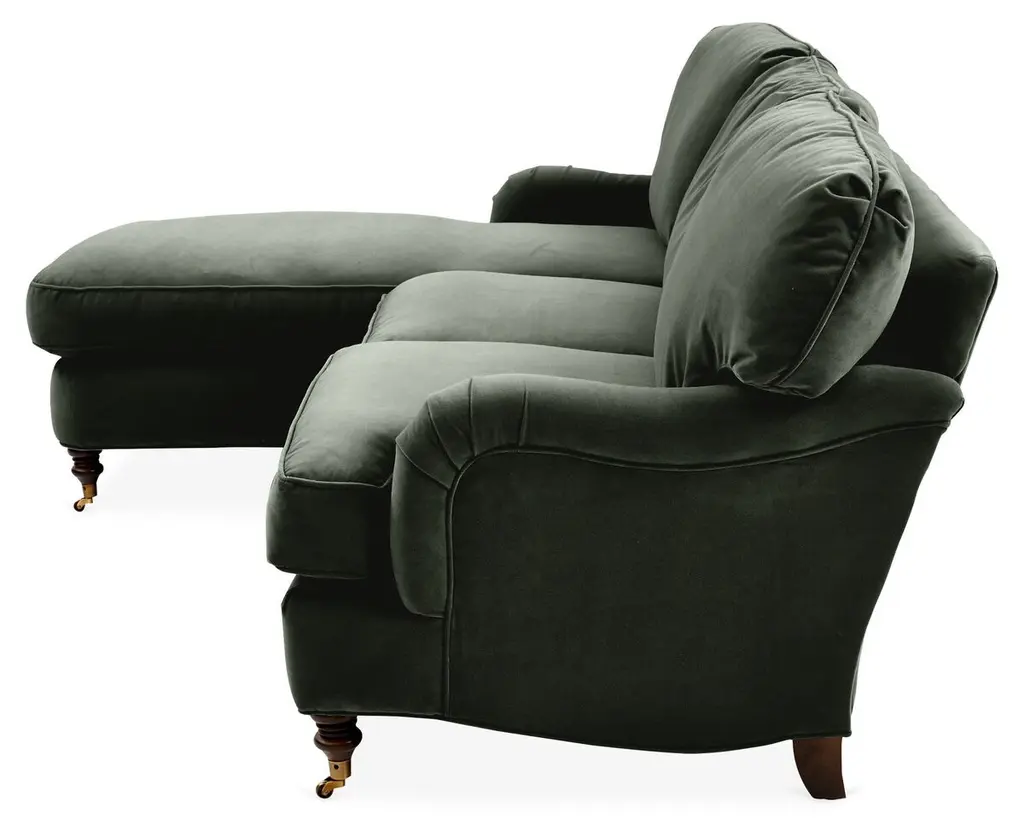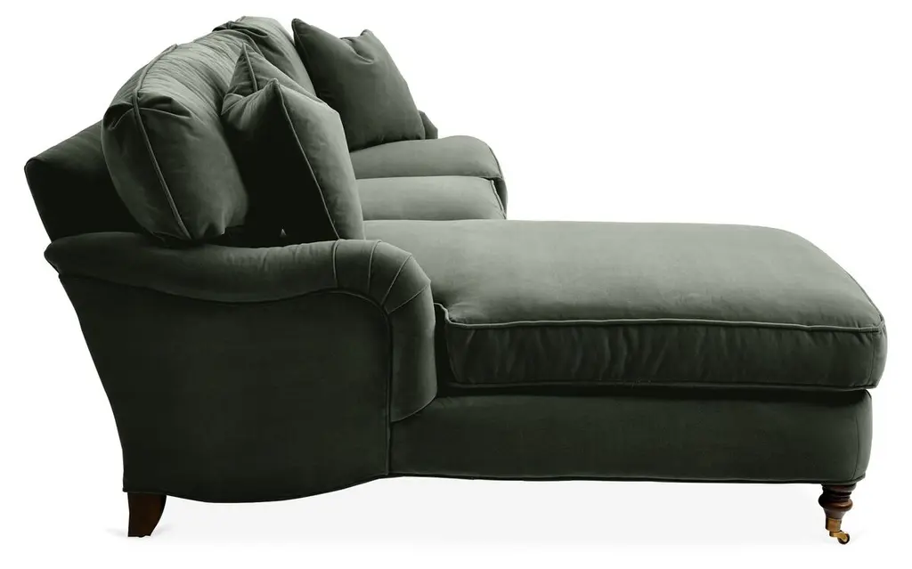 Available only at One Kings Lane: Framed in kiln-dried hardwood, this English-arm sectional is made elegant and inviting with a relaxed silhouette, neatly tailored upholstery, and generous down-and-feather fill. Its finely turned front legs are capped with brass casters for easy mobility and scratch-free surface protection.