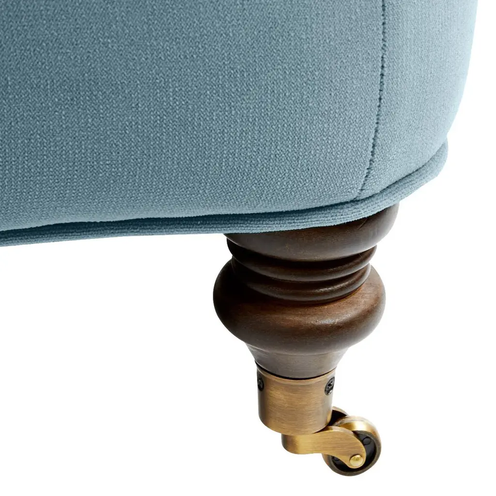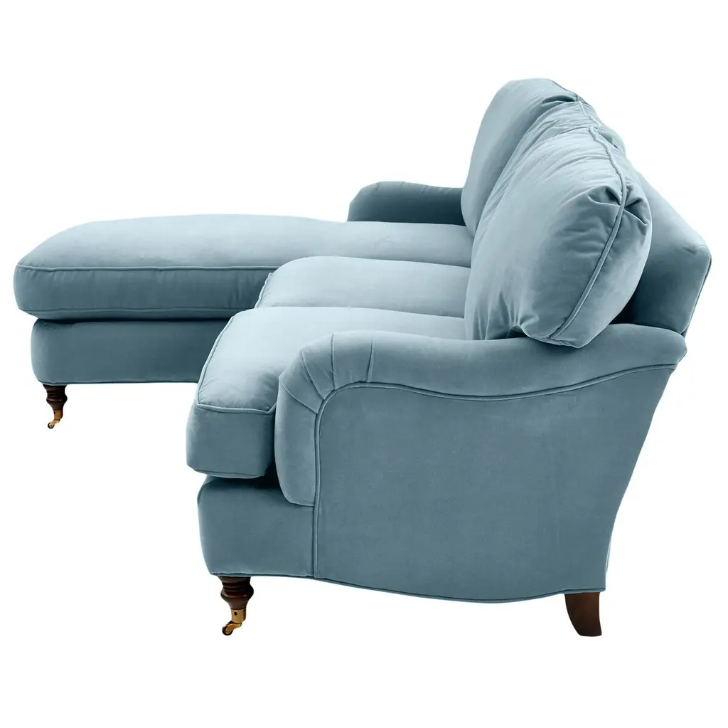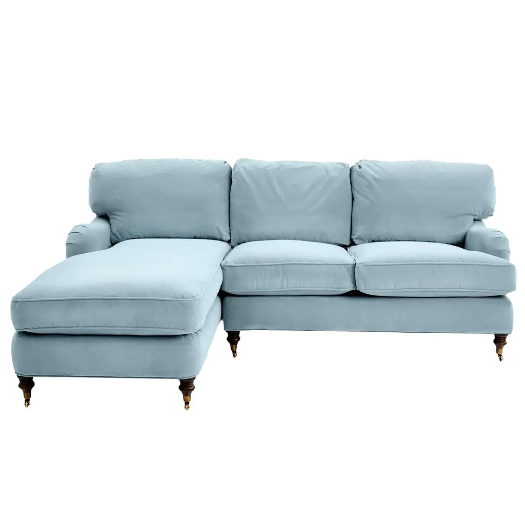 Available only at One Kings Lane: Framed in kiln-dried hardwood, this English-arm sectional is made elegant and inviting with a relaxed silhouette, neatly tailored upholstery, and generous down-and-feather fill. Its finely turned front legs are capped with brass casters for easy mobility and scratch-free surface protection.