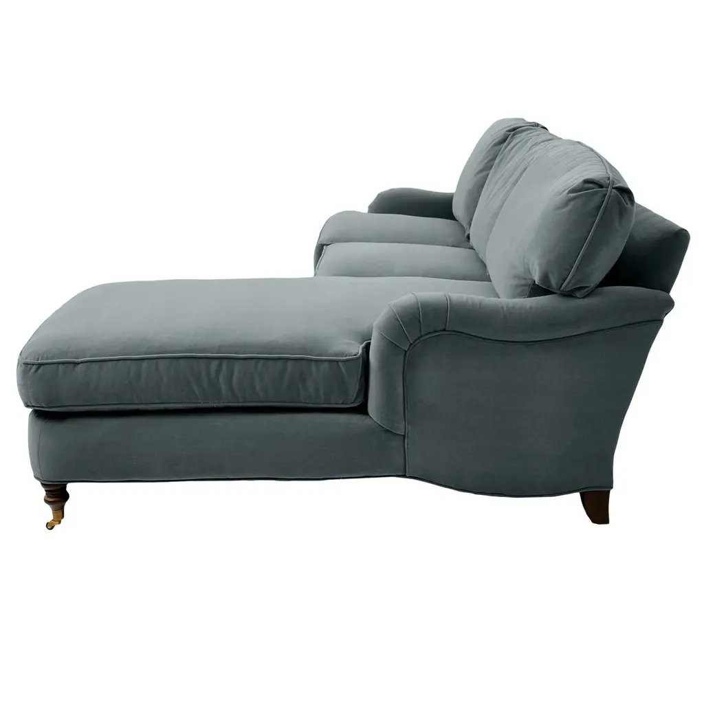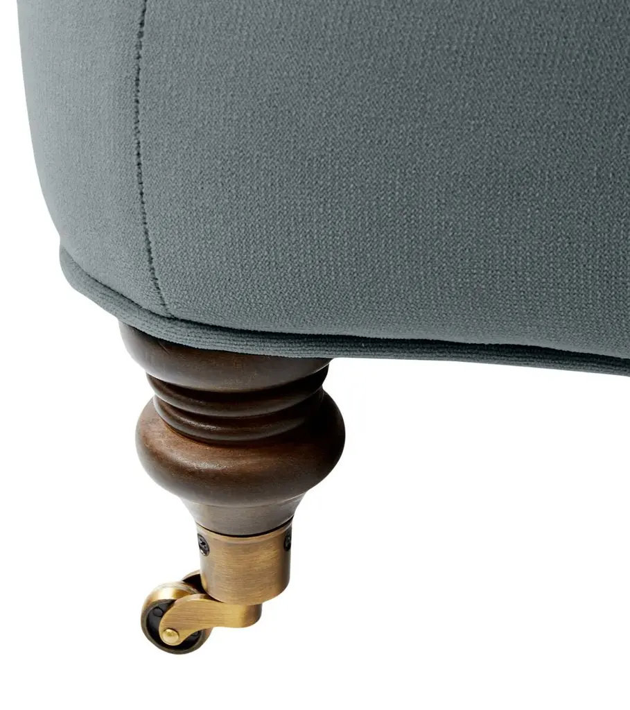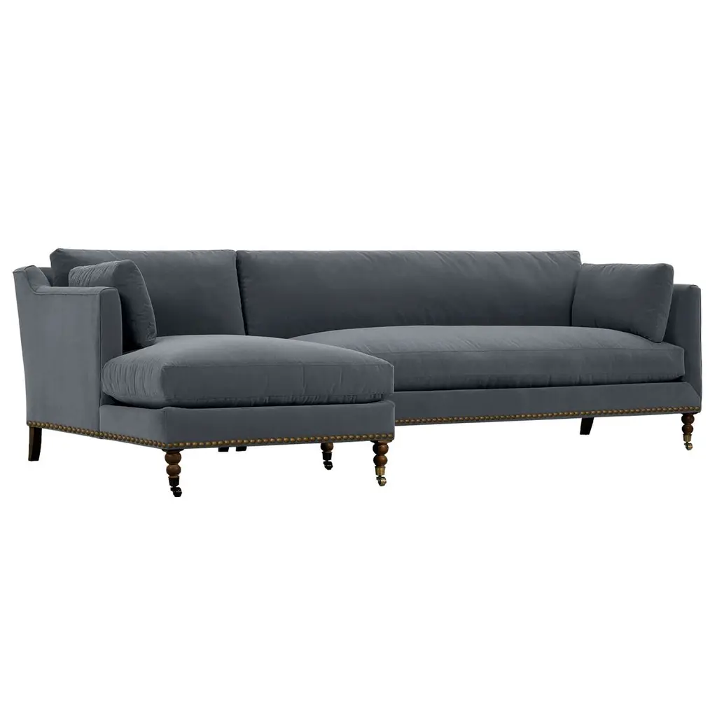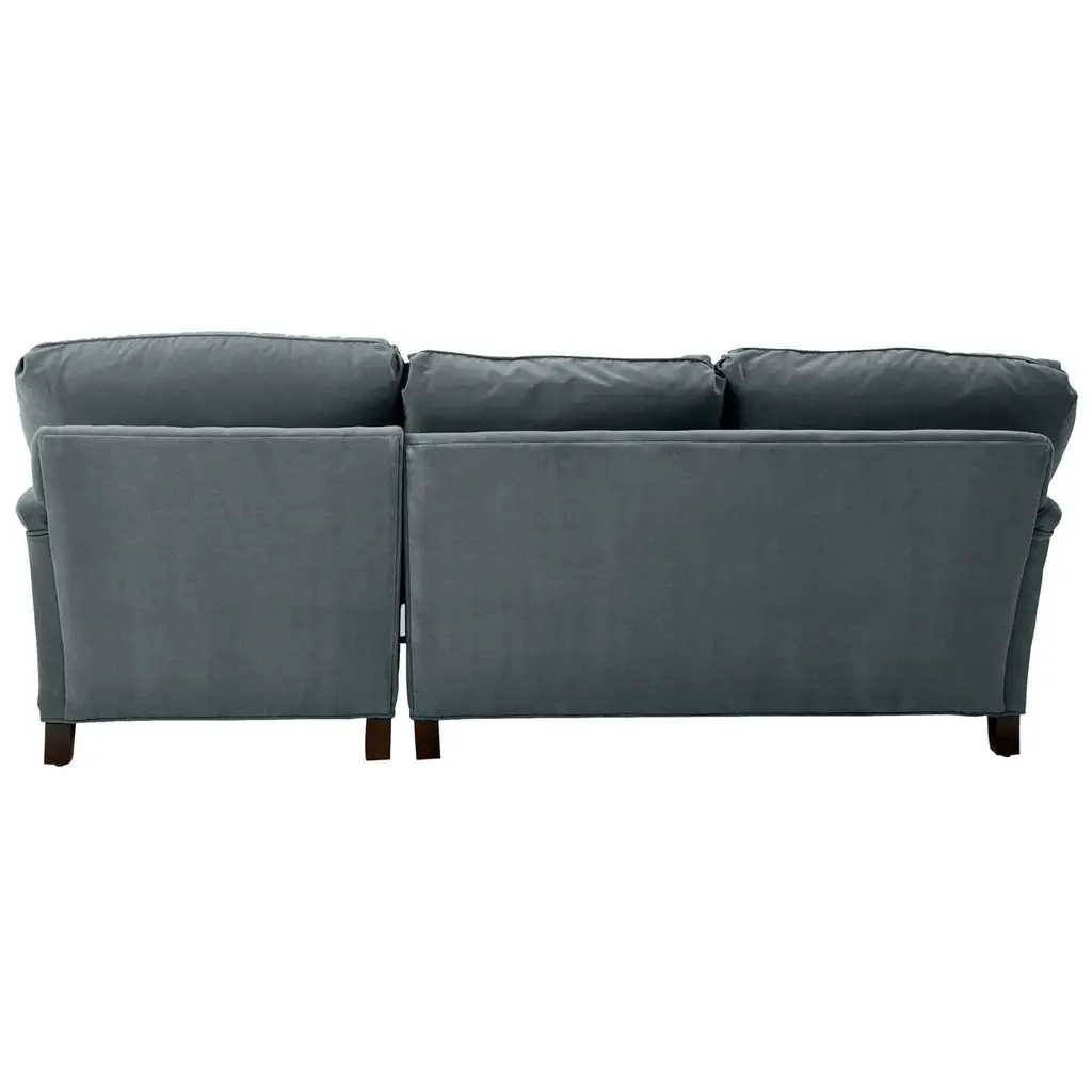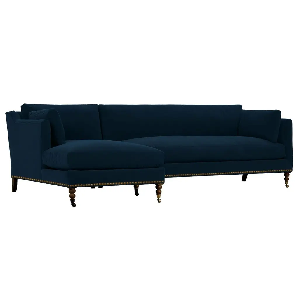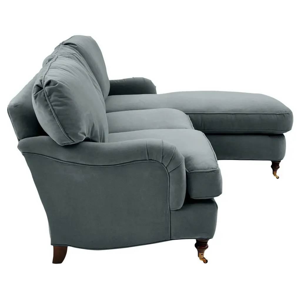 Available only at One Kings Lane: Framed in kiln-dried hardwood, this English-arm sectional is made elegant and inviting with a relaxed silhouette, neatly tailored upholstery, and generous down-and-feather fill. Its finely turned front legs are capped with brass casters for easy mobility and scratch-free surface protection.