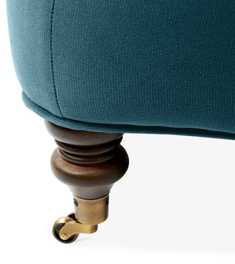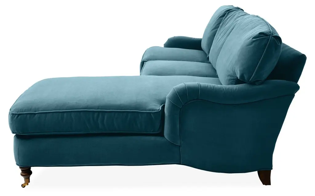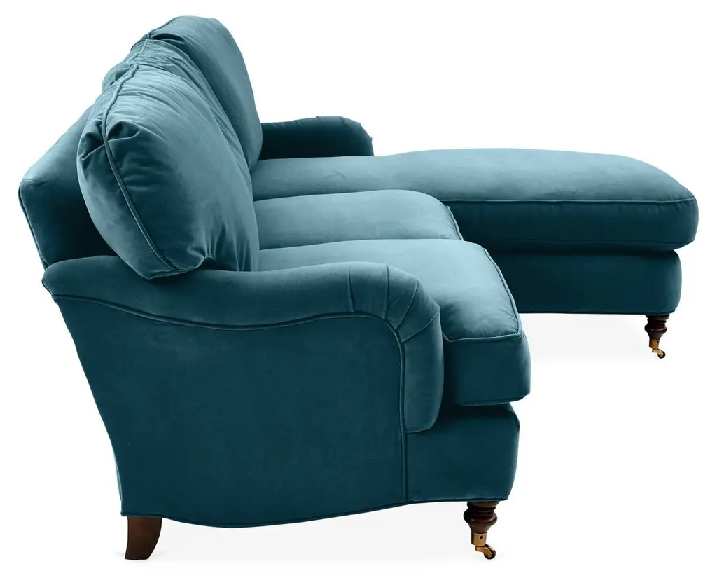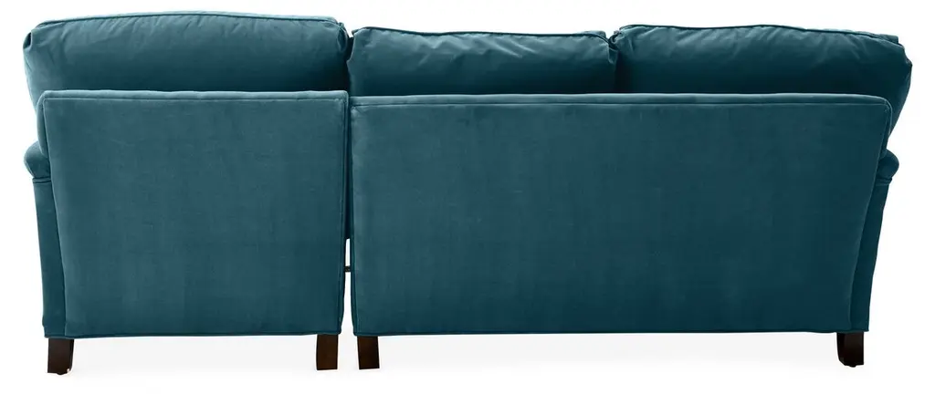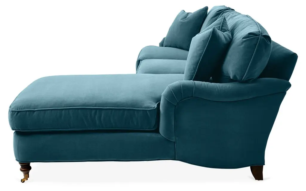 Available only at One Kings Lane: Framed in kiln-dried hardwood, this English-arm sectional is made elegant and inviting with a relaxed silhouette, neatly tailored upholstery, and generous down-and-feather fill. Its finely turned front legs are capped with brass casters for easy mobility and scratch-free surface protection.