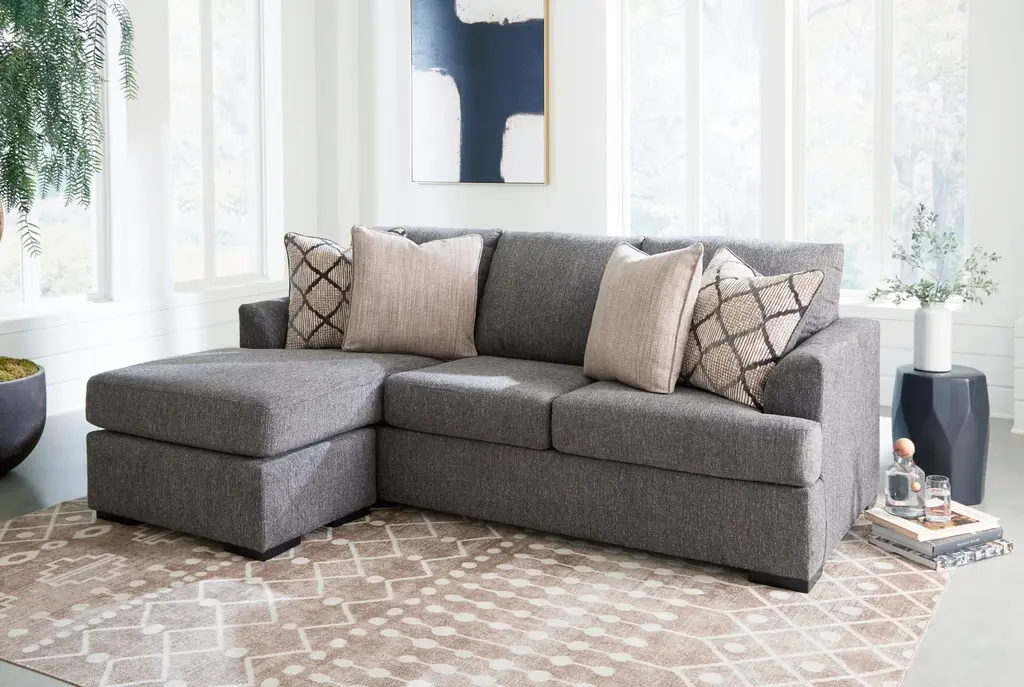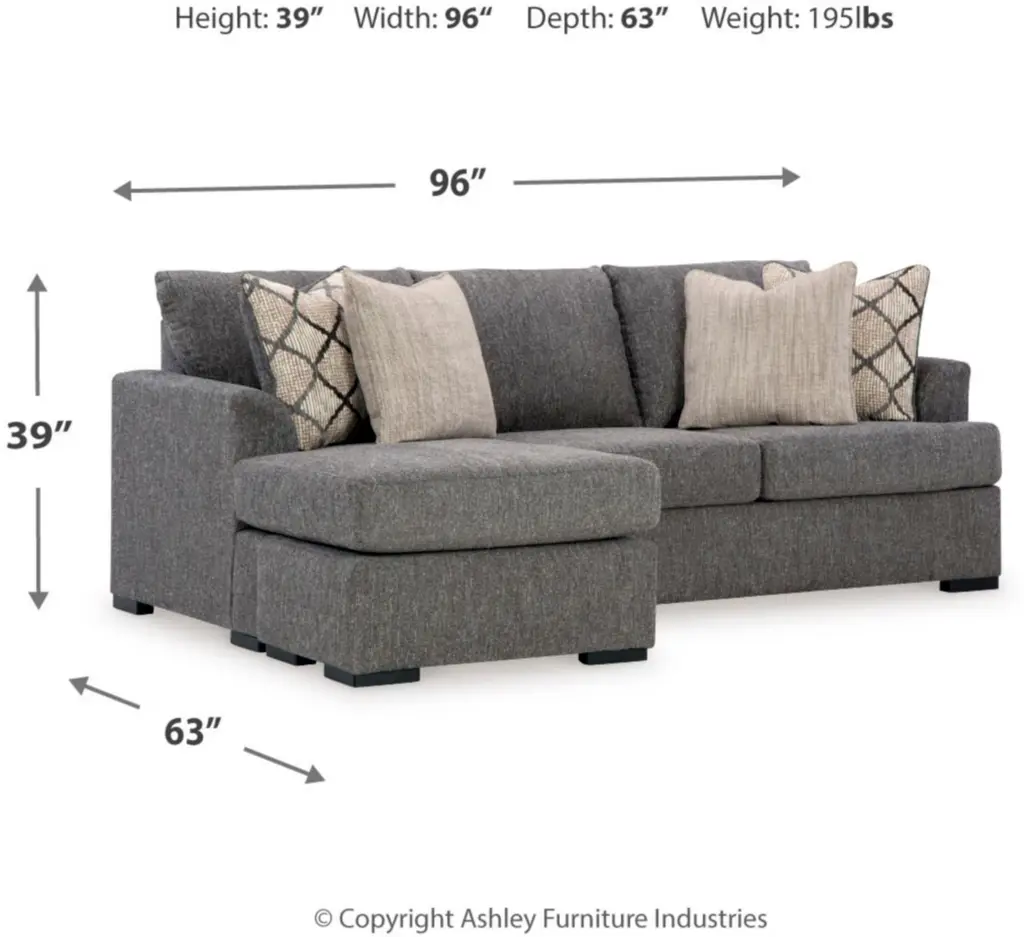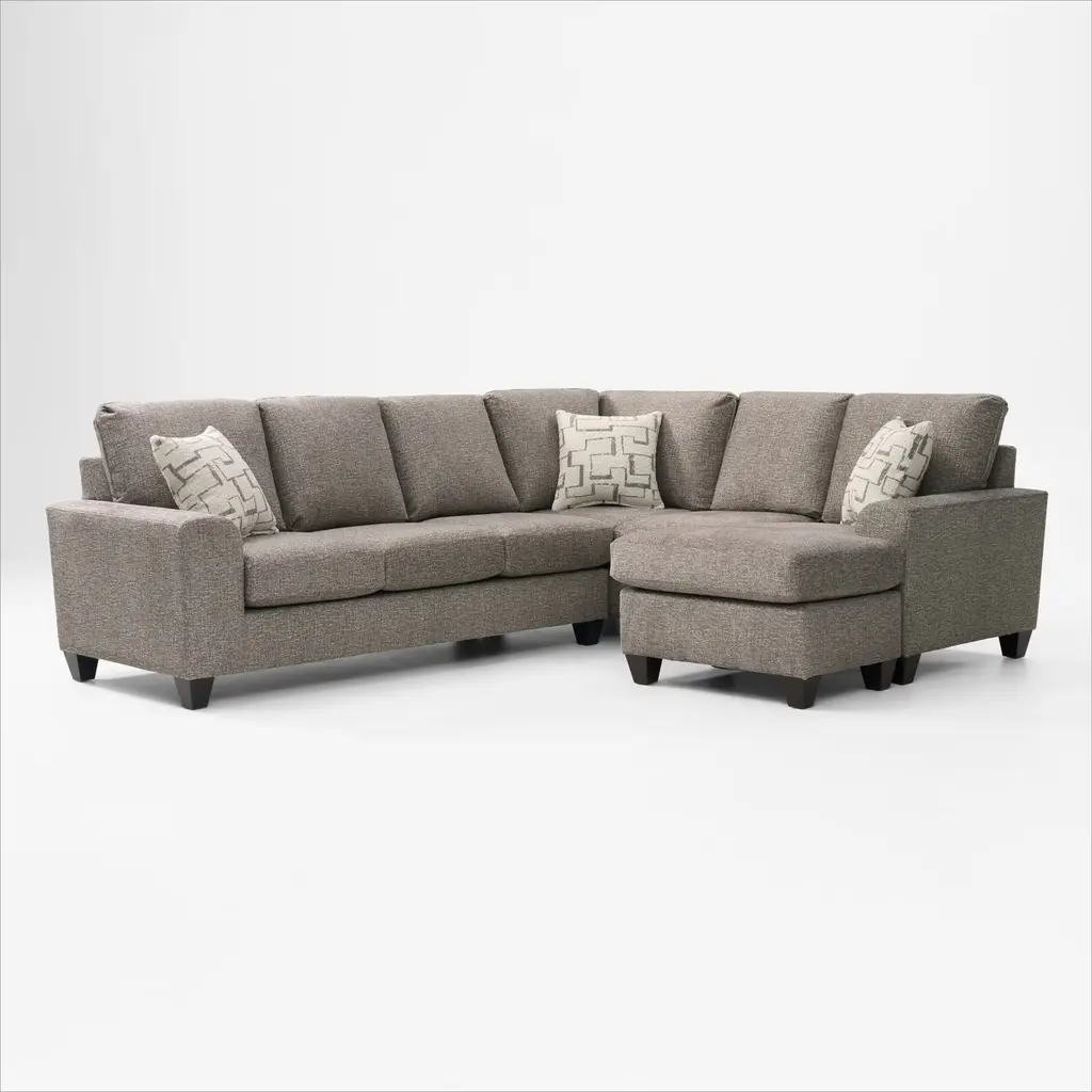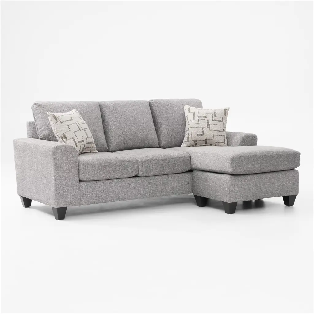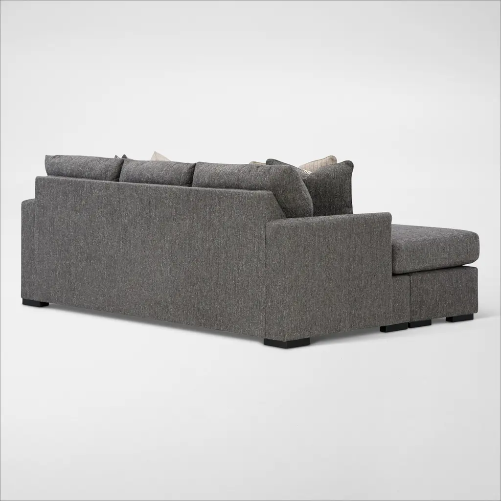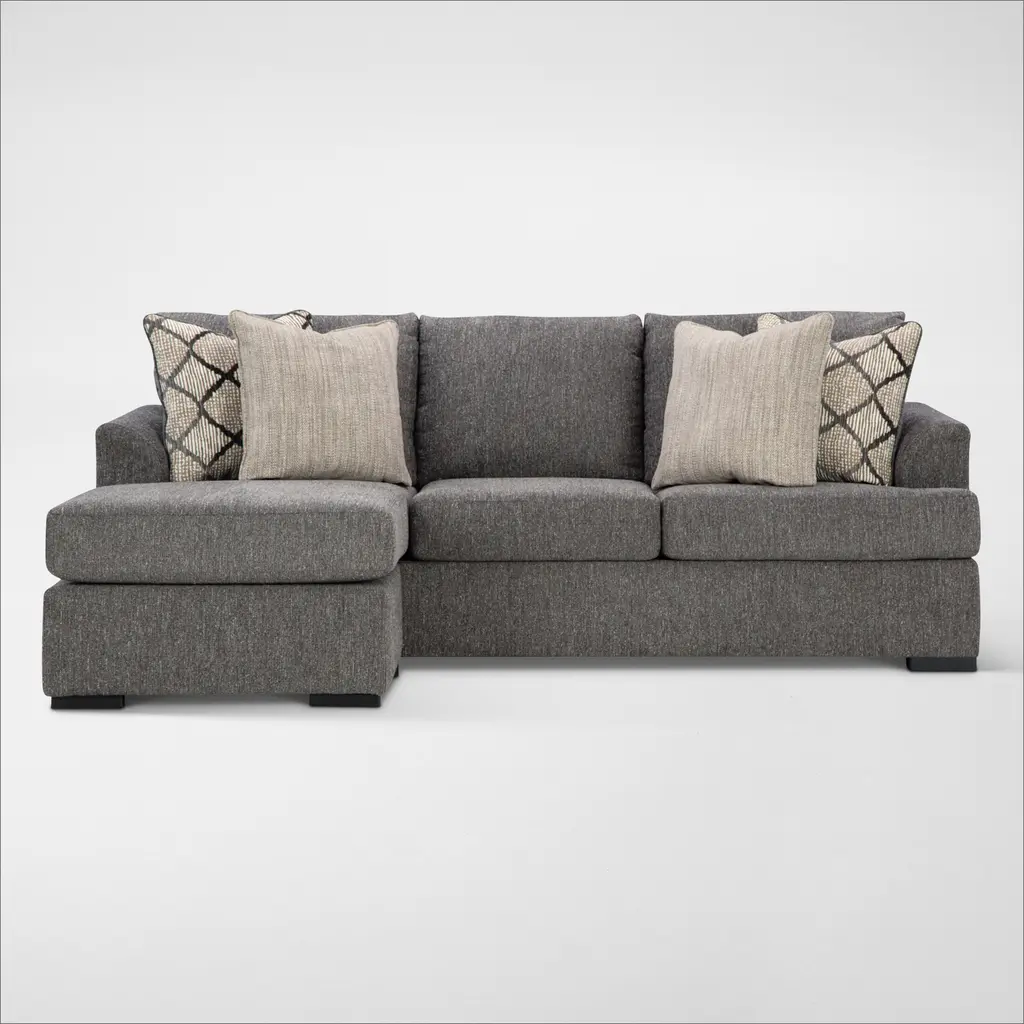 The Hartford Sofa Chaise by Broyhill is blanketed in soft charcoal gray chenille and features a sleek arm design and clean lines. Neutral throw pillows complete the look, making it a stylish and cozy addition to any space.