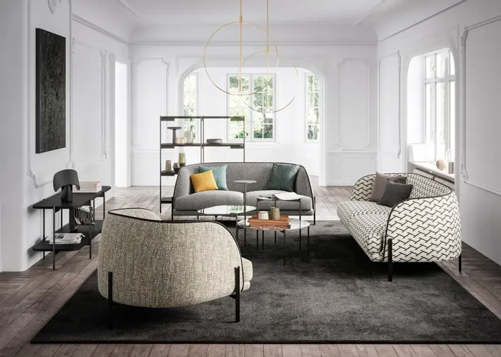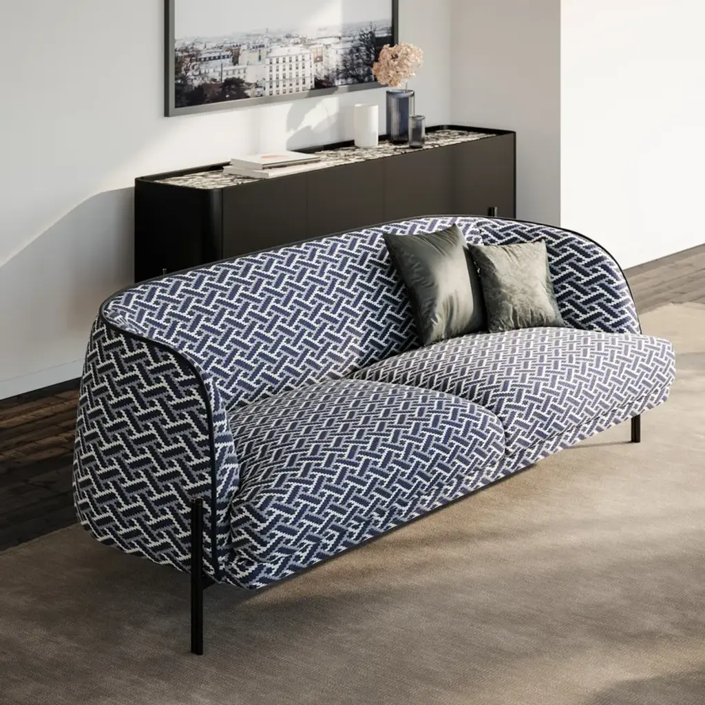 Caillou is an elegant sofa that owes its personality to clean and soft lines. The rounded and enveloping shapes, the attention to detail and excellent finishes contribute to make it even lighter and more sophisticated. The Liu Jo brand performs in the refined metal structure, thanks to the presence of the characteristic golden capsule that signs the object defining its preciousness and the definitive partnership between fashion and design. It is available in 3 and 2 seats as well as in the armchair version.Frame: solid fir wood, plywood, wood fiber, covered with polyester fiber wrap 340 gr/m²Springing/webbing: elastic strapsSeat cushion: polyurethane foam density 35 kg/m³ covered by a virgin polyester fiber plumette and polyester fiber wrap 250 gr/m²Back cushion/armrest: polyurethane foam density 25-30 kg/m³ covered with polyester fiber wrap 340 gr/m²Foot: powder-coated metal footFrom the creative vision of Liu Jo was born the custom-made living room. Craftsmanship, versatility, style and sustainability come together to enter the world of home and transform the furniture. Liujo’s living collection is a declaration of intent: new forms and customizable materials open the space to new reading keys and give life to unique pieces. The house is dressed and changed to meet all the needs of everyday life detaching from the classic nomenclatures and running on elegant lines, delicate finishes, soft fabrics and customizable colors. Not only sofas, poufs or armchairs, but design with a strong identity, free, sectional and removable, with irregular and fresh shapes that revolutionize the environment. Recognizable and iconographic in ideas, shape and finish, the pieces of furniture by Liu Jo find their reason for being in contrast: structures and rigid elements are designed to contain and embrace curves and movements, enhancing personal style and easily changing position and function.