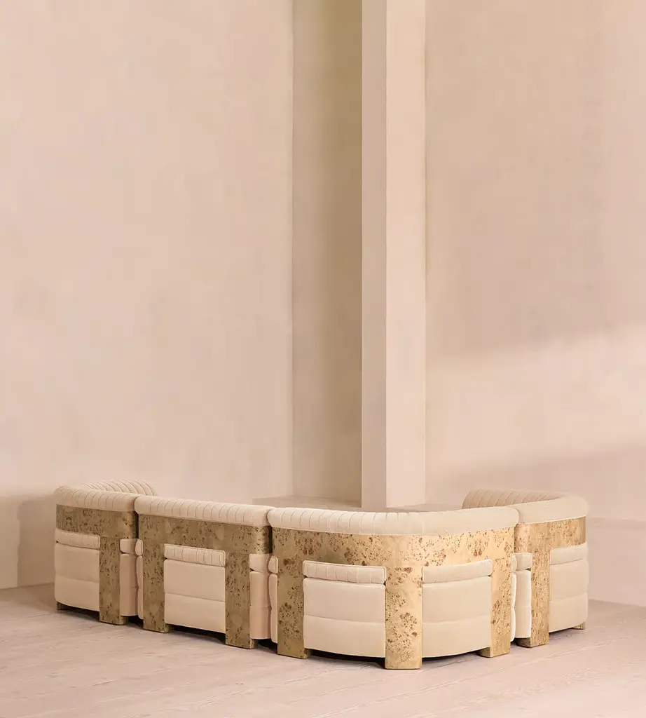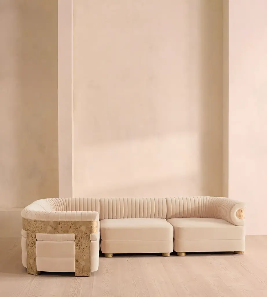 A modular style, fully upholstered in soft cotton velvet with a fluted backrest. Our L-shaped Caleb sofa is designed to adapt to your space, upholstered in cotton velvet and made to order in our full velvet colour palette. The tubular, fluted backrest and fixed seat cushions are complemented by blonde burl.