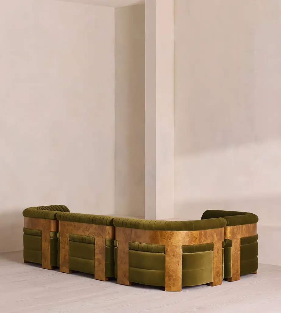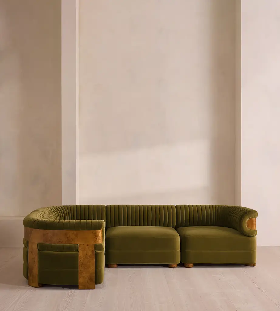 A modular style, fully upholstered in soft cotton velvet with a fluted backrest. Our L-shaped Caleb sofa is designed to adapt to your space, upholstered in cotton velvet and made to order in our full velvet colour palette. The tubular, fluted backrest and fixed seat cushions are complemented by blonde burl.