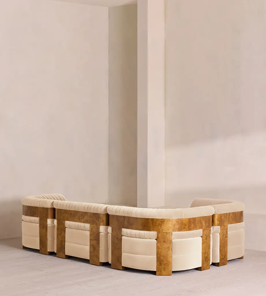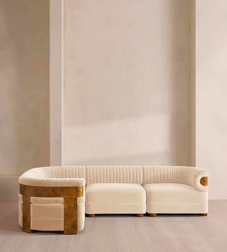 A modular style, fully upholstered in soft cotton velvet with a fluted backrest. Our L-shaped Caleb sofa is designed to adapt to your space, upholstered in cotton velvet and made to order in our full velvet colour palette. The tubular, fluted backrest and fixed seat cushions are complemented by blonde burl.