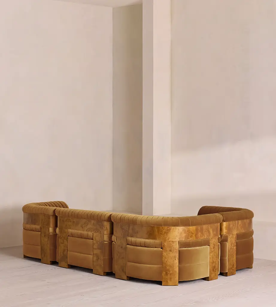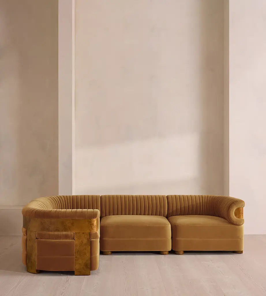 A modular style, fully upholstered in soft cotton velvet with a fluted backrest. Our L-shaped Caleb sofa is designed to adapt to your space, upholstered in cotton velvet and made to order in our full velvet colour palette. The tubular, fluted backrest and fixed seat cushions are complemented by blonde burl.