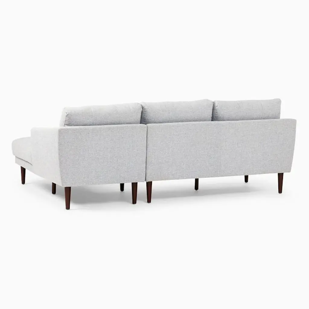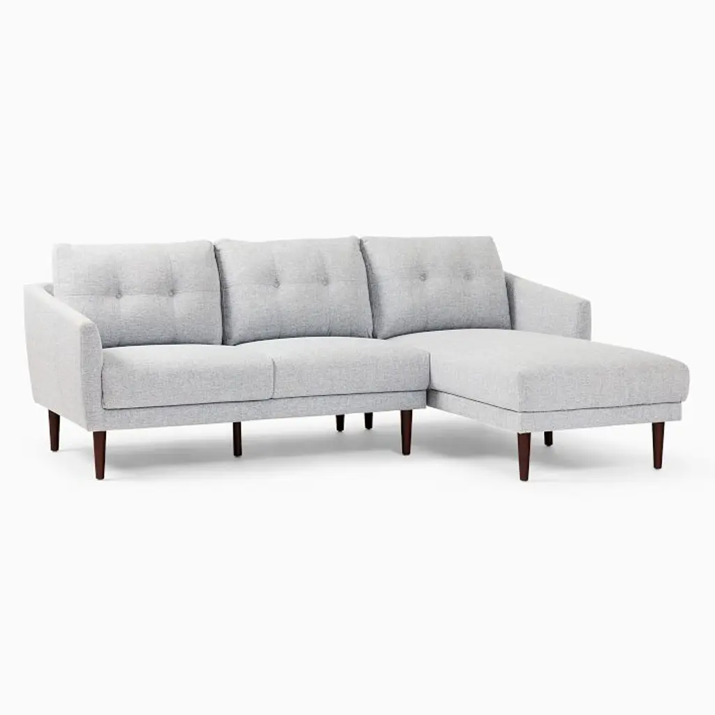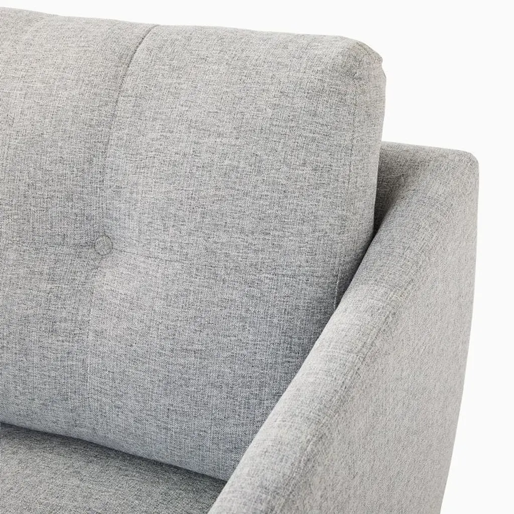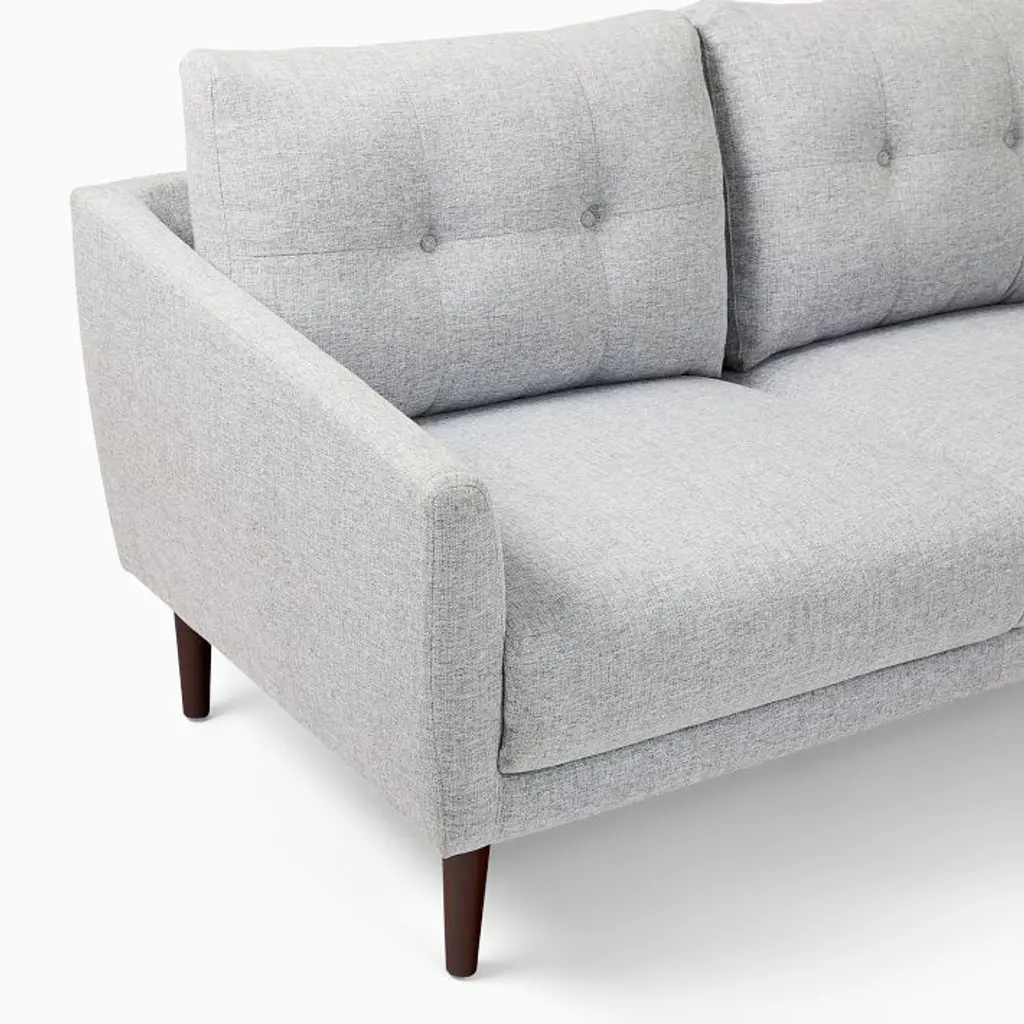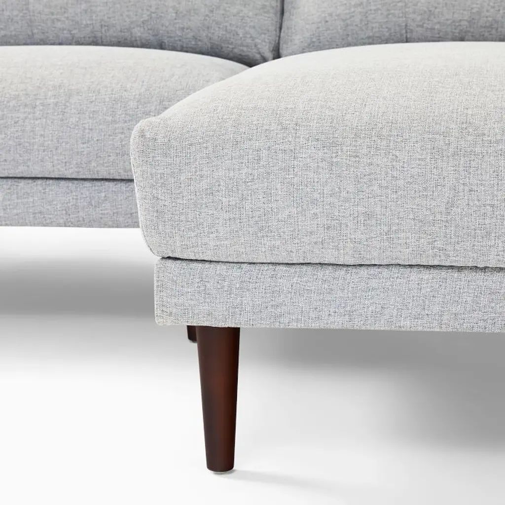 Solid and engineered wood frame. Solid rubber wood legs. High-gauge sinuous springs provide cushion support. Seat cushions have fiber-wrapped, high-resiliency polyurethane foam cores. Seat firmness: Medium. On a scale from 1 to 5 (5 being firmest), it's a 3. Back cushions are fiber filled. Loose, reversible cushions with zip-off covers. Made in China.