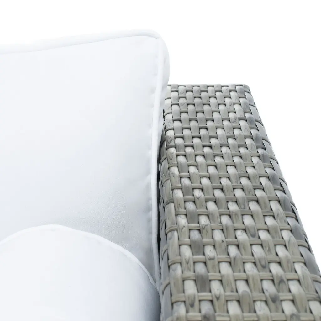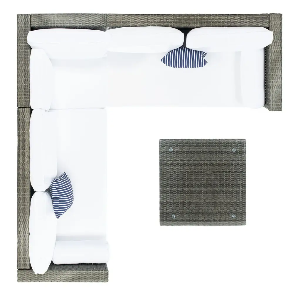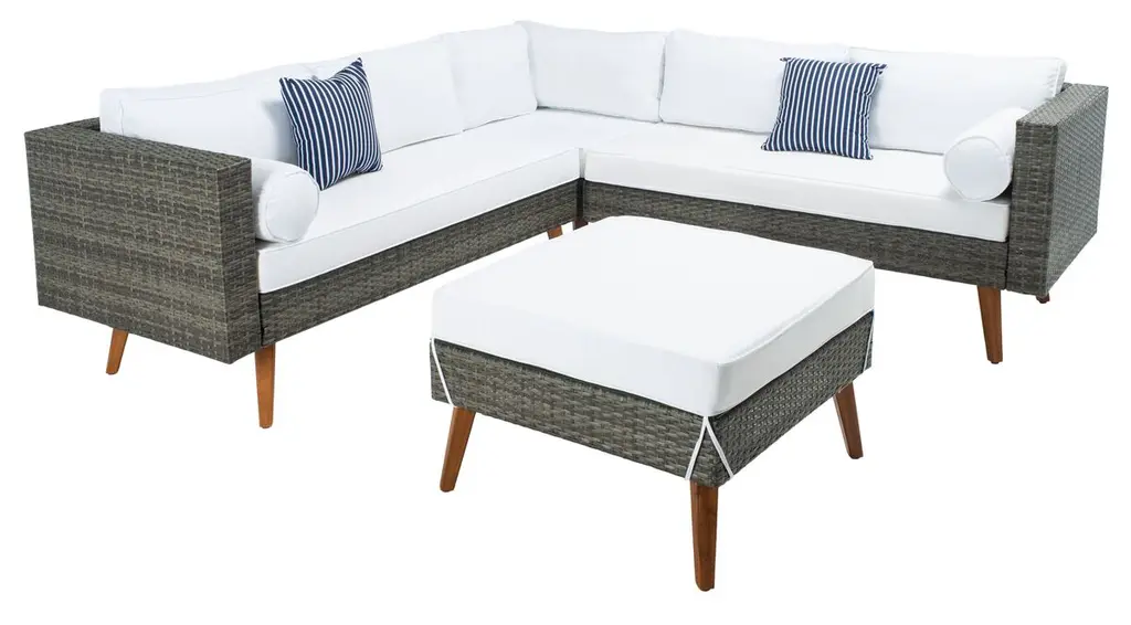 A striking blend of retro chic style and modern coastal relaxation, this Calloway Outdoor Sectional is perfect for open air entertaining. The wicker frames give its Mid Century style legs a fresh update, and plush cushions ensure lasting relaxation under the sun or stars. Includes two benches, one corner piece, and coffee table.