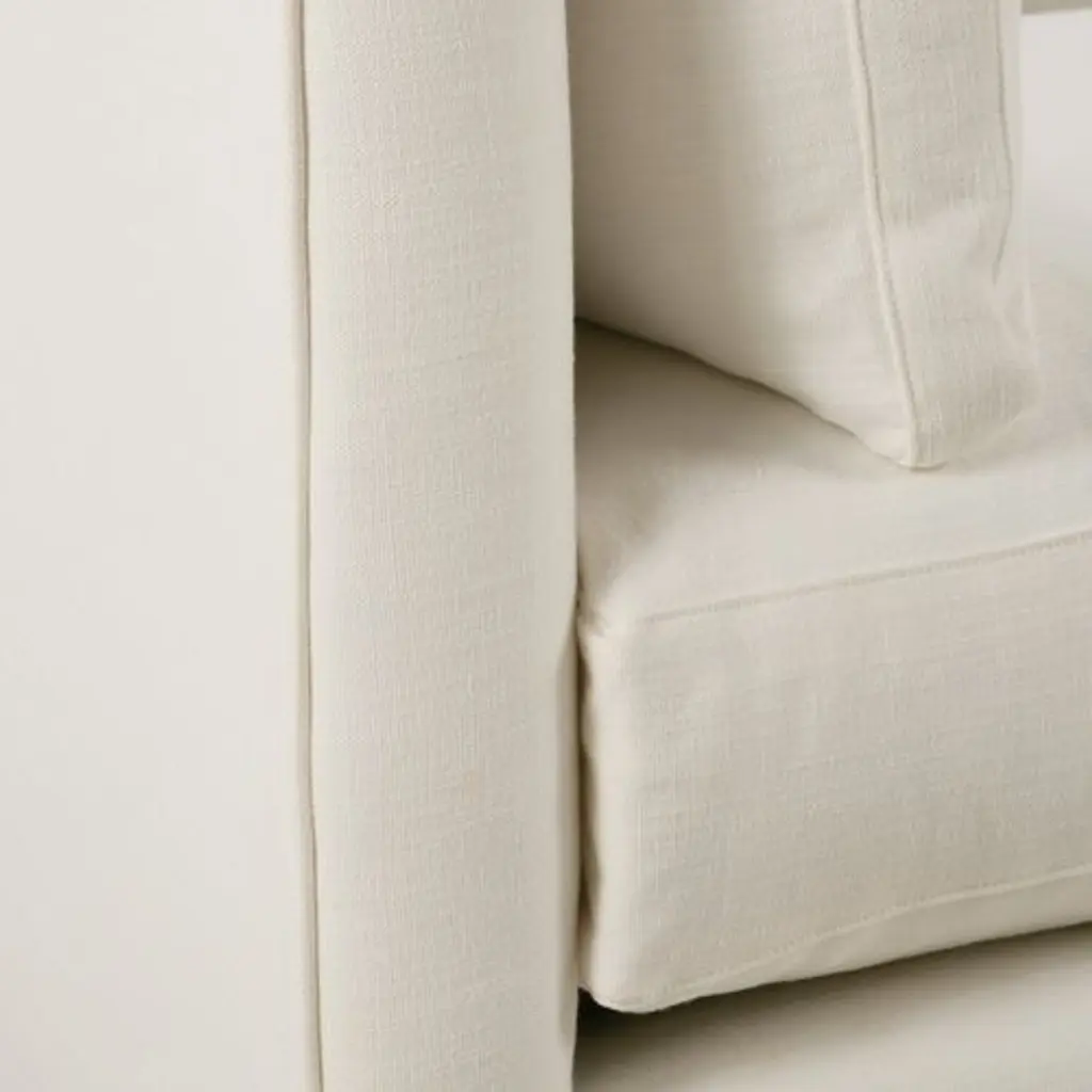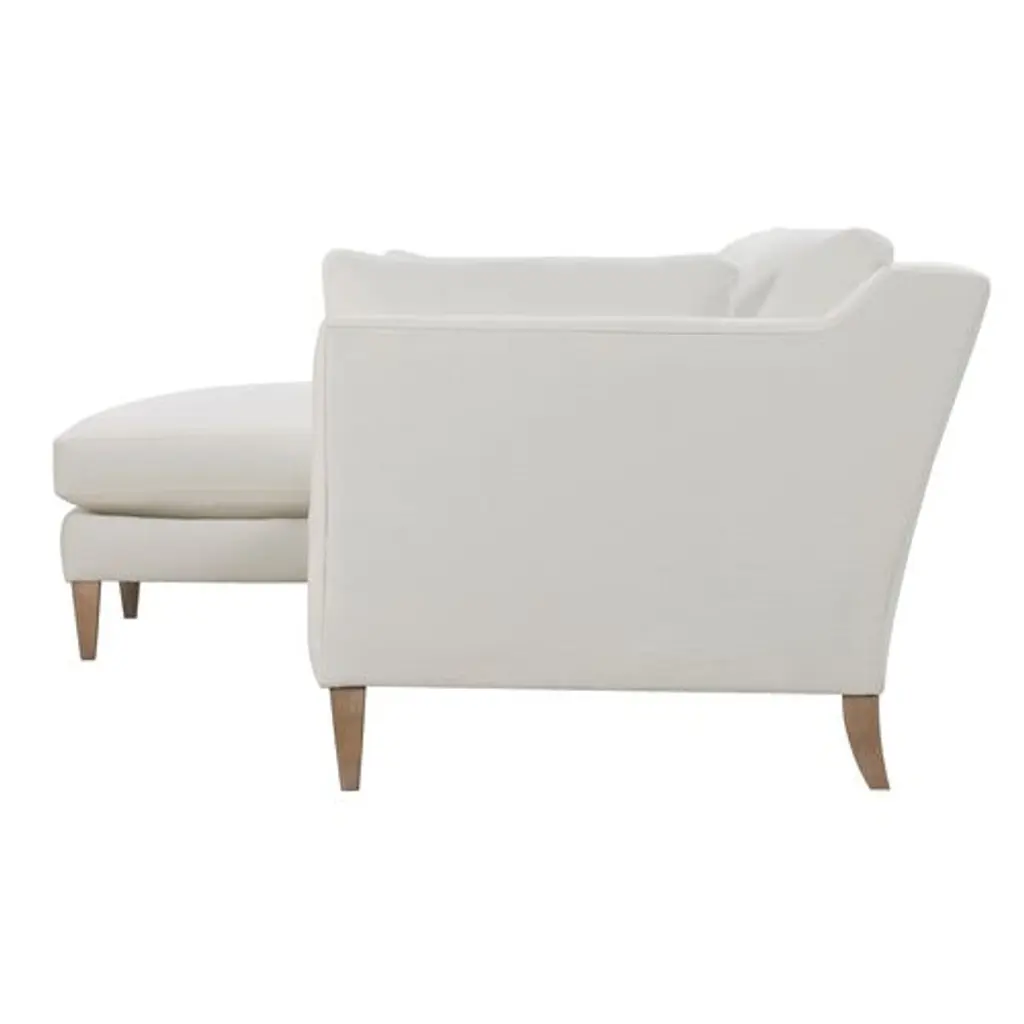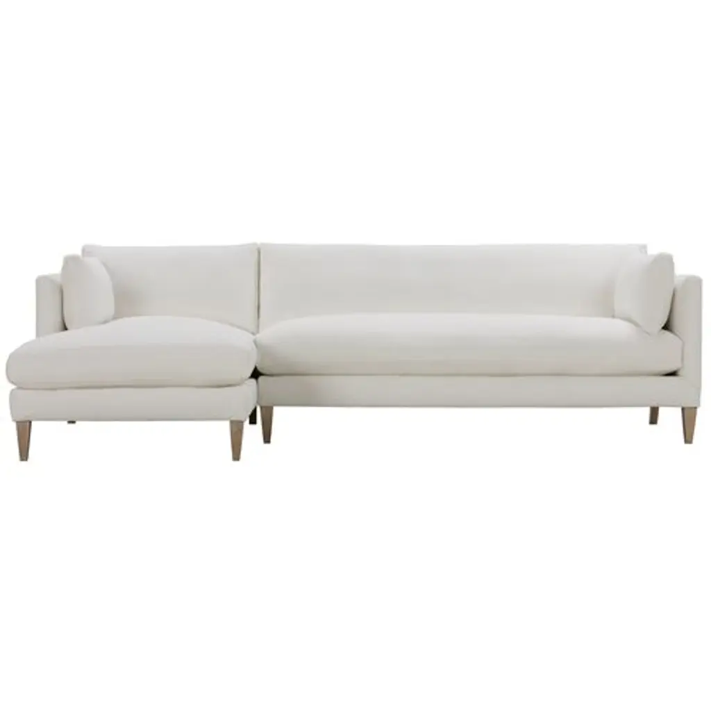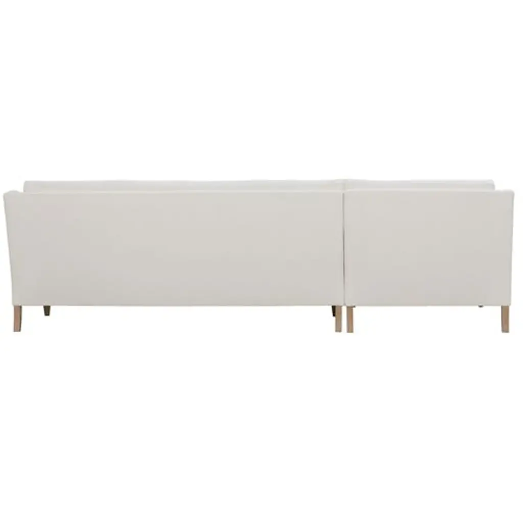 Designed by us and available only at One Kings Lane: This sectional's upholstery looks like linen, but it's washable, eco-friendly, and stain-resistant, making this a great choice for households with pets, kids, or spill-prone adults. Streamlined arms and tapered legs give it a fresh yet timeless appeal. The handcrafted, kiln-dried hardwood frame ensures that the sectional can withstand years of use, while the feather-and-down cushion fill provides long-lasting comfort.
