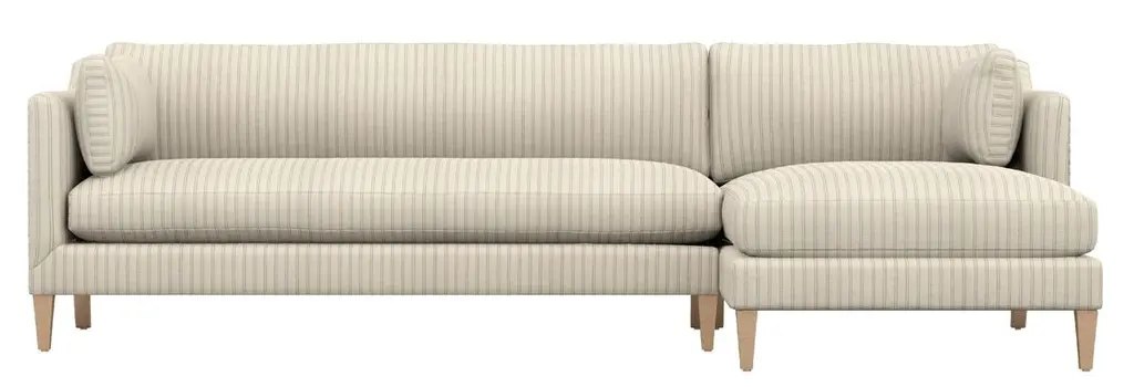 Designed by us and available only at One Kings Lane: This sectional's striped upholstery looks like linen, but it's washable, eco-friendly, and stain-resistant, making this a great choice for households with pets, kids, or spill-prone adults. Streamlined arms and tapered legs give it a fresh yet timeless appeal. The handcrafted, kiln-dried hardwood frame ensures that the sectional can withstand years of use, while the feather-and-down cushion fill provides long-lasting comfort.