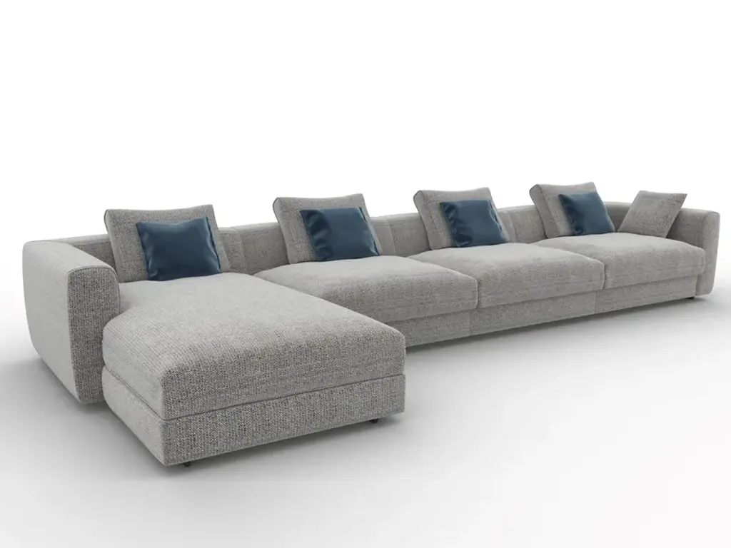 A sofa with a great scenographic impact, a padding system with great versatility: Capetown goes beyond any type of fashion to be simply itself. Thanks to its multi-form nature it can wonderfully adapt to the interiors opening new horizons of comfort.Frame: made in fir wood and plywood panels, the spring support is created by using interwoven elastic straps that are 90mm wide, covered in T25 and T40 differentiated density polyurethane foam and cotton cloth.Padding: seat cushions and back cushions in sterilized goose down with insert in T35 and T40 differentiated density polyurethane and covered in cotton ovoid leather or in differentiated density polyurethane foam T35 and T40, covered with Dacron fiber coupled with cotton cloth.Cover: fully removable in the fabric version.In the leather version only the cushions are removable.Feet: in gold painted aluminium, brun sablè, black, grey and ground support on thermoplastic material tips.The sofa consists of the following modules:- straight corner- 2 central elements for armchair (L 80 or 100 cm)- chaise longue- 4 back cushions 65x15x50 cm