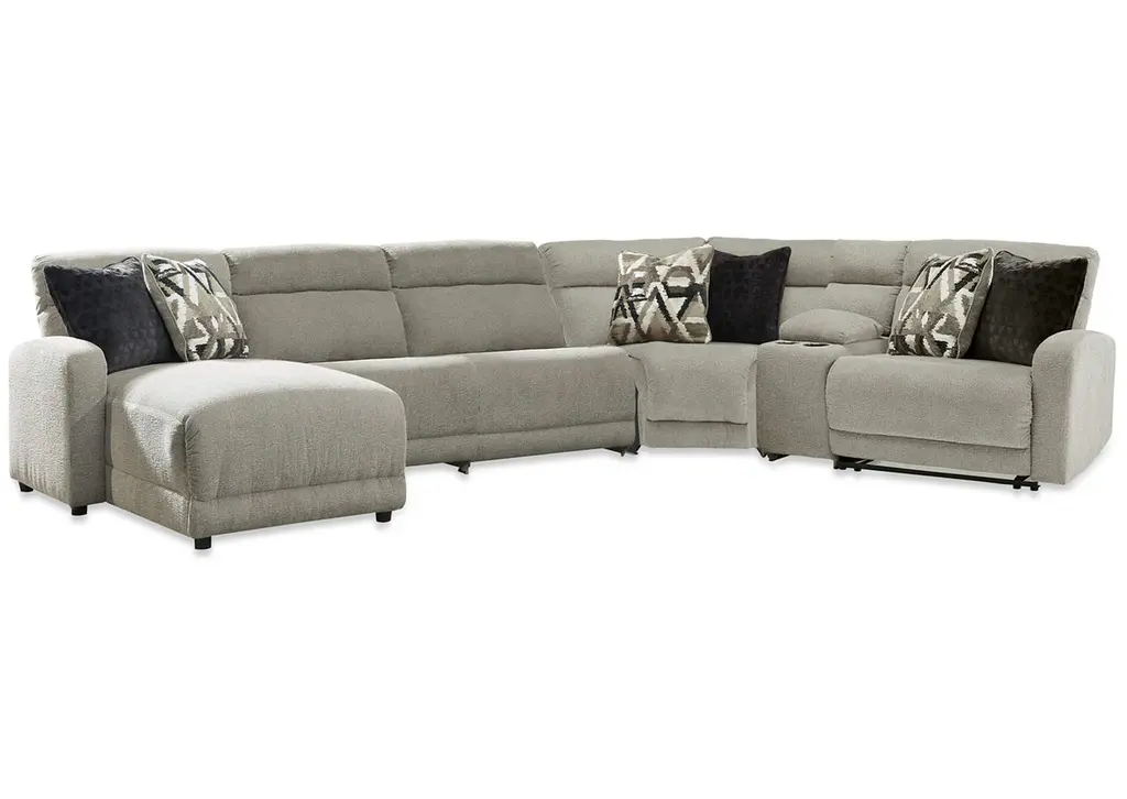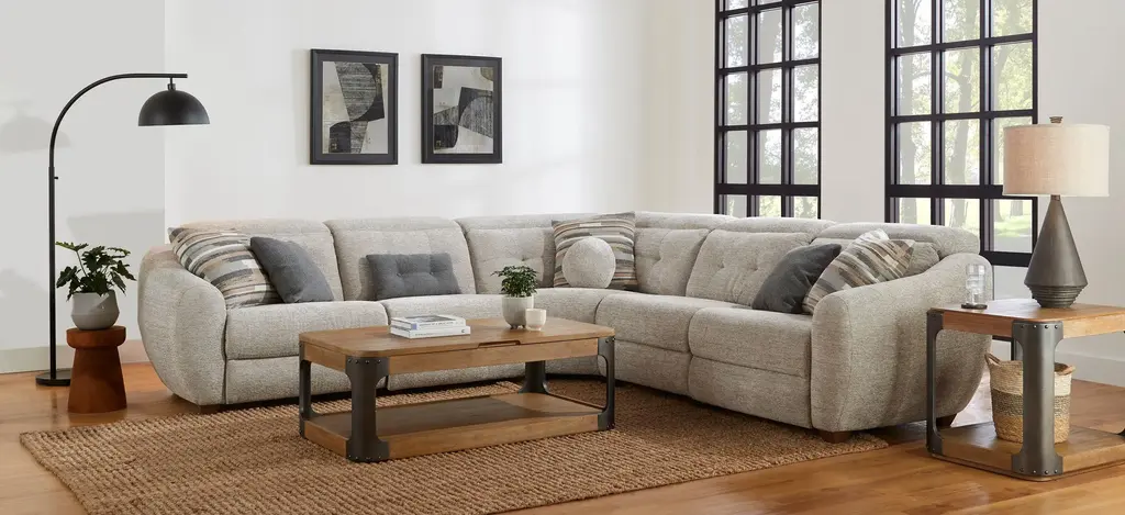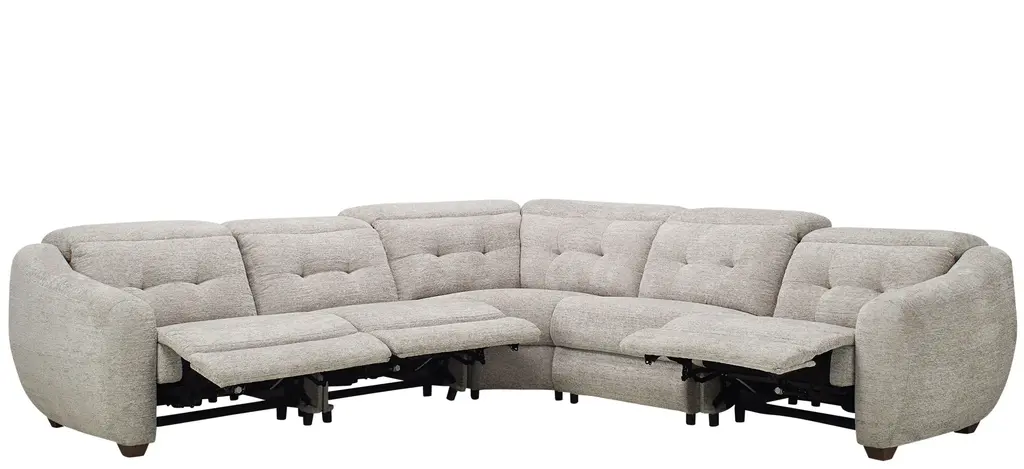 The pleasing lines and soft neutral fabric of the Carson 5-pc. power sectional beckon you to blissful, easy comfort. You'll be on cloud nine with its oversized, rounded silhouette, unique angles and retro vibe. Essential power features keep it grounded in functionality and an array of cool accent pillows-including a fleecy ball-are simply delightful.