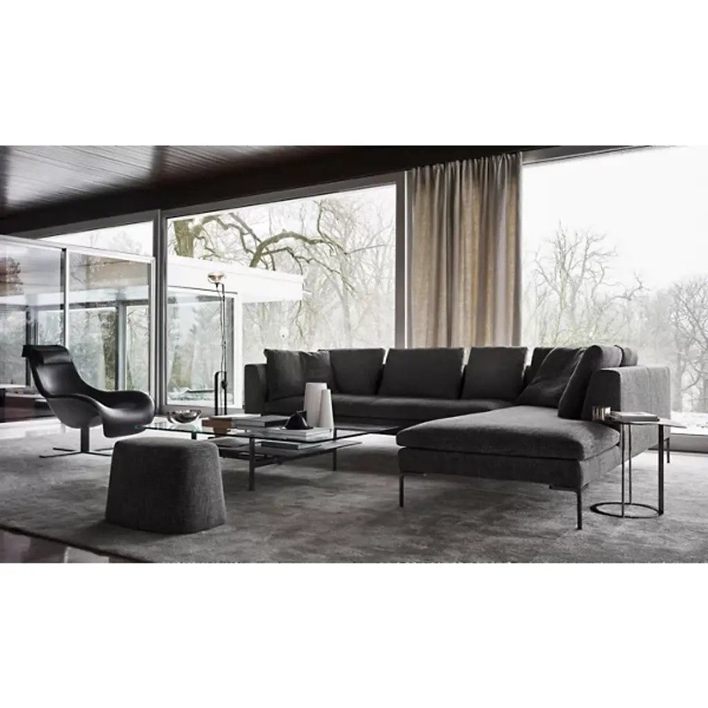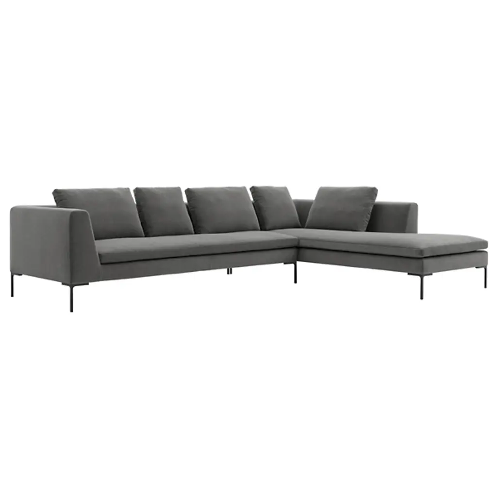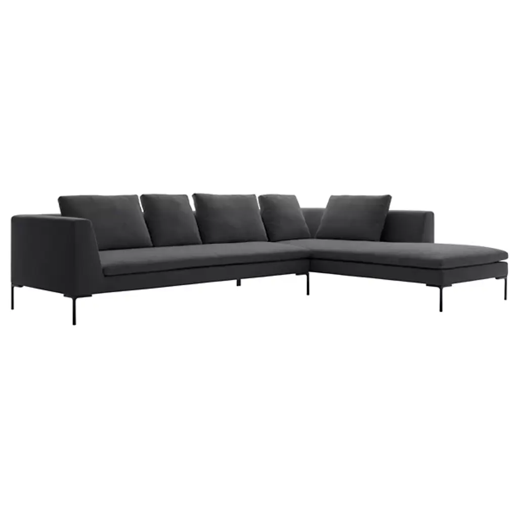 The Charles Right Arm Sectional Sofa from B&B Italia is a contemporary design icon that has long endured thanks to its clean, open, and inviting composition. Designer Antonio Citterio's pieces are built on pure, fundamental shapes. The simple L-shape sits gracefully atop the sofa's die-cast aluminum legs. The sturdy framework above lends itself to a formal appearance in its low-profile silhouette. The eyes are drawn to the armrests that angle sharply with tapering shapes.