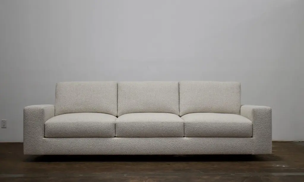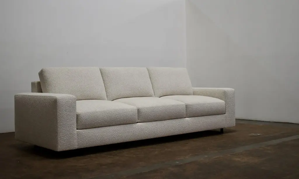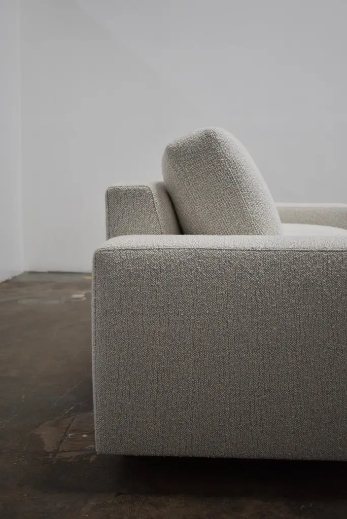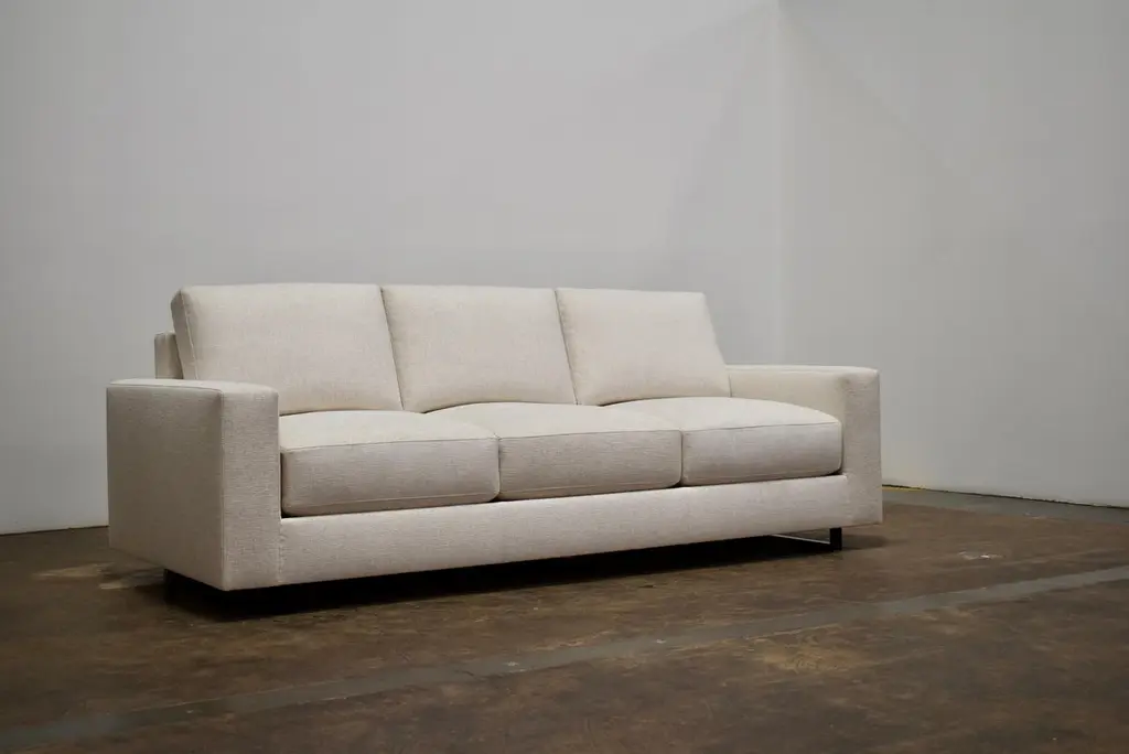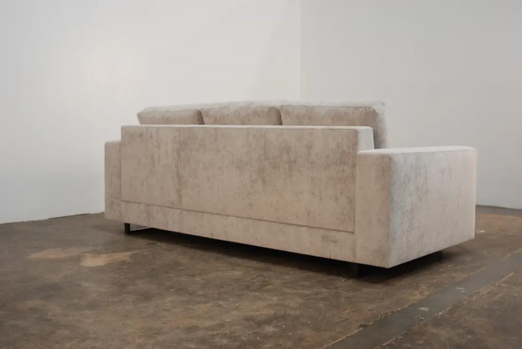 Our Chloe Sofa is a sleek and modern version of a classic sofa. It is made with a classic hand-tied inner spring suspension in the seat, along with 100% white goose down and feather cushions. There are also independent suspensions in the back and the arms, giving the piece additional longevity, durability, and comfort.The back is made as one separate piece, which allows for the sofa to have a very unique look and design aesthetic from the backside.The sofa sits on ebonized u-shaped metal legs, allowing the piece to appear as floating. The sofa can also be made with a recessed wood base instead of the metal legs.Custom sizes and elements are available upon request. Also, we can make a sectional version as well.COM quantity available upon request.