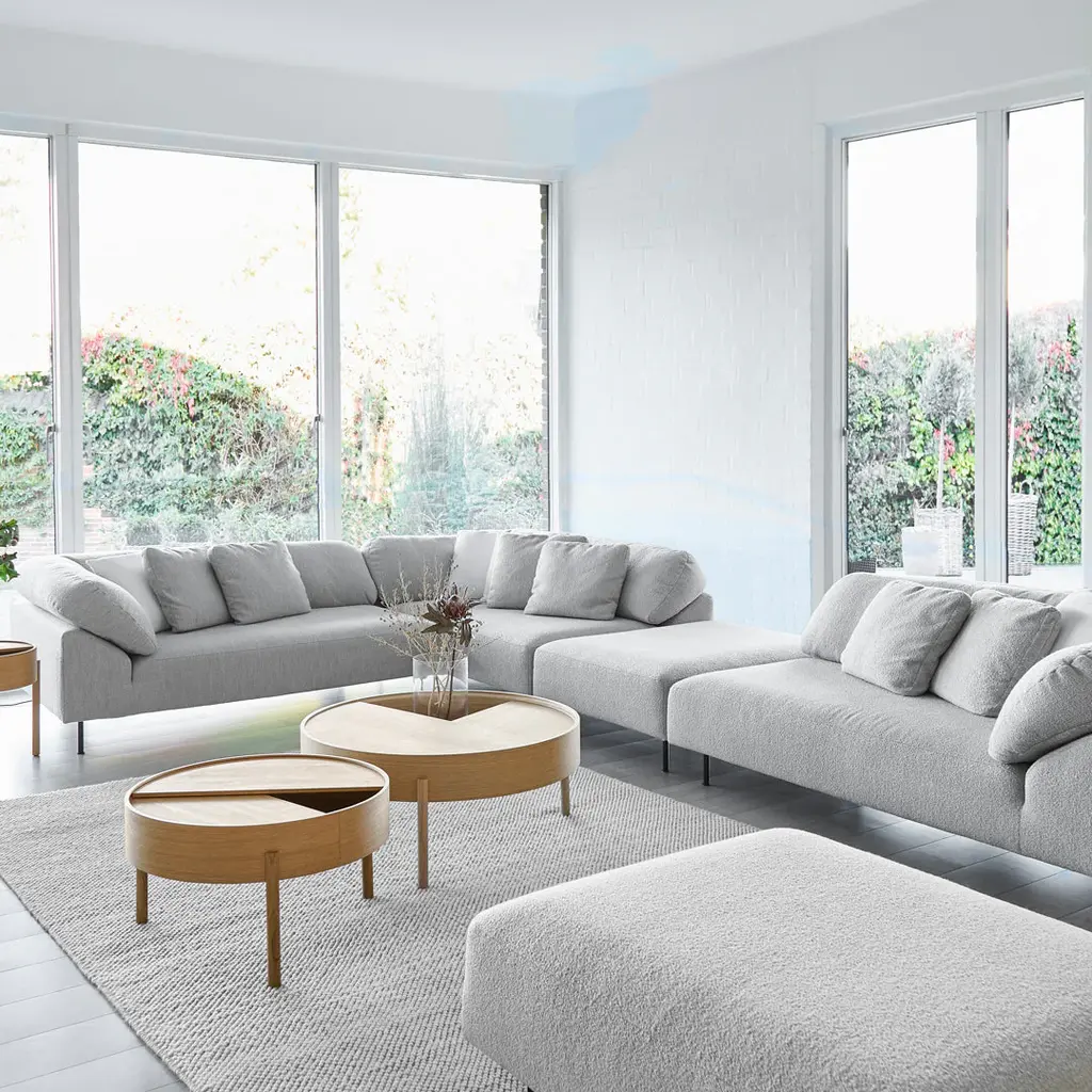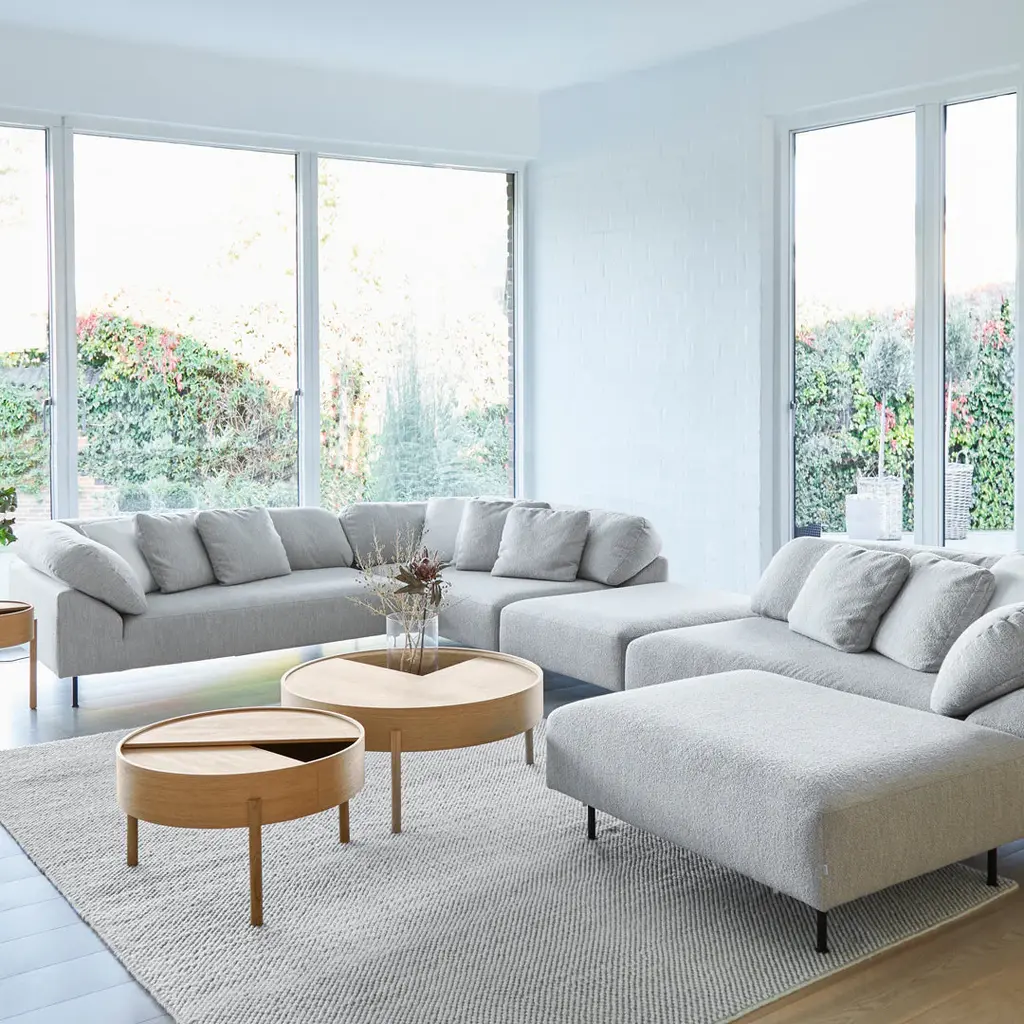 Using voluminous curves and askew-arranged back cushions, Collar reinterprets classic sofa design into a contemporary appealing appearance. Delta shaped sides perfectly support the cushion in a wide-angle. Combined with the low backrest, the continuous back cushion functions as a collar and when sinking into the carefully selected soft memory foam you achieve the feeling of a soft hug. The sectional includes: 2 x open end left (arm right), 1 x open end right (arm left) and 3 x cushions in the same fabric as the sofa.