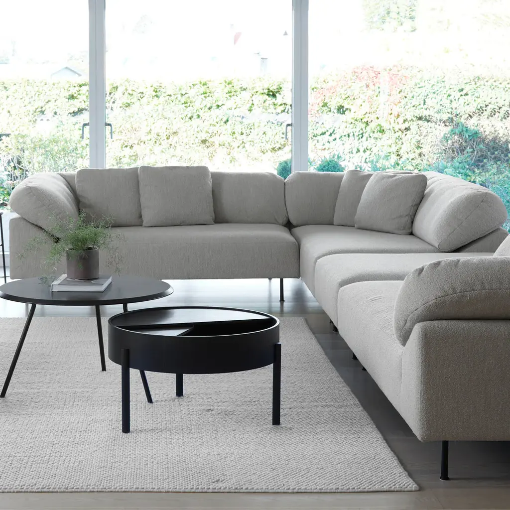 Using voluminous curves and askew-arranged back cushions, Collar reinterprets classic sofa design into a contemporary appealing appearance. Delta shaped sides perfectly support the cushion in a wide-angle. Combined with the low backrest, the continuous back cushion functions as a collar and when sinking into the carefully selected soft memory foam you achieve the feeling of a soft hug. The sectional includes: 2 x open end left (arm right), 1 x open end right (arm left) and 3 x cushions in the same fabric as the sofa.