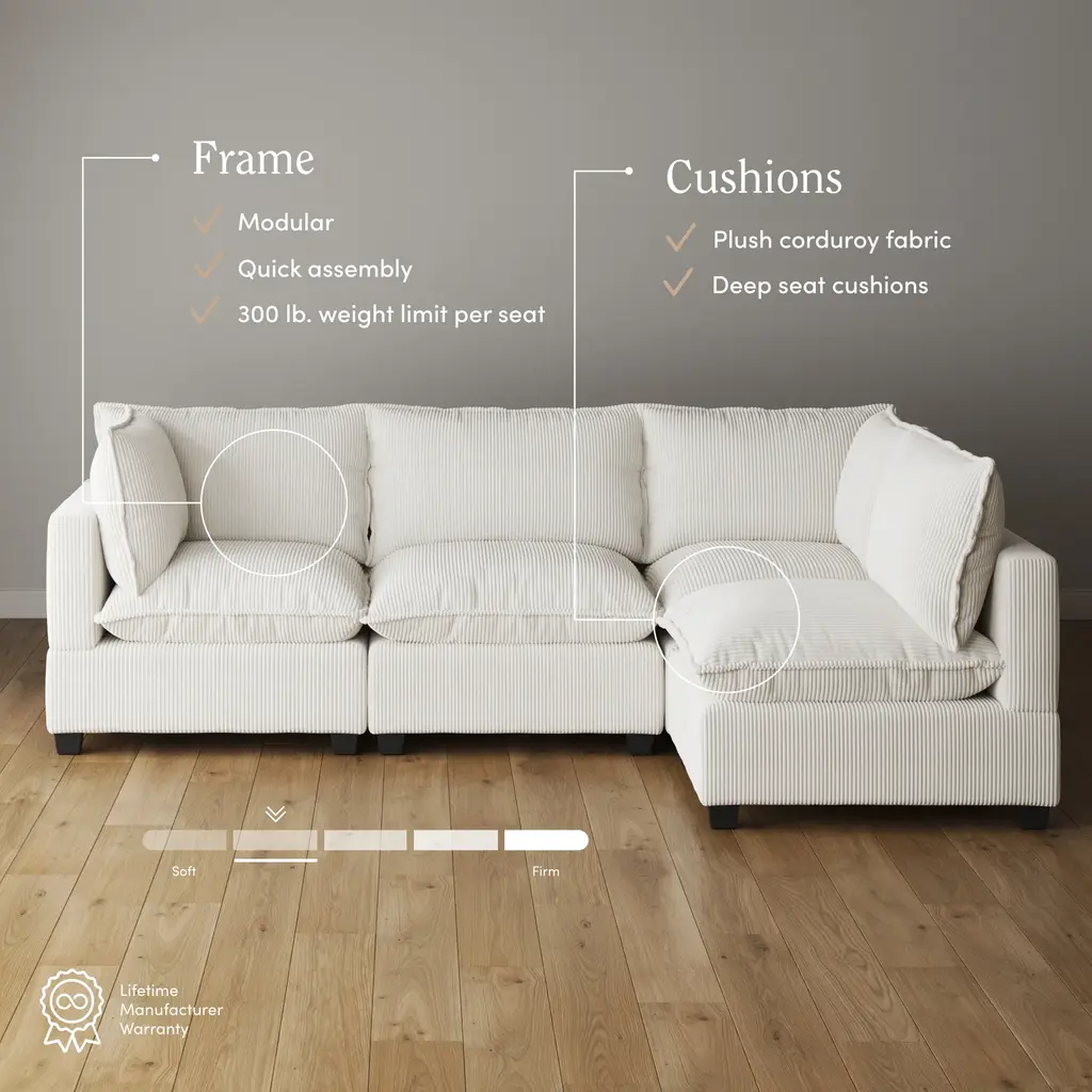 Introducing the Chelsea Cloud Couch—a perfect blend of comfort and style designed to make your living space a cozy haven. Wrapped in luxuriously soft corduroy fabric with eye-catching ridges, this sofa features deep seat cushions and plush, pillow-like back cushions. Enjoy effortless setup with quick assembly. Built to last, each seat supports up to 300 lbs., ensuring everyone can sink into cloud-like comfort.