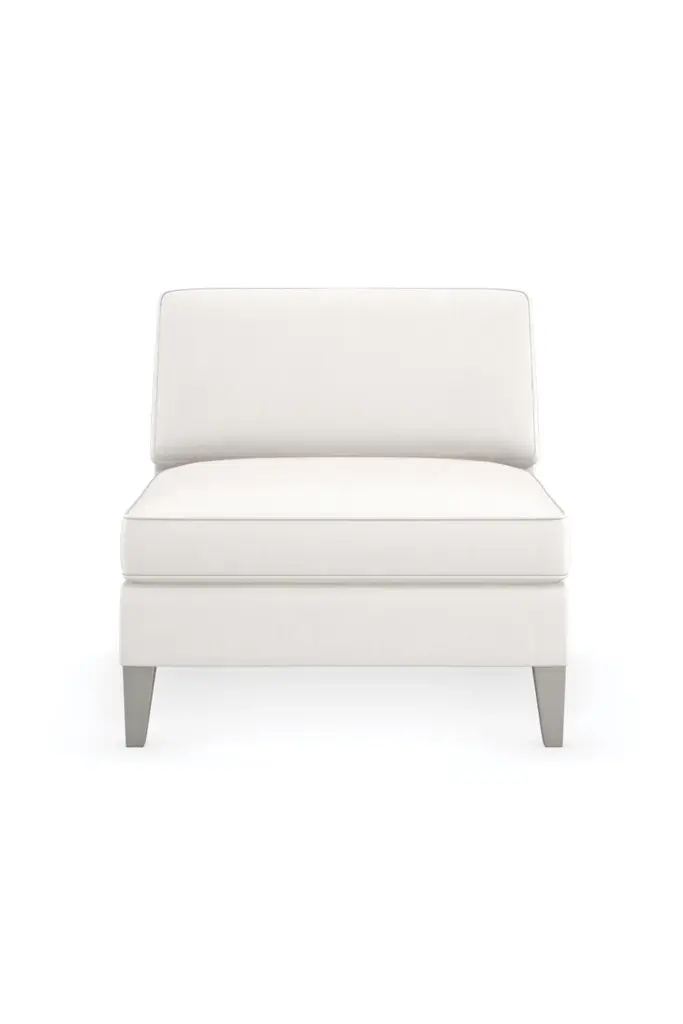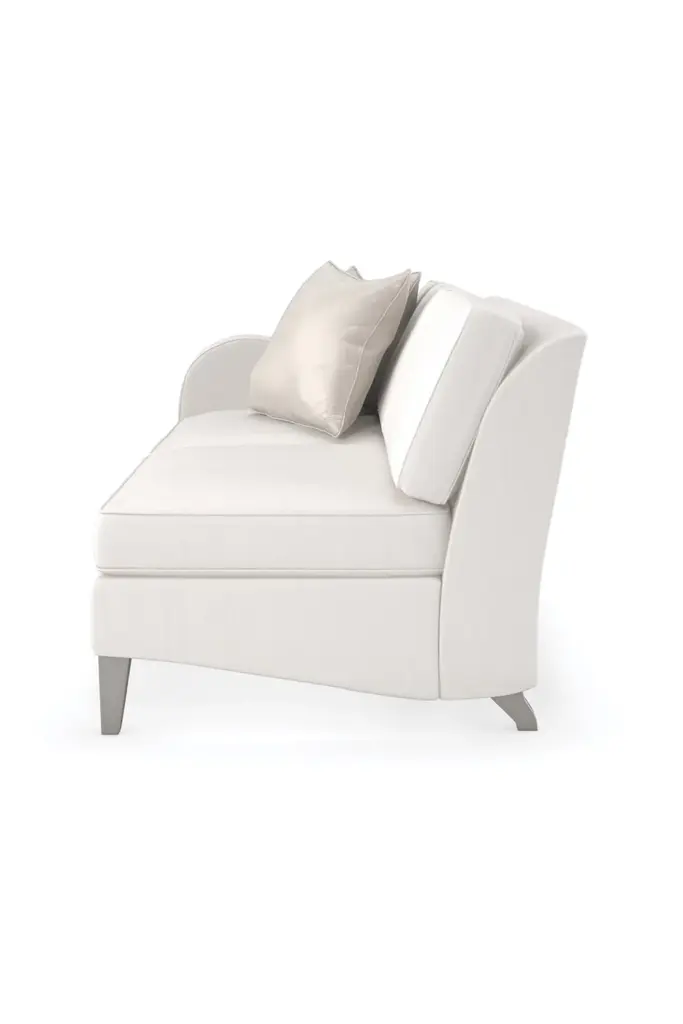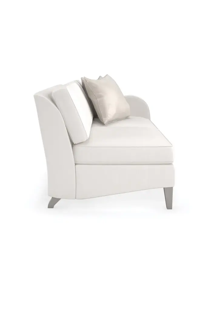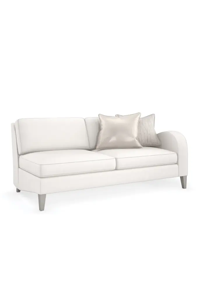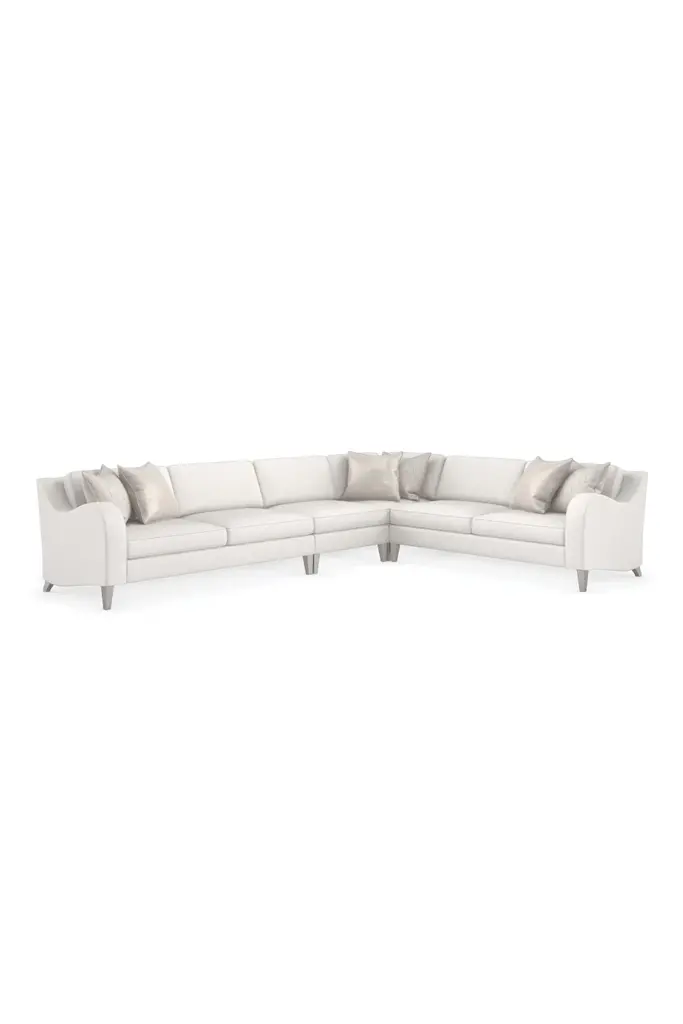 Inspire sparkling conversation and moments of reflection with this shapely sectional, upholstered in a cream performance basketweave with a subtle luster. A fresh, yet familiar addition to living room interiors, its gently sloping arms lend a contemporary take on the classic English arm, complemented by tapered legs in a Sparkling Argent finish. Accent pillows add shimmer and tactile appeal in a botanical leaf print and gold-toned satin.