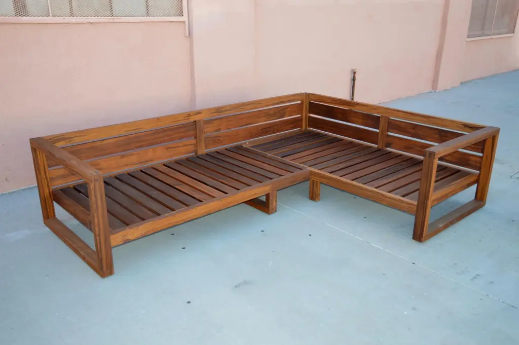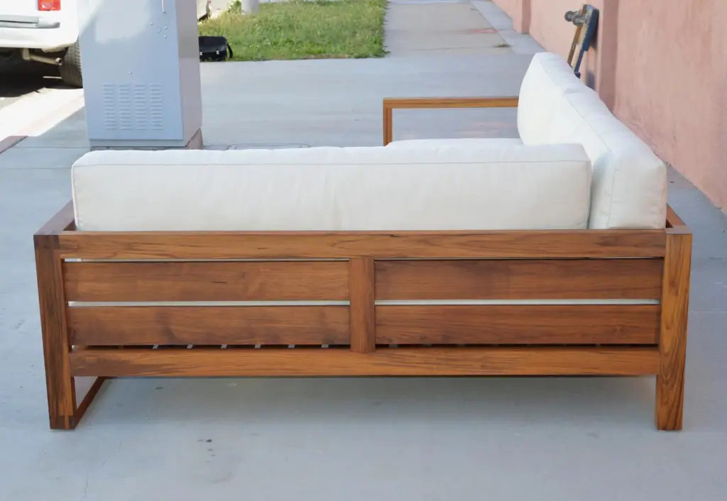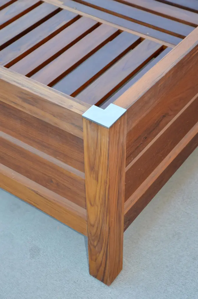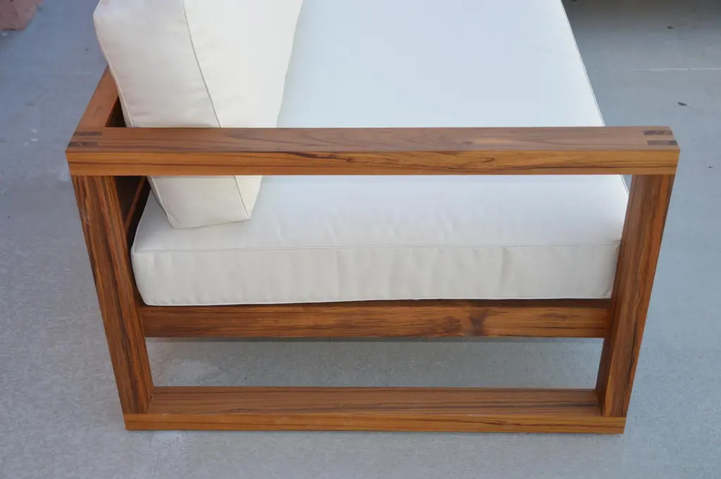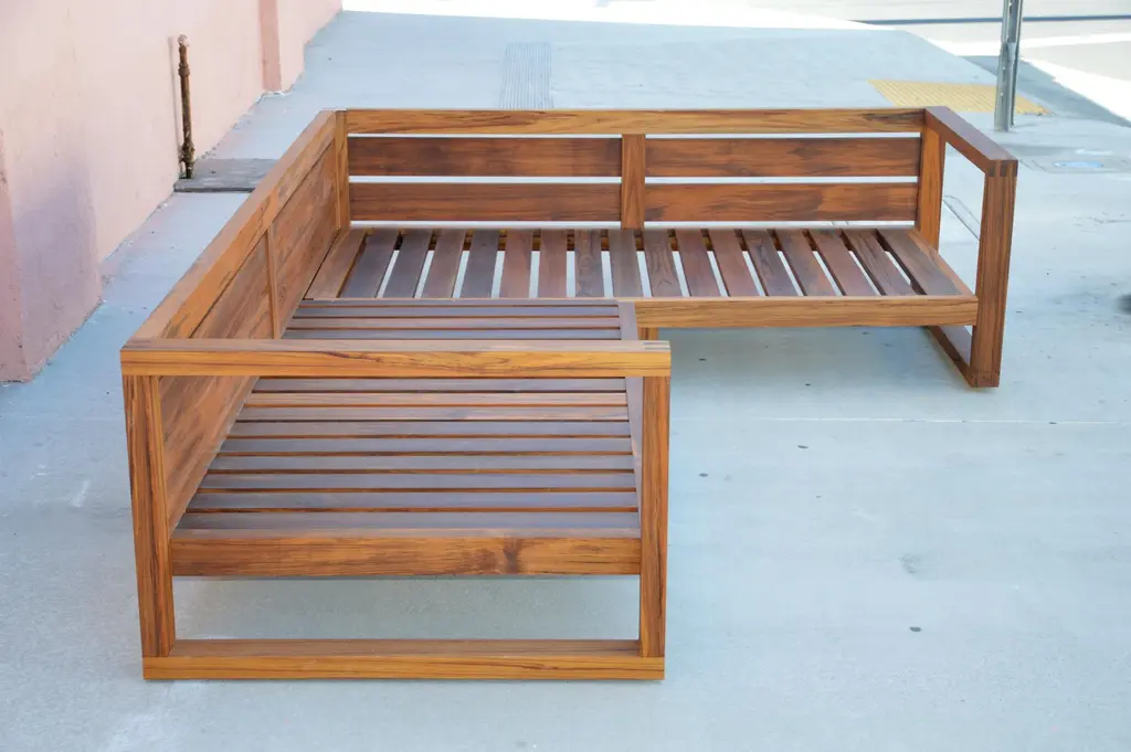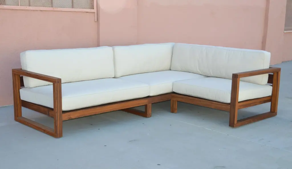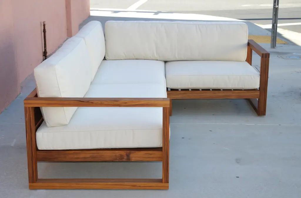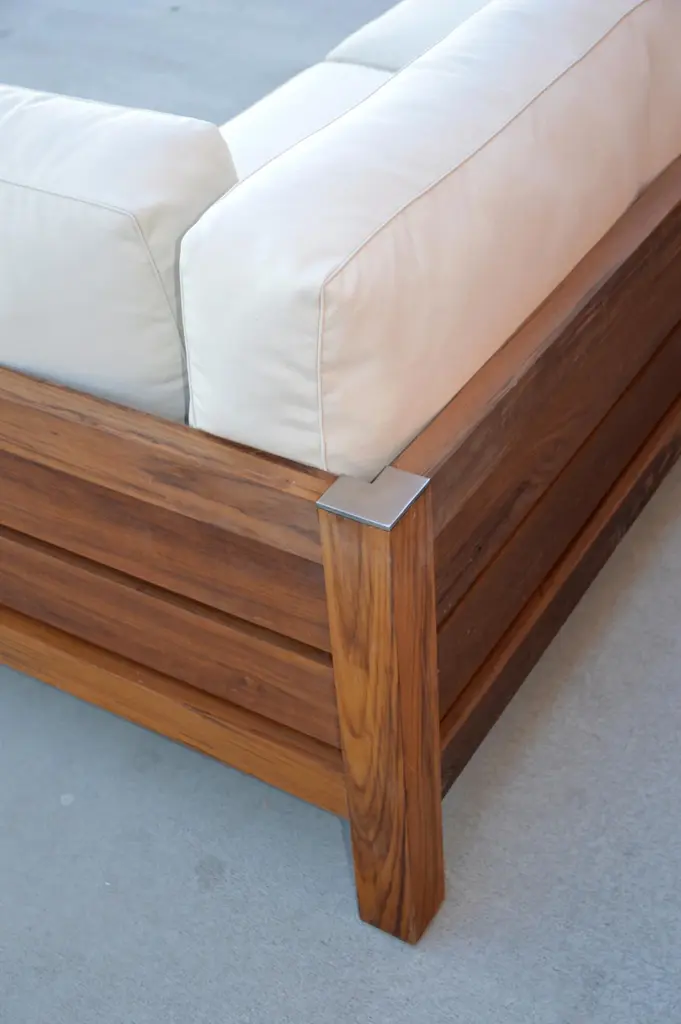 This outdoor sectional sofa can be ordered in any size. Seen here, one side measures 108" in length, the other is 77", it has a depth of 38", the overall height is 25" and the seat height is 10" with a 6" cushion on top. It can be easily taken apart for shipping/transportation by removing the stainless steel locking pin seen in photograph numbers 5 & 6. Because the frame is made from teak it is well suited for outdoor use - it can withstand direct sun, rain and snow exposure! Because each of our pieces are bench-made in our own Los Angeles workshop you can influence all aspects of design, including size, wood species, finish and upholstery. All materials used in making this sofa are of the highest quality.
