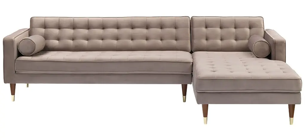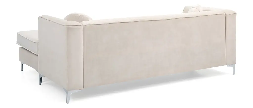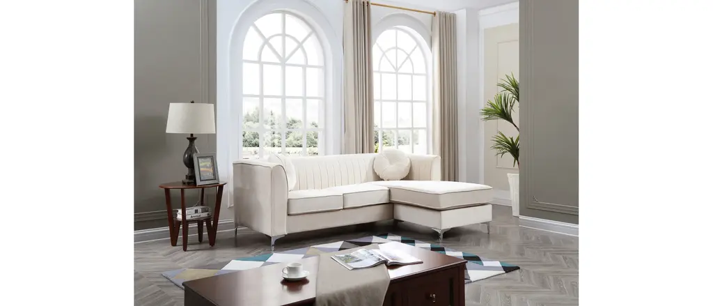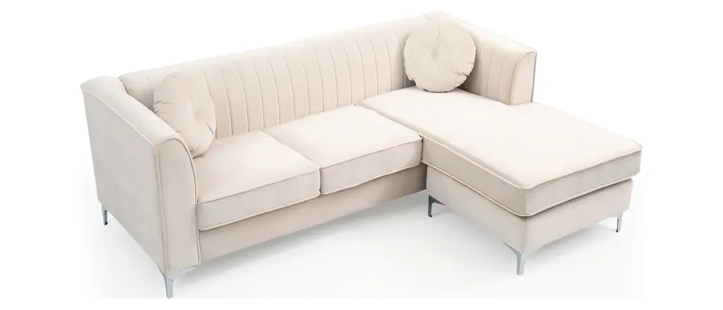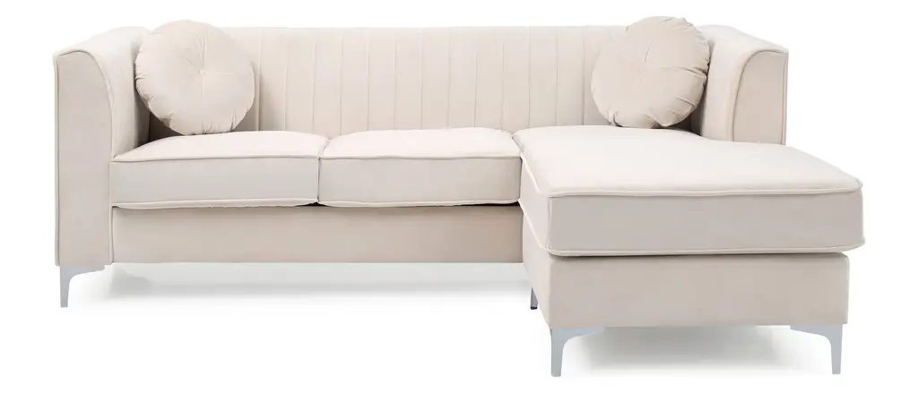Soft Velvet Channel Tufted on the Inside of the arms and Backs and Pocketed Coil Cushion Seats Make this Set Comfortable and Stylish. Nailhead trimmed and finished off with Chrome Plated Legs , It also includes Round Matching Throw Pillows. KD Design allows for EZ Delivery to any Home or Room! Choose from Sofa. Loveseat Chair Or Reversible Chaise Sectional