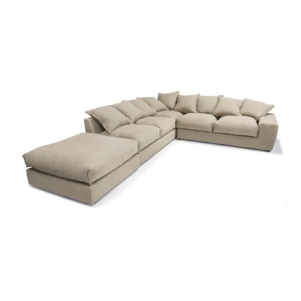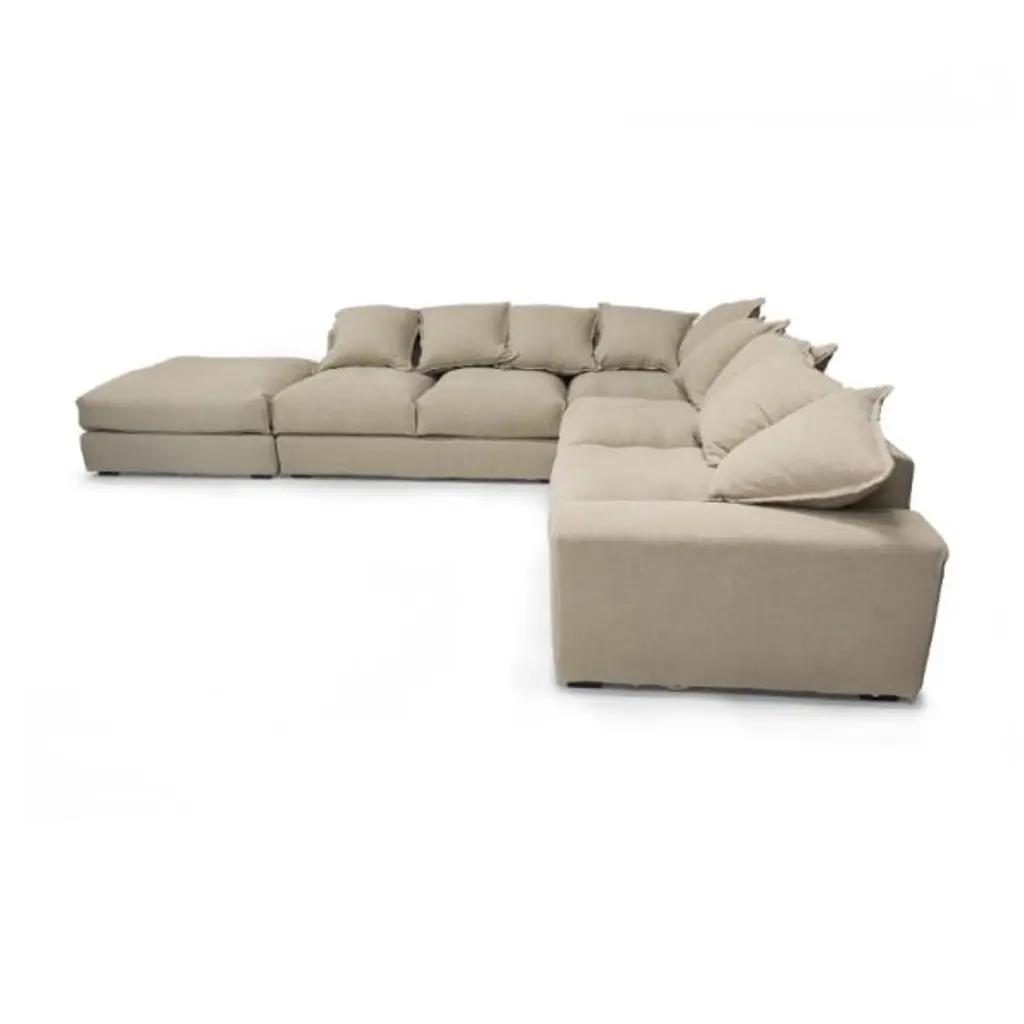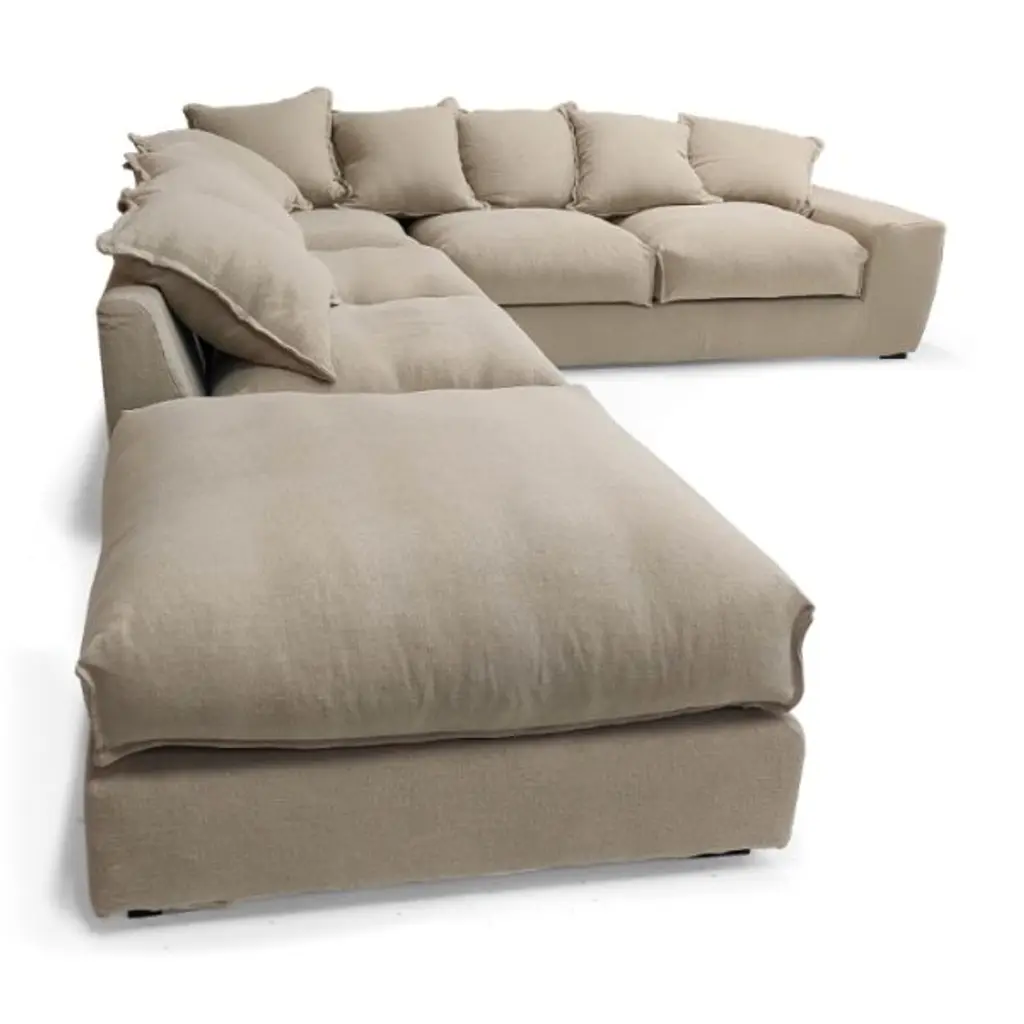 Low, oversized and plush, the Demure sectional creates an inviting space to unwind. Upholstered in 100% linen, a low deck allows plenty of room for lounging with relaxed seat and back cushions.