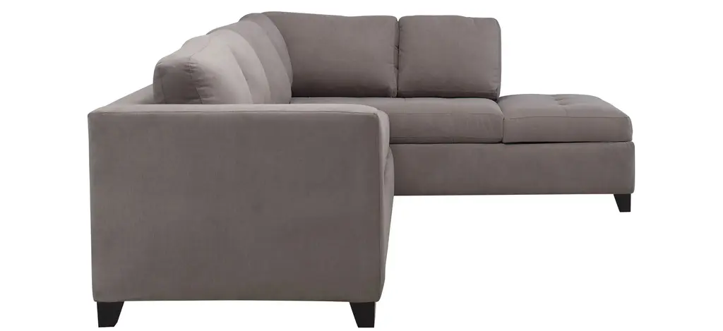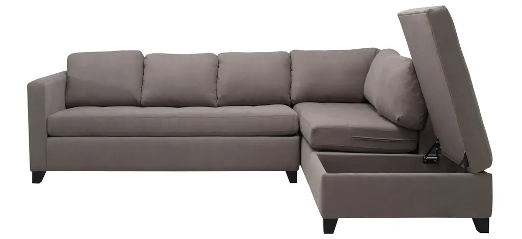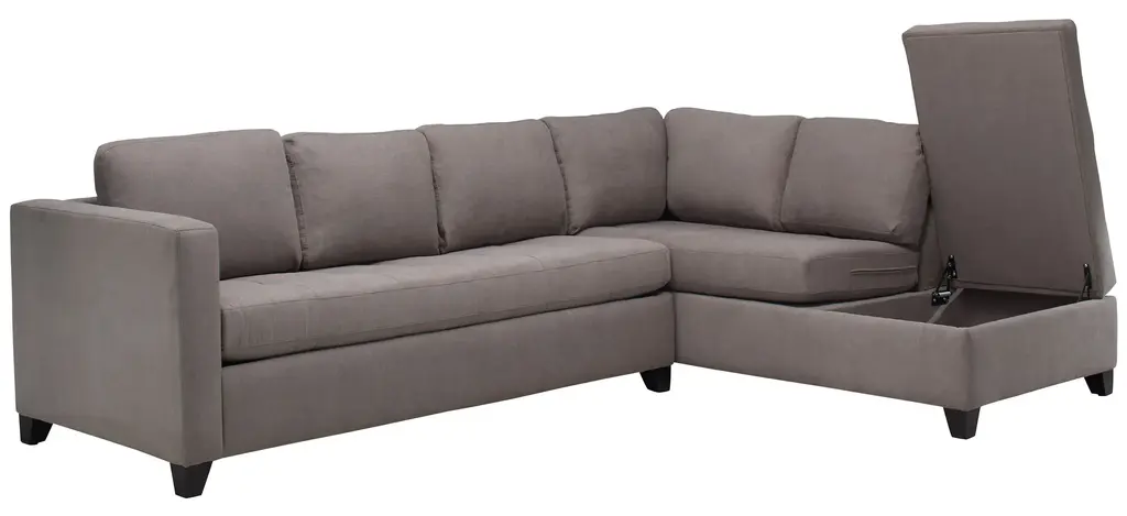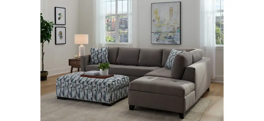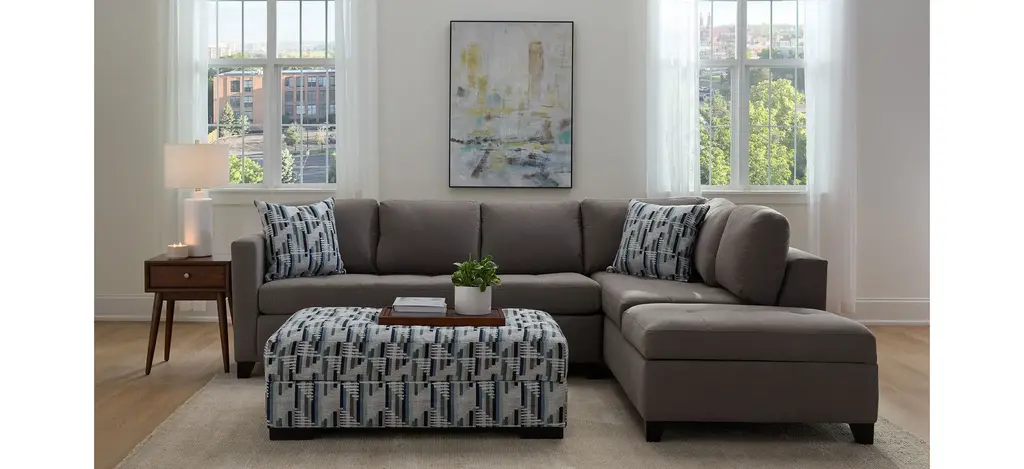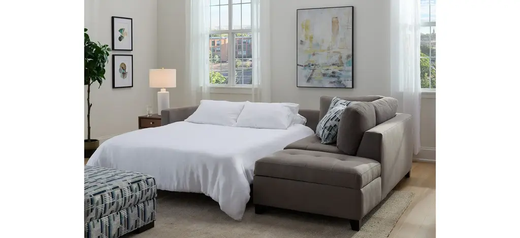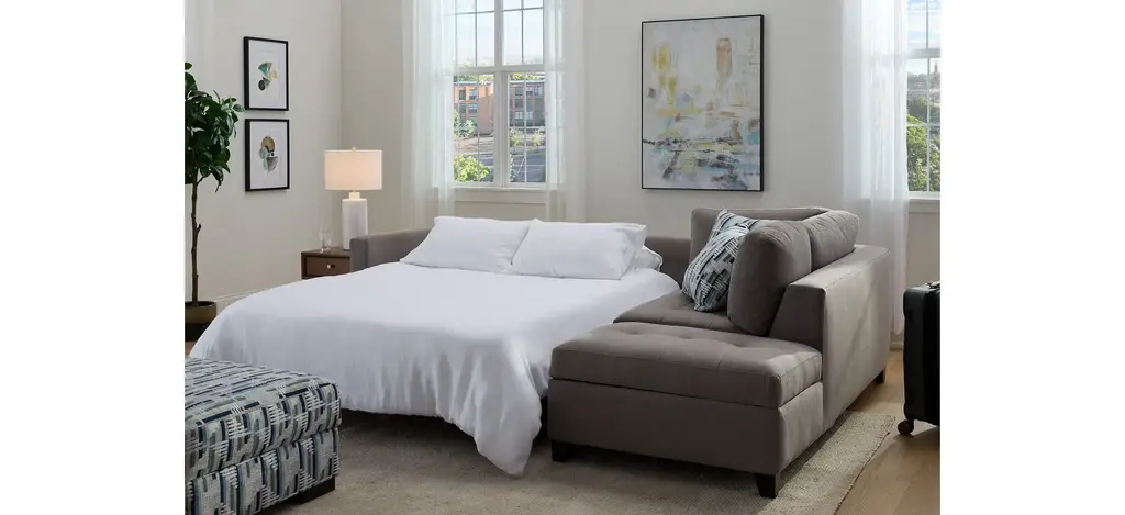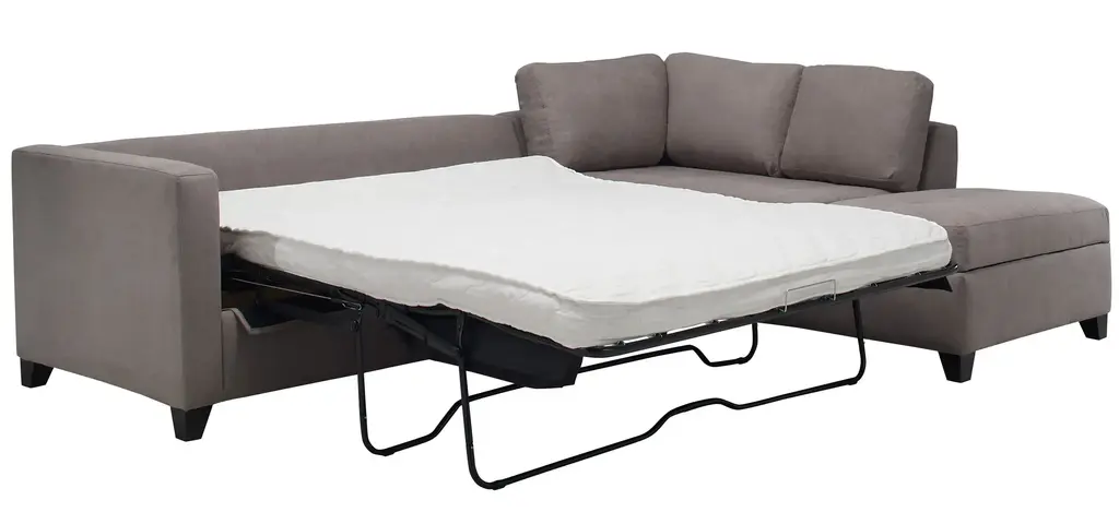 The casual appeal of the Dexter 2-pc. sofa chaise and sleeper sets an inviting backdrop for gatherings with family and friends. For overnights, guests have a memory foam mattress to call their own. The solid frame is covered in soft, durable fabric that stands up to a busy household, and it offers convenient storage too. Linear graphic accent pillows add a cool and stylish touch.