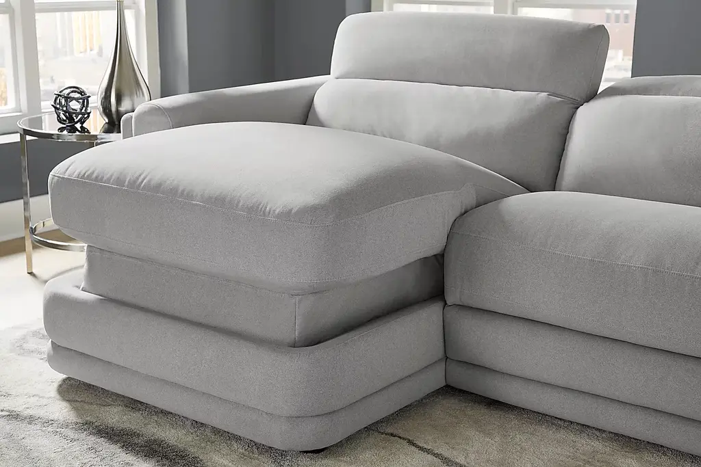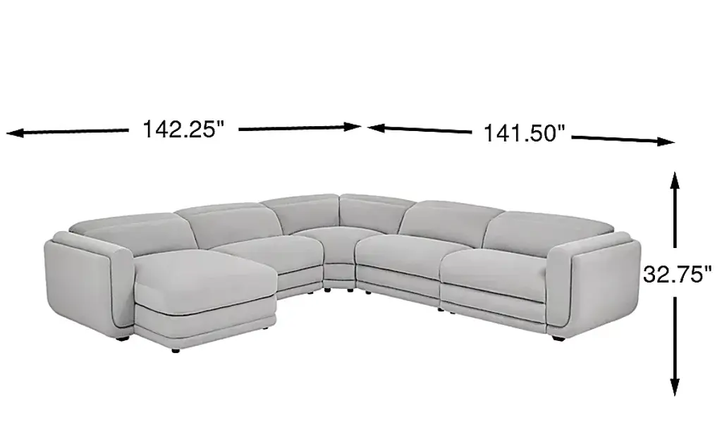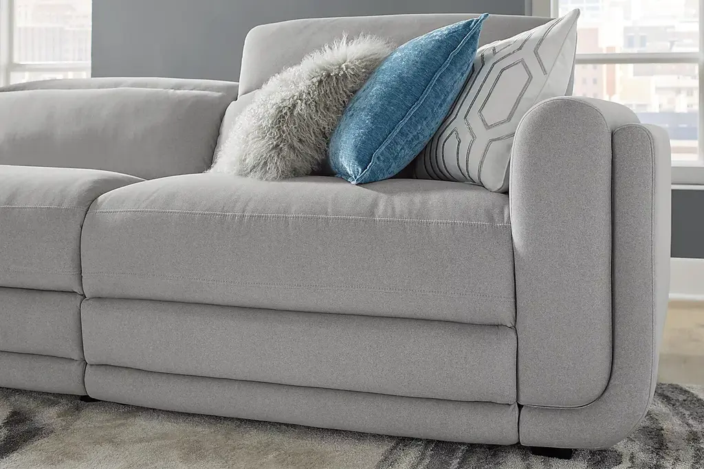 Sink-in comfort and a soothing, refined ambiance in the Drew & Jonathan Dillon sectional introduce cushy seating and personalized relaxation to achieve the ultimate marriage of form and function. Upholstered in smoky gray woven fabric with plush padding on all sides, this modern sectional feature stylish tuxedo arms and attached seat and back cushions for a sleek, sophisticated design. The dual power reclining feature allows you to customize your comfort by adjusting the head and footrest, while the chaise offers a luxurious lounging experience with its adjustable headrest and lifting footrest. The touch-button reclining panel includes a USB charging port so you can have your electronics close at hand, charged and ready to go. Includes dual power reclining LAF chaise, 2 armless chairs, corner wedge and dual power reclining RAF seat. Upholstery: 100% Polyester.