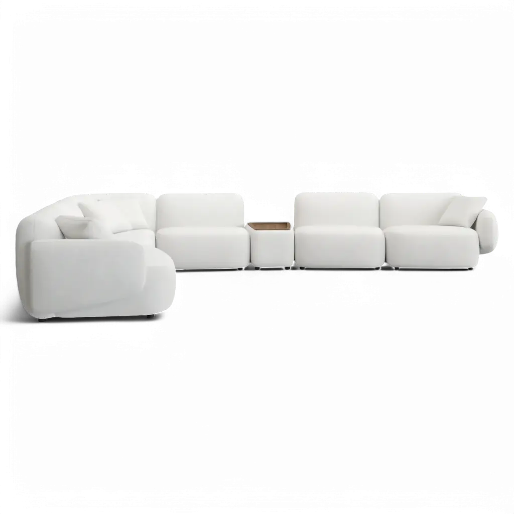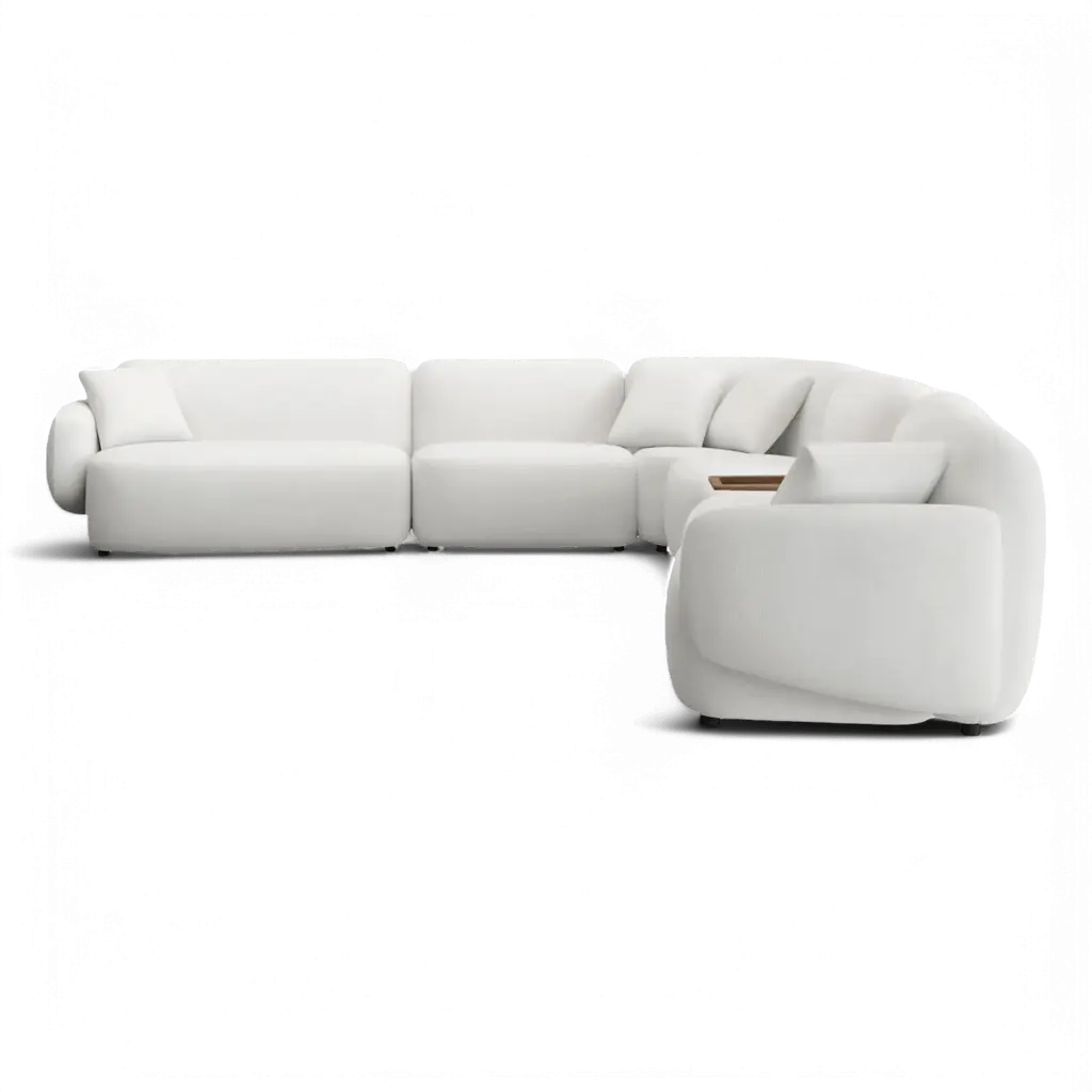 The Divano Sectional Set in Off White combines modern elegance with practical functionality. Its rounded L-shaped design and soft, curved edges create a sleek yet inviting aesthetic that complements a variety of interior styles. Upholstered in a luxurious off white fabric, this sectional exudes a clean and sophisticated look. A standout feature is its integrated console section. It's designed to double as a padded armrest with inside storage; or flip it for a convenient tabletop - perfect for placing drinks, snacks, or decor. With its blend of style, comfort, and utility, the Divano Sectional Set in Off White is an ideal centerpiece for any living room, providing ample seating for relaxation or entertaining guests. Divano Sectional Sofa Off White also available. Chenille Fabric: 100% Polyester, 20,000 Rub Count | Console with Storage: Reversible Top, Padded Armrest or Tabletop | Padding Materials: Foam | Inside Frame: Wood Materials | Legs: Wood Materials