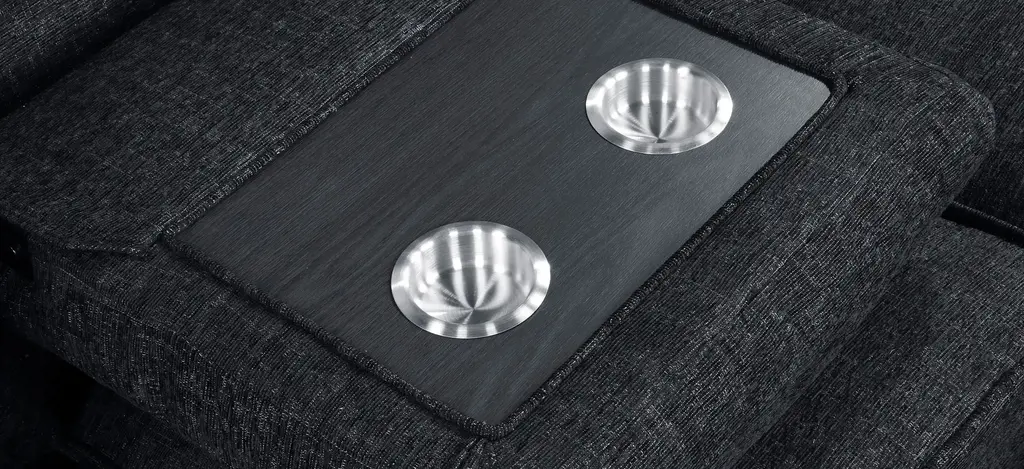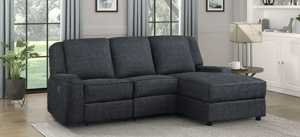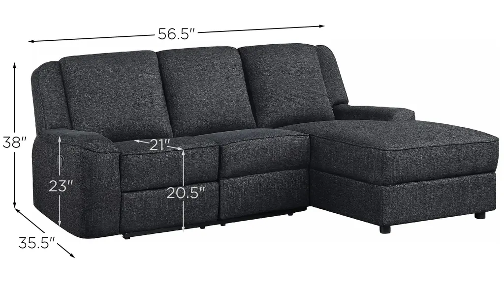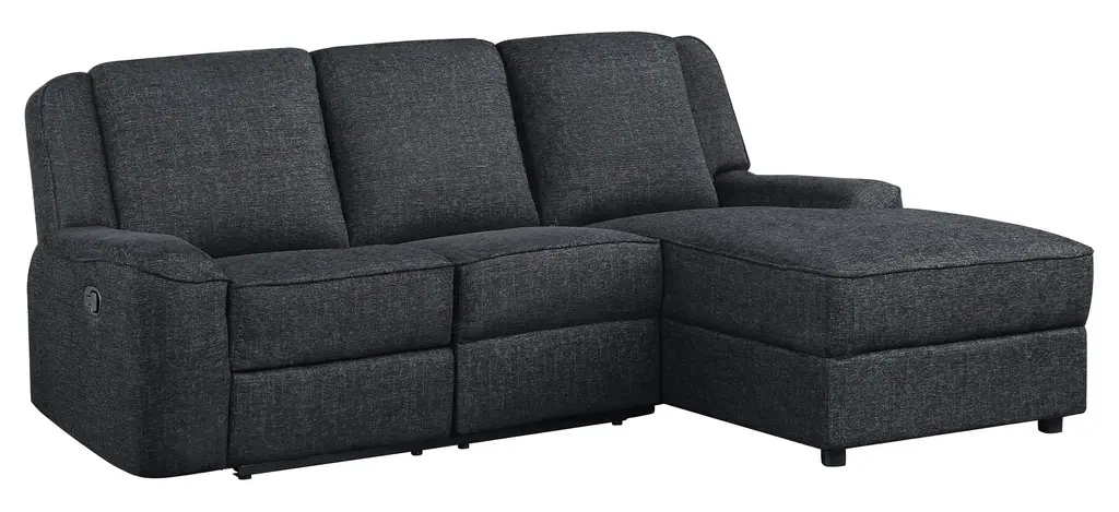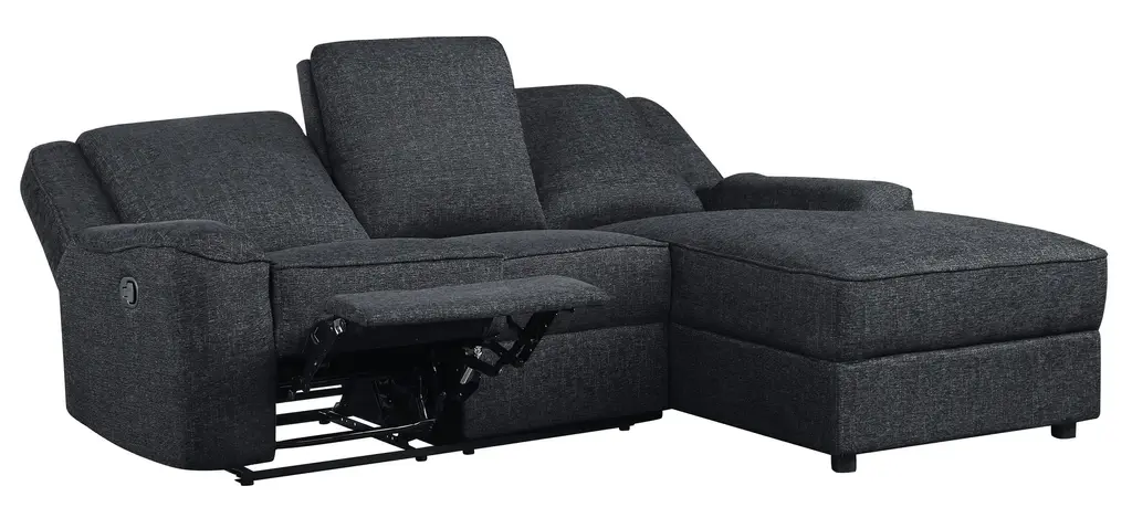 The Domino 2-pc. Reclining Sectional presents a modern seating arrangement for your home's living room, its streamlined profile and dark hue a neutral canvas for your decorative styling, and its comfort a respite from the hustle and bustle of daily life. Both the left two-seat unit and the chaise feature a manually engaged reclining function, the paired units offering a maximized opportunity to stretch out. The center seat features a drop-down back that opens to reveal two cupholders and solid surface tabletop. Ebony-hued chenille fabric upholstery covers the sectional.