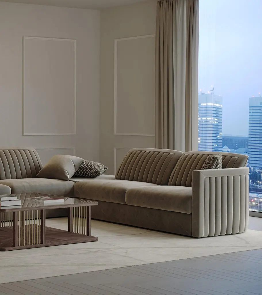 The back of the DRUMMOND sofa is highlighted by a delicate quilting thus allowing to be used also in the middle of the room. This charming sofa could easily be considered the leading character of the living room. Made of a solid wood structure, Drummond is available from the individual version to variety of sectional module options, matching the ideal shape and size, according to each project need.Upholstered in velvet, but also in leather, eco-leather, fabric or COM, combined with antique brass color plinth. Custom dimensions are available on request.Shown upholstered with Velvalpaca 04 (fabric Cat. B) with brass colored plinth.