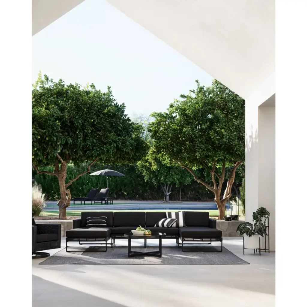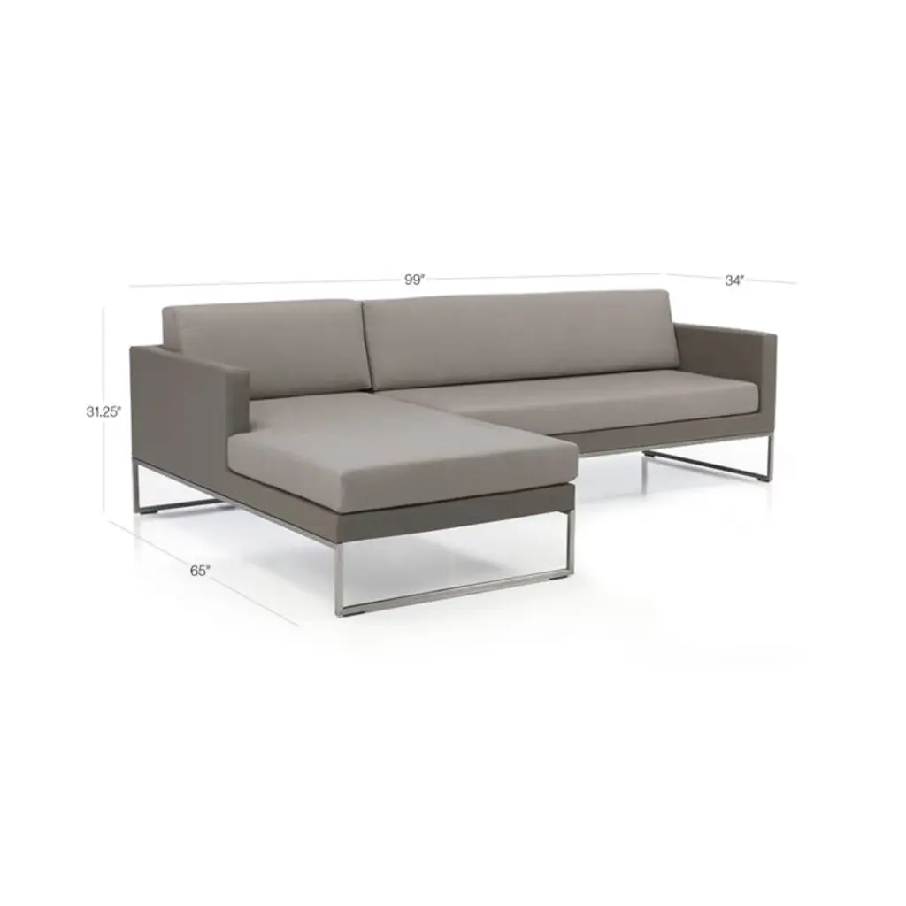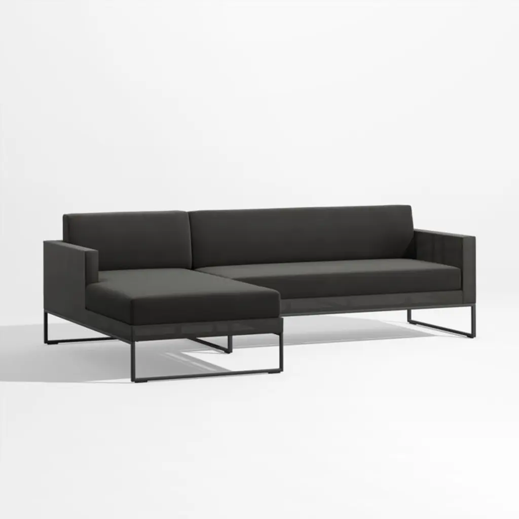 Our urban-style Dune outdoor sectional forms the centerpiece of a truly modern "indoor room" that lives outside. Creating the ultimate in lounge, the two-piece sectional unites a left-arm chaise with a right-arm loveseat. Outdoor-grade aluminum constructs the sleek linear frames cloaked in black synthetic mesh that's resistant to fading, mold, tears and stains. Custom-fitting cushions neatly tailored in black weather-resistant acrylic add a layer of comfort. The Dune black outdoor chaise sectional is a Crate & Barrel exclusive.
