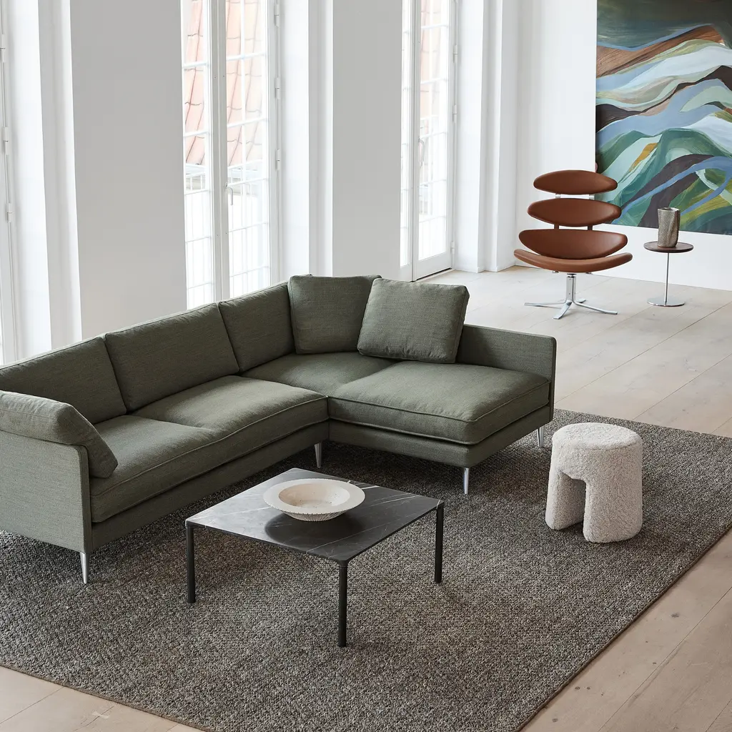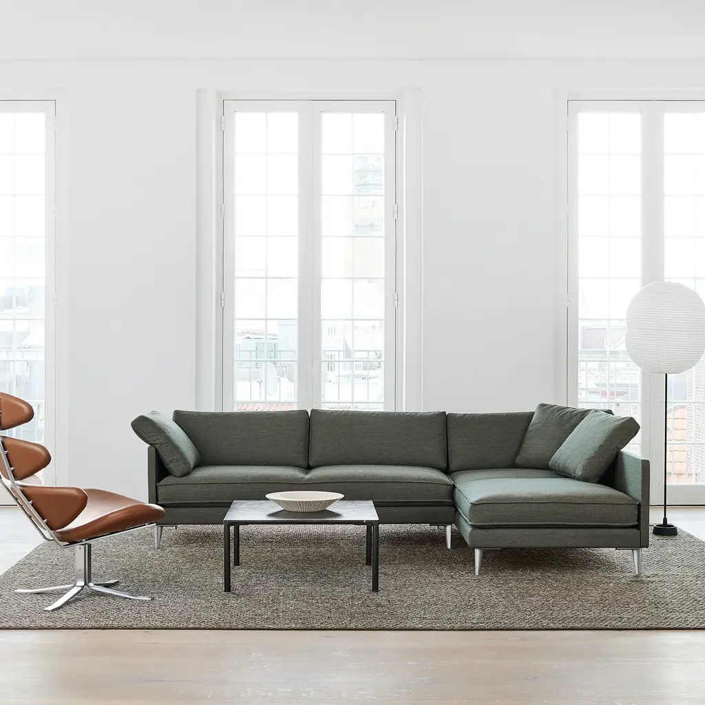 In the expansive large version, Erik Jørgensen Studio adapts its luxuriously appointed sofa-chaise EJ295. Voluminous cushions provide a high degree of comfort, and the seating hybrid makes it possible to lie down and sit in different positions. Refined upholstery details include piping at the edges along with the option of loose cushions for an added nonchalance. Placed in the center of a room or hugging a corner, the somewhat low-to-the-ground sofa rests on slender aluminum legs for a clean finish.