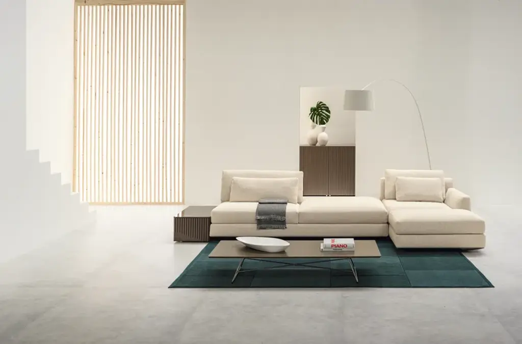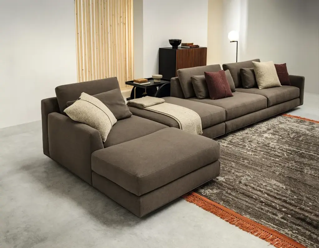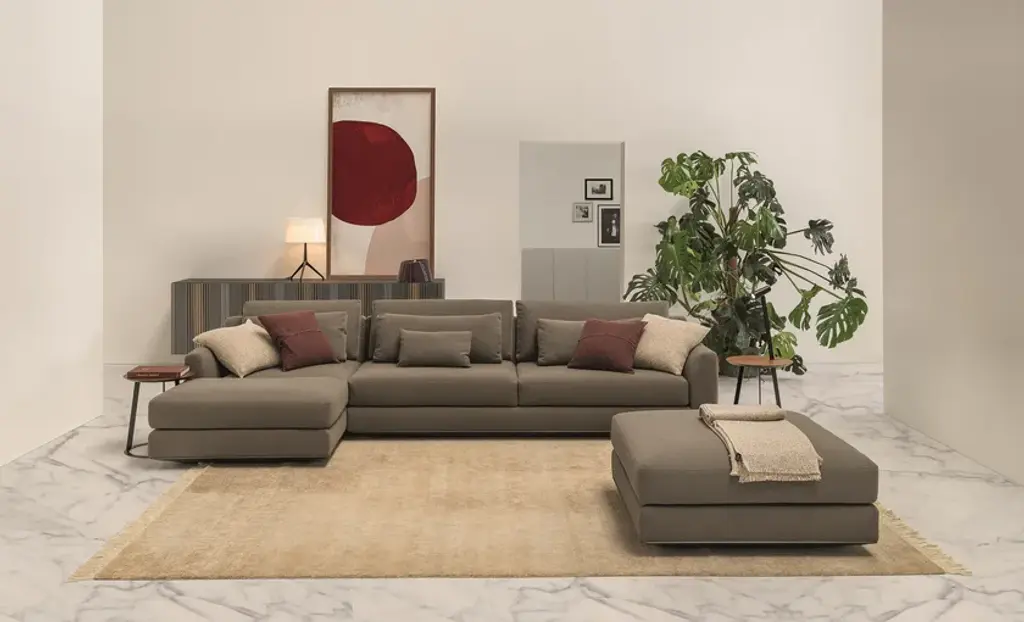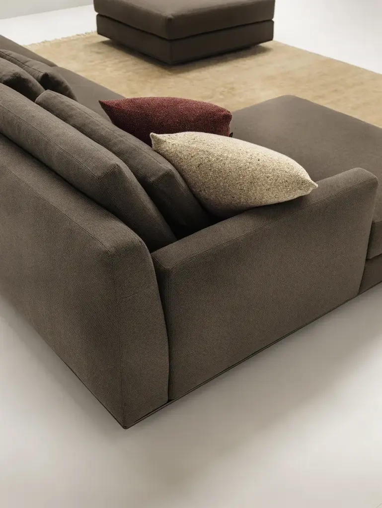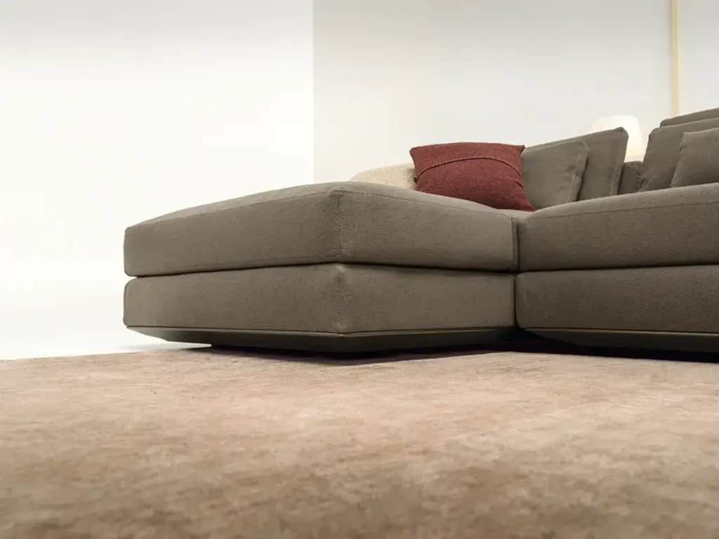 Ellington is a fabric sofa, also available in leather or eco-leather.Ellington, with its well-proportioned volumes, represents the most classic and reassuring type of sofa, only 3 cm high from the ground.Backrests and armrests structure made of solid wood and plywood covered with variable density polyurethane foam.Seat cushions in non-deformable, high-resilience, and variable density polyurethane foam. They rest on high rubber content elastic webbing inserted in the base.Back cushions with channeled goose down padding and high resilience, variable-density polyurethane foam core insert. Lumbar cushions with channeled goose down padding.To facilitate removal of the covers, the armrests and backrests can be removed from the frame by means of a quick coupling and release system.Aluminium frame and feet, finish: polished, bronze, brick