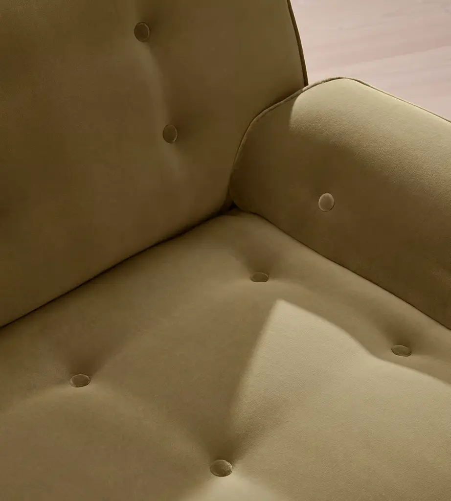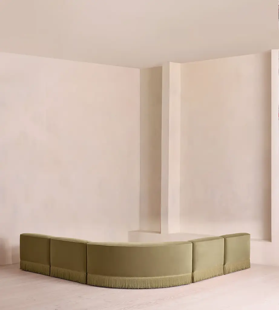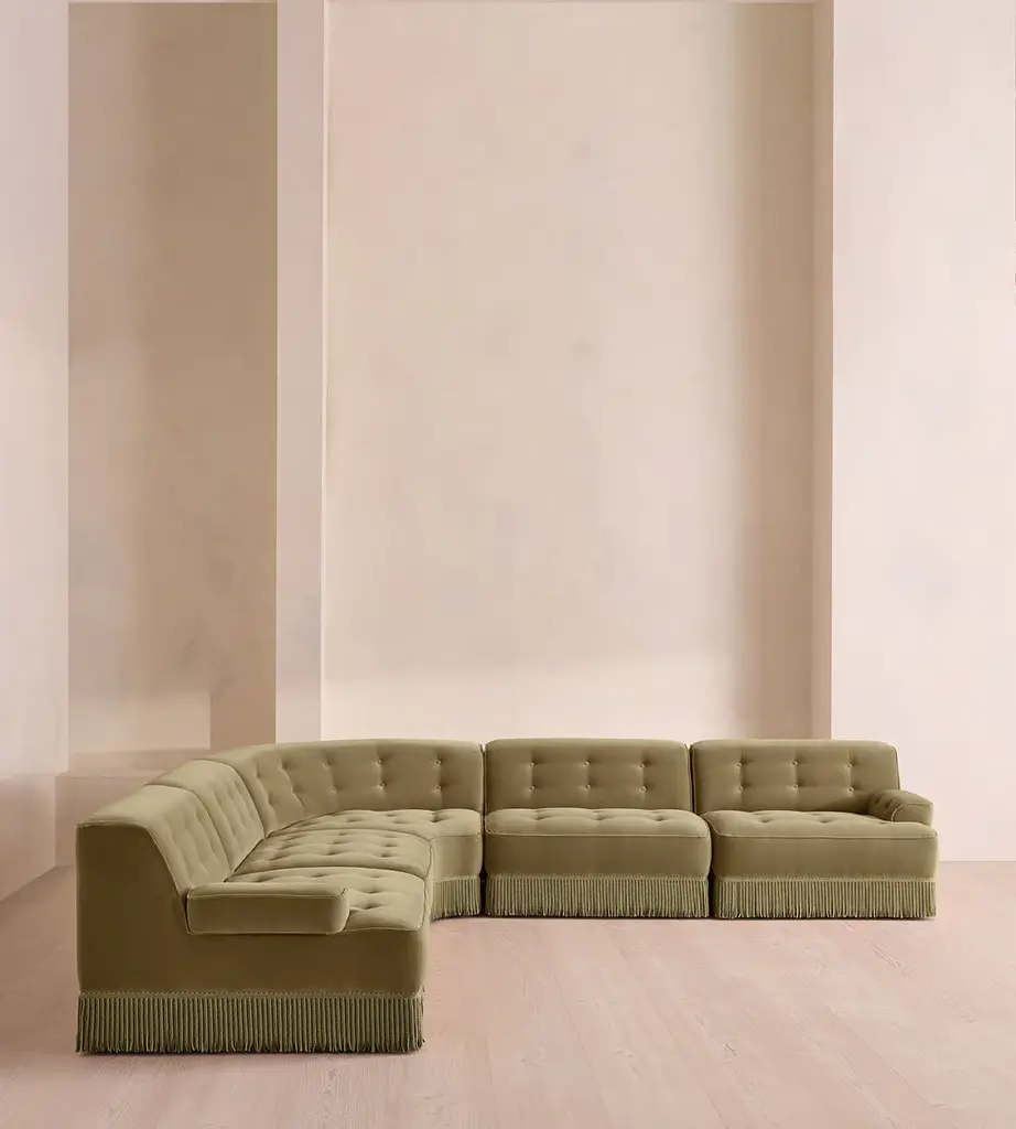 A fully upholstered sectional style with tonal fringing, piping and button detailing. Our Elowen sofa features fixed backrests and seat cushions. The tassel fringe and tufted buttons complete the velvet upholstery, which is available in a range of bespoke shades.