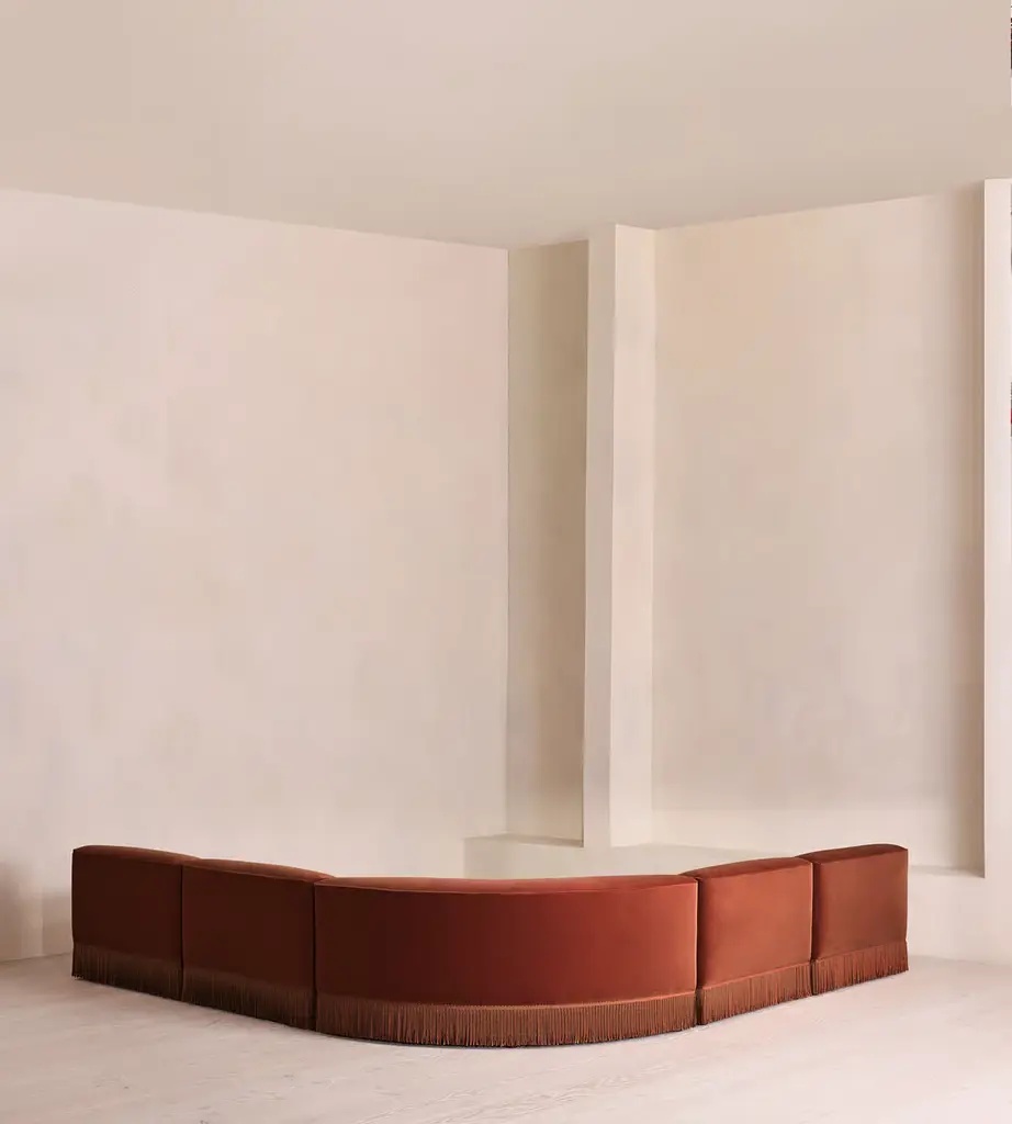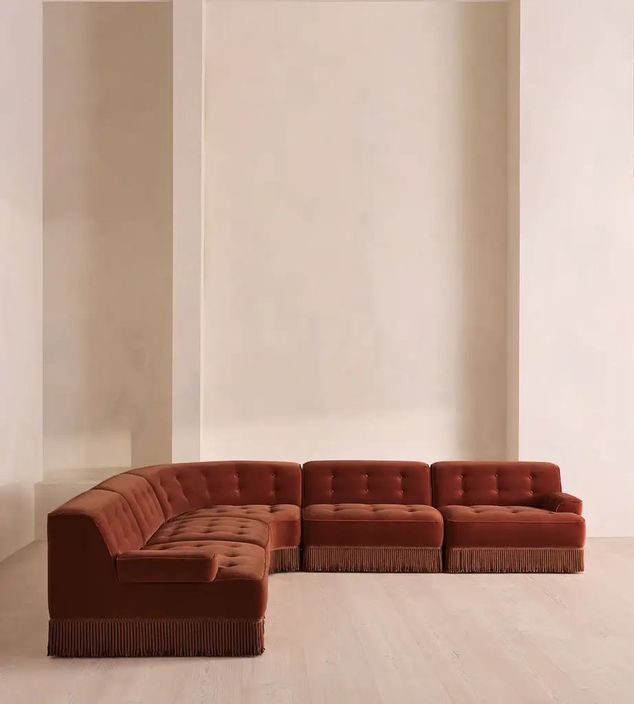 A fully upholstered sectional style with tonal fringing, piping and button detailing. Our Elowen sofa features fixed backrests and seat cushions. The tassel fringe and tufted buttons complete the velvet upholstery, which is available in a range of bespoke shades.