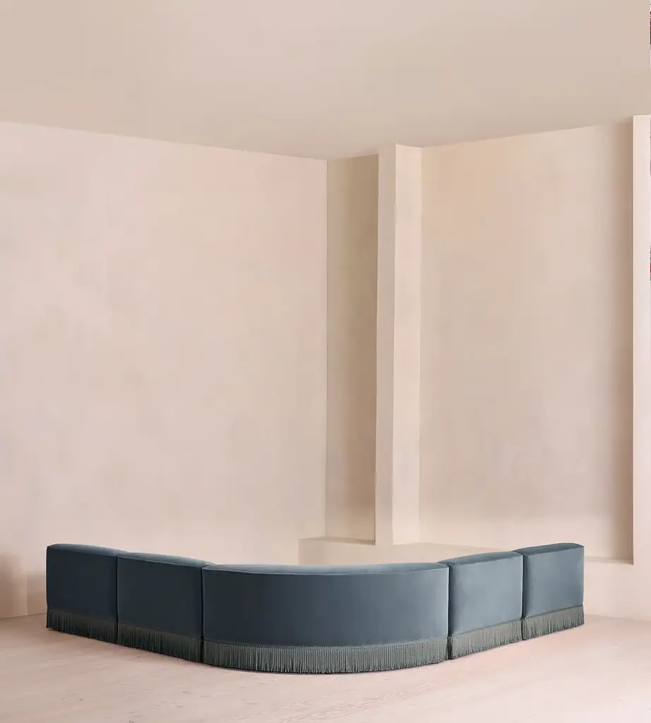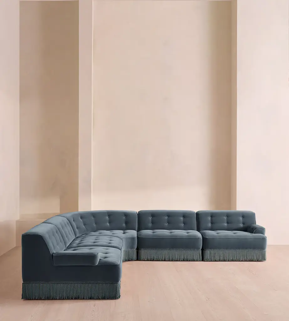 A fully upholstered sectional style with tonal fringing, piping and button detailing. Our Elowen sofa features fixed backrests and seat cushions. The tassel fringe and tufted buttons complete the velvet upholstery, which is available in a range of bespoke shades.