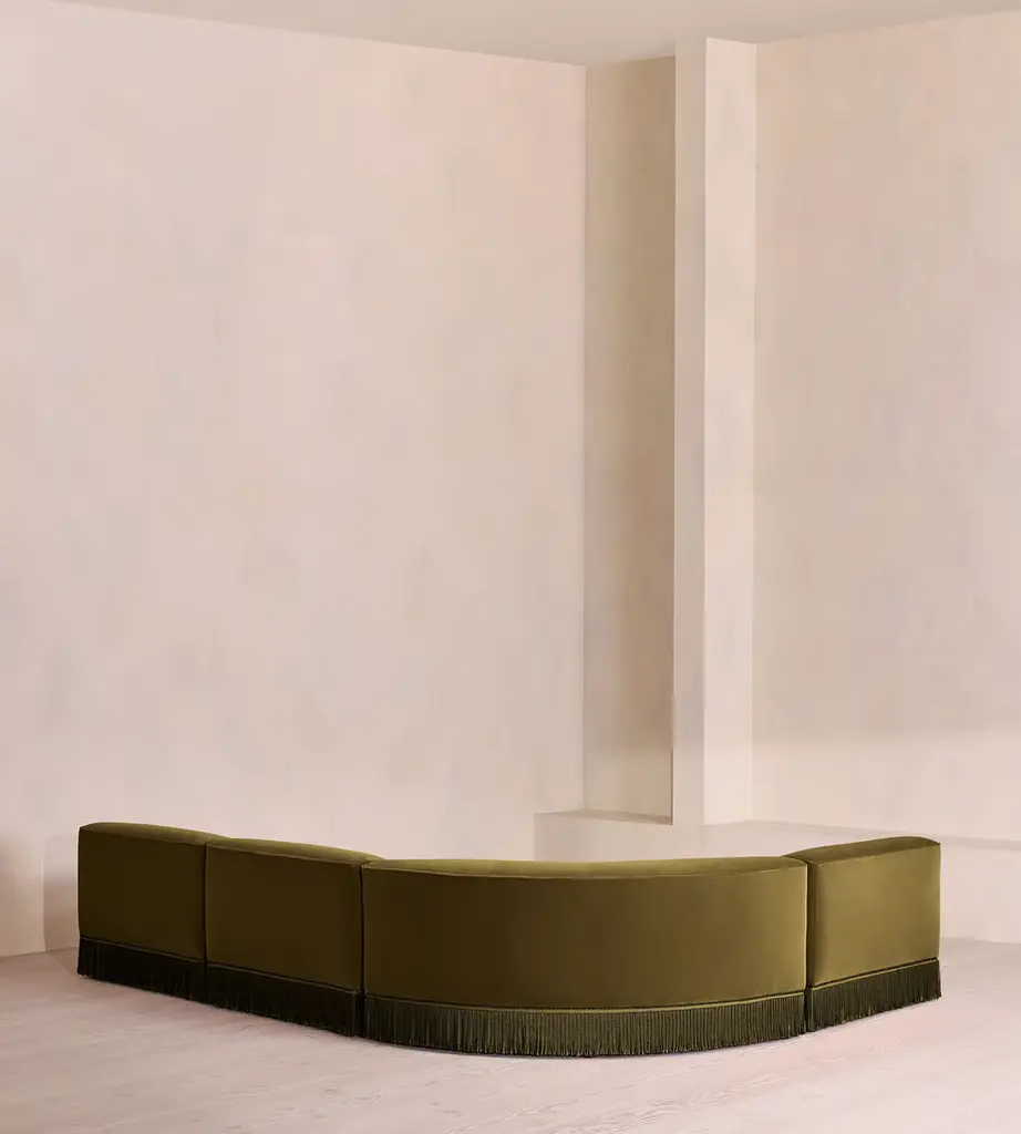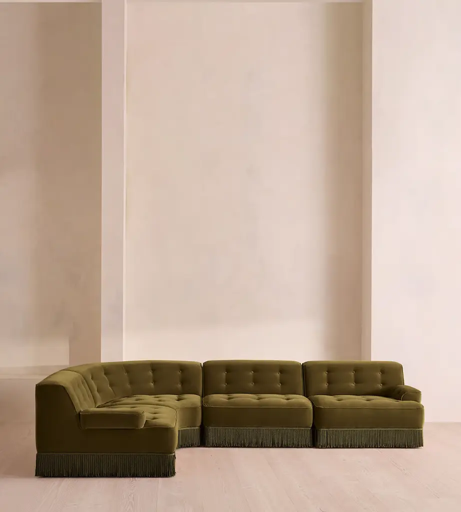 A fully upholstered sectional style with tonal fringing, piping and button detailing. Our Elowen L-shaped sofa features fixed backrests and seat cushions. The tassel fringe and tufted buttons complete the velvet upholstery, which is available in a range of bespoke shades.