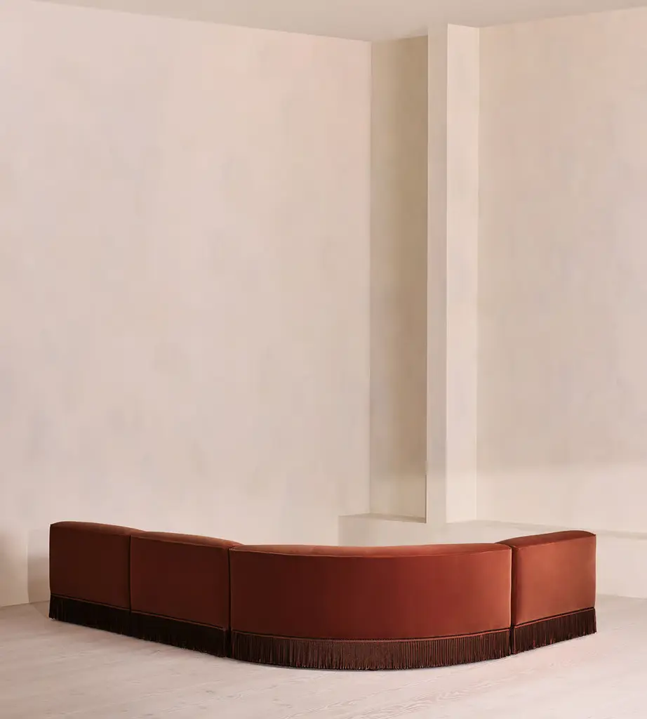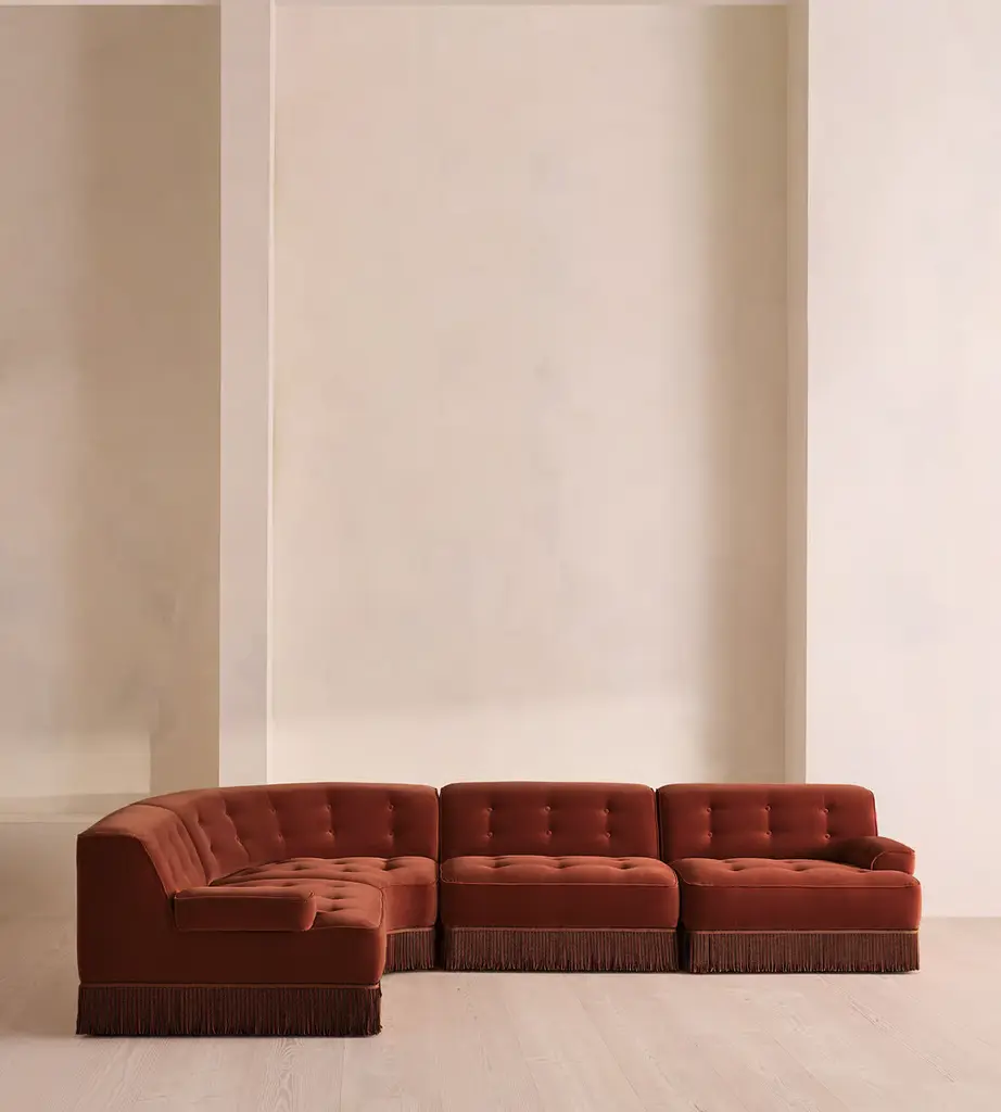 A fully upholstered sectional style with tonal fringing, piping and button detailing. Our Elowen L-shaped sofa features fixed backrests and seat cushions. The tassel fringe and tufted buttons complete the velvet upholstery, which is available in a range of bespoke shades.