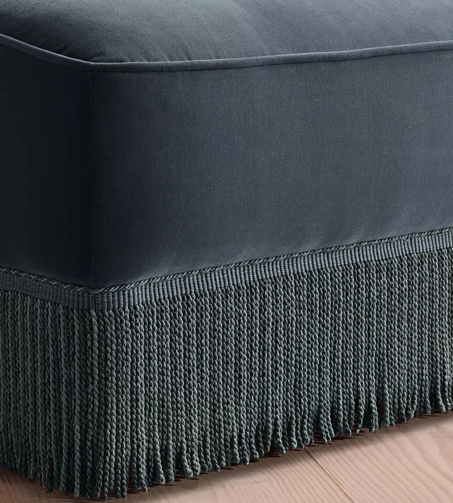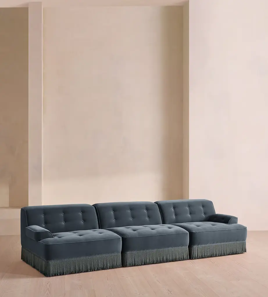 A fully upholstered sectional style with tonal fringing, piping and button detailing. Our Elowen four-seater sofa features fixed backrests and seat cushions. The tassel fringe and tufted buttons complete the velvet upholstery, which is available in a range of bespoke shades.
