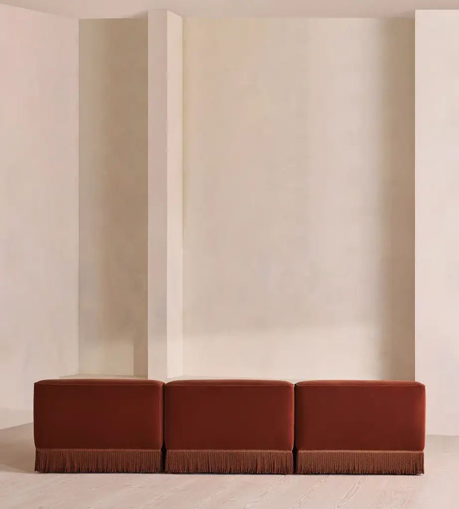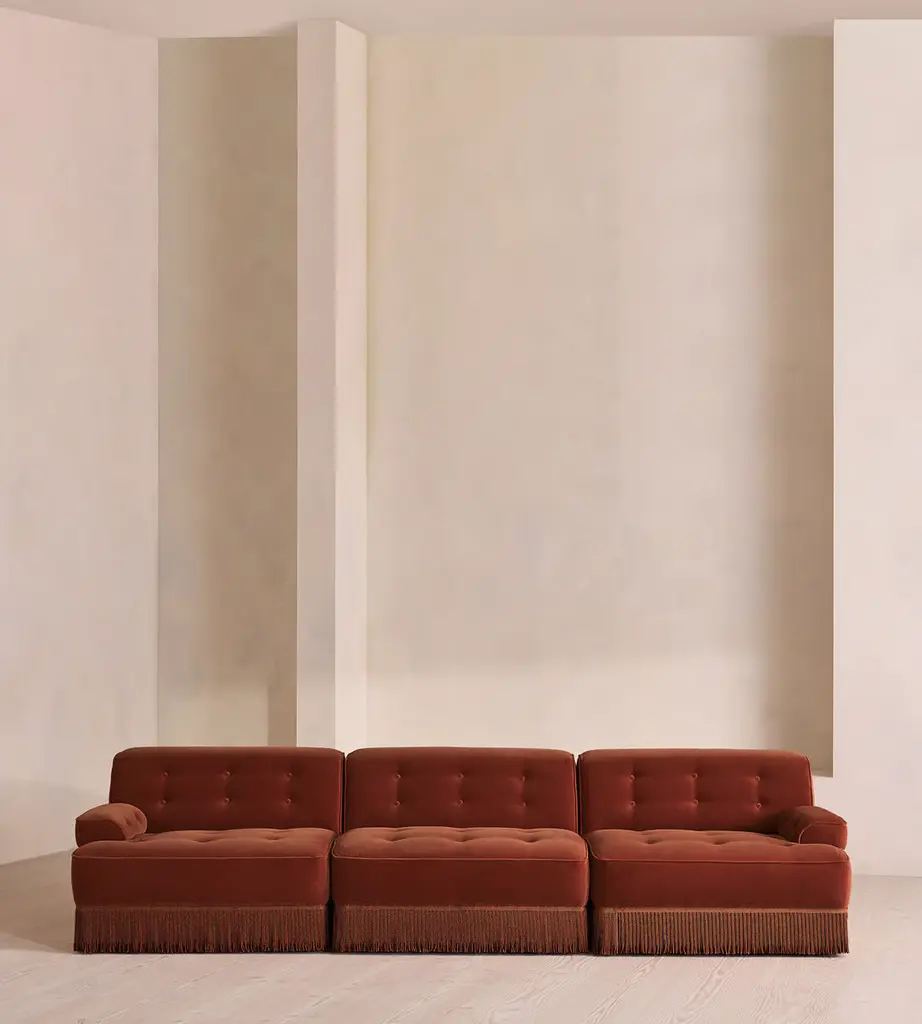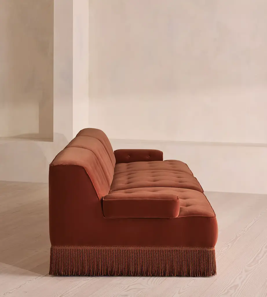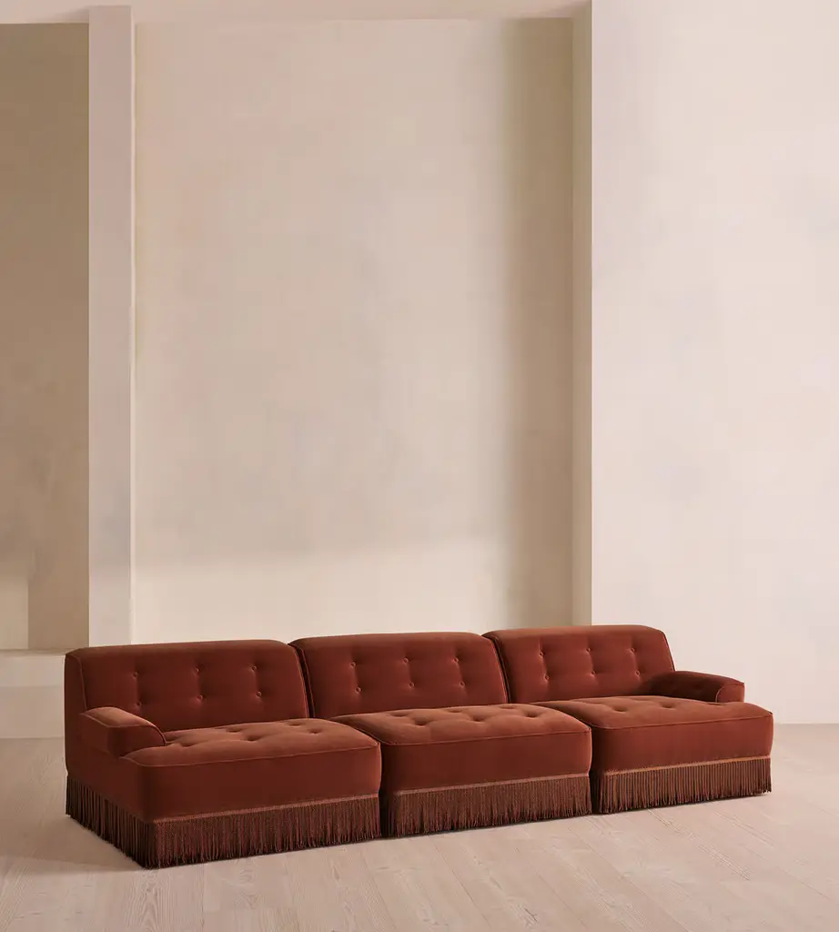 A fully upholstered sectional style with tonal fringing, piping and button detailing. Our Elowen four-seater sofa features fixed backrests and seat cushions. The tassel fringe and tufted buttons complete the velvet upholstery, which is available in a range of bespoke shades.