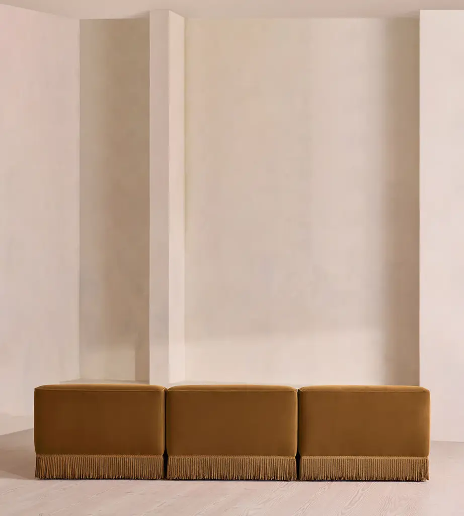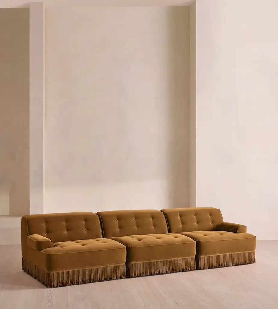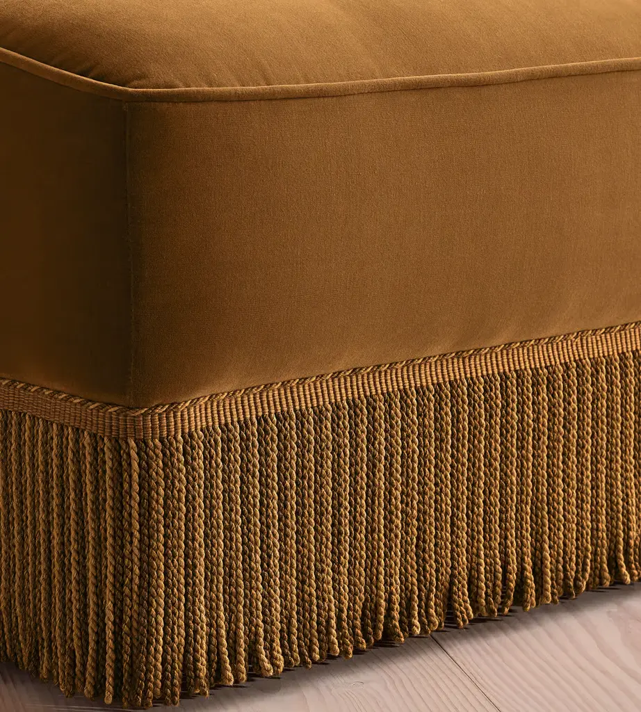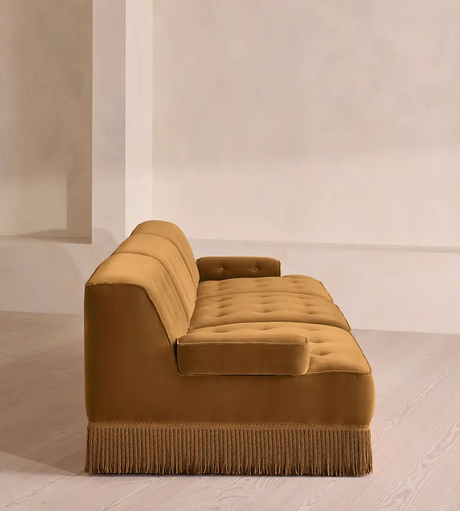 A fully upholstered sectional style with tonal fringing, piping and button detailing. Our Elowen four-seater sofa features fixed backrests and seat cushions. The tassel fringe and tufted buttons complete the velvet upholstery, which is available in a range of bespoke shades.